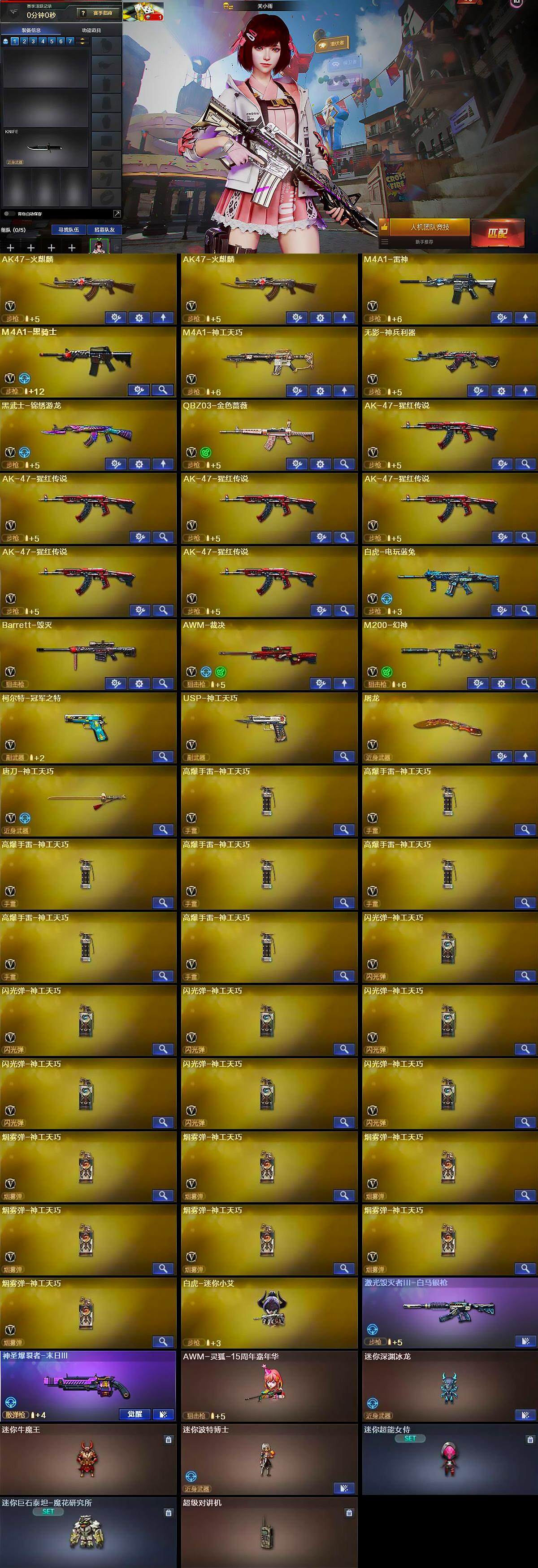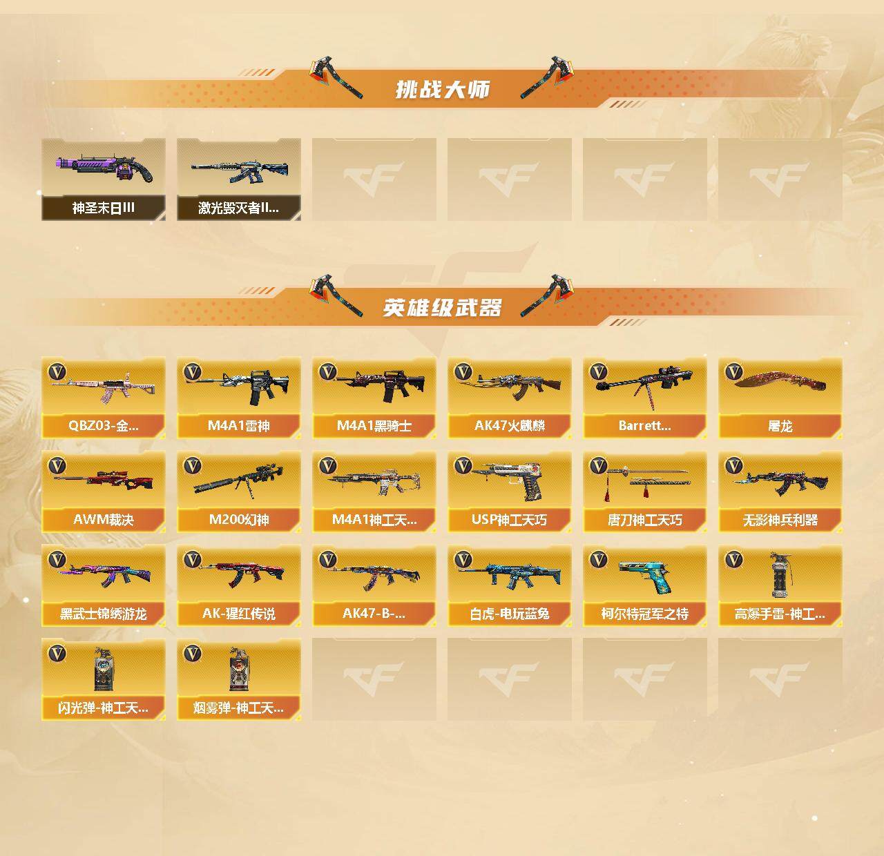 【英雄级武器】:AK47-火麒麟*2,M4A1-雷神,M4A1-黑骑士,M4A1-神工天巧,无影-神兵利器,黑武士-锦绣游龙,QBZ03-金色蔷薇,AK-47-猩红传说*6,AK47-B-战神*2,白虎-电玩蓝兔,Barrett-毁灭,AWM-裁决,M200-幻神,柯尔特-冠军之特,USP-神工天巧,屠龙,唐刀-神工天巧,高爆手雷-神工天巧*7,闪光弹-神工天巧*7,烟雾弹-神工天巧*7