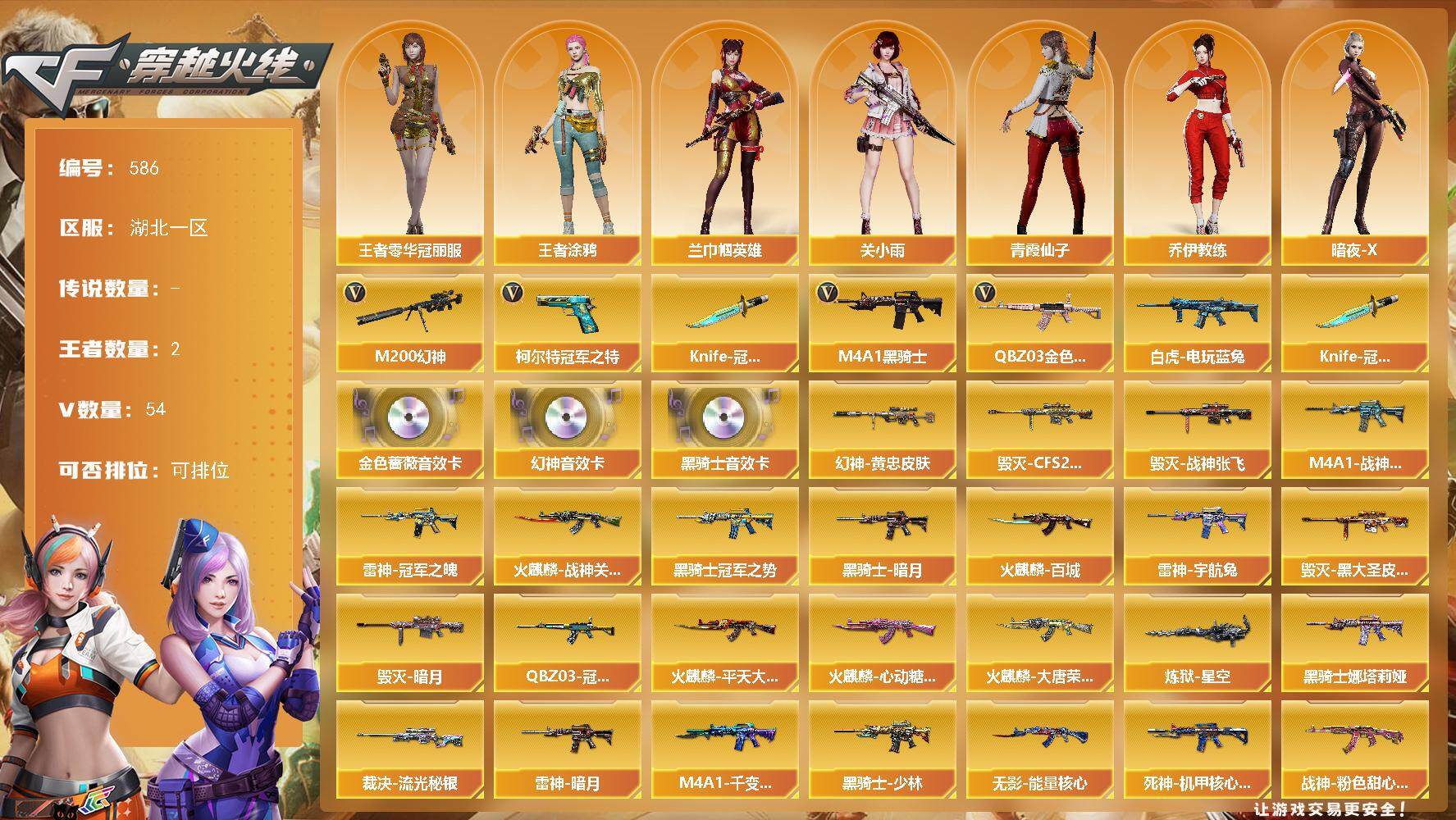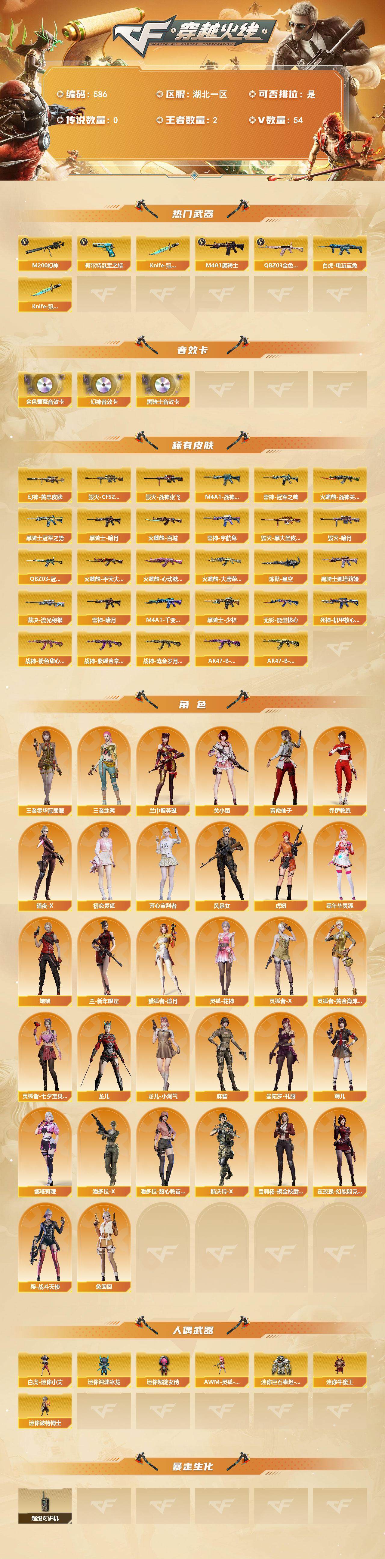 [13691452]湖北一区-54V-2王者-0炫金 【热门武器】:QBZ03-金色蔷薇,M200-幻神,白虎-电玩蓝兔,柯尔特-冠军之特,M4A1-黑骑士,Knife-冠军之刃*2 【音效卡】:M200-幻神音效卡,M4A1-黑骑士音效卡,QBZ03-金色蔷薇音效卡 【皮肤】:M200-幻神-黄忠皮肤,QBZ03-冠军之薇,裁决-流光秘银,雷神-暗月,雷神-冠军之魄,M4A1-战神赵云,雷神-宇航兔皮肤,火麒麟-战神关羽,火麒麟-平天大圣*2,火麒麟-百城,火麒麟-大唐荣光,火麒麟-心动糖果,毁灭-暗月,毁灭-CFS2020,毁灭-战神张飞,毁灭-黑大圣皮肤*2,M4A1-千变-孔明皮肤,黑骑士-暗月*2,黑骑士-冠军之势,黑骑士-少林,M4A1-黑骑士-娜塔莉娅 皮肤,无影-能量核心,死神-机甲核心皮肤,战神-粉色甜心皮肤,战神-紫绶金章皮肤,战神-流金岁月皮肤*2,AK47-B-常胜将军-曹操,AK47-B-常胜将军-孙权,炼狱-星空 【角色】:关小雨,兰-巾帼英雄,王者零-华冠丽服,王者涂鸦,乔伊教练,暗夜-X,初恋灵狐,芳心审判者,风暴女,虎妞,嘉年华灵狐,娟娟,兰-新年限定,猎狐者-追月,灵狐-花神,灵狐者-X,灵狐者-黄金海岸,灵狐者-七夕宝贝,龙儿,龙儿-小淘气,麻雀,曼陀罗-礼服,萌儿,娜塔莉娅,潘多拉-X,潘多拉-甜心教官,青霞仙子,斯沃特-X,兔囡囡,雪莉杨-摸金校尉,夜玫瑰-幻能朋克,樱-战斗天使 【人偶武器】:白虎-迷你小艾,AWM-灵狐-15周年嘉年华,迷你深渊冰龙,迷你牛魔王,迷你波特博士,迷你超能女侍,迷你巨石泰坦-魔花研究所 【暴走生化】:超级对讲机 【挑战大师】:激光毁灭者III-白马银枪,神圣爆裂者-末日III 【英雄级武器】:AK47-火麒麟*2,M4A1-雷神,M4A1-黑骑士,M4A1-神工天巧,无影-神兵利器,黑武士-锦绣游龙,QBZ03-金色蔷薇,AK-47-猩红传说*6,AK47-B-战神*2,白虎-电玩蓝兔,Barrett-毁灭,AWM-裁决,M200-幻神,柯尔特-冠军之特,USP-神工天巧,屠龙,唐刀-神工天巧,高爆手雷-神工天巧*7,闪光弹-神工天巧*7,烟雾弹-神工天巧*7 【道具】:EP战队炫彩背包,全能枪王背包,背包-洛丽塔,虎牙炫彩背包,超级背包,绿色巨人,灵魂忍者,迷雾幽灵,生化弹匣,夺命之镰,防化服*3,金色流光-