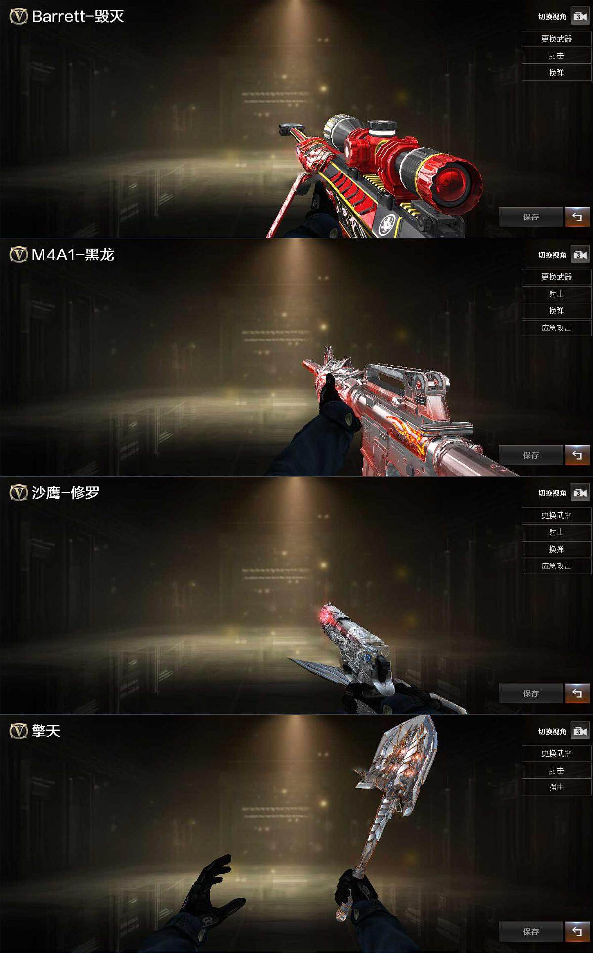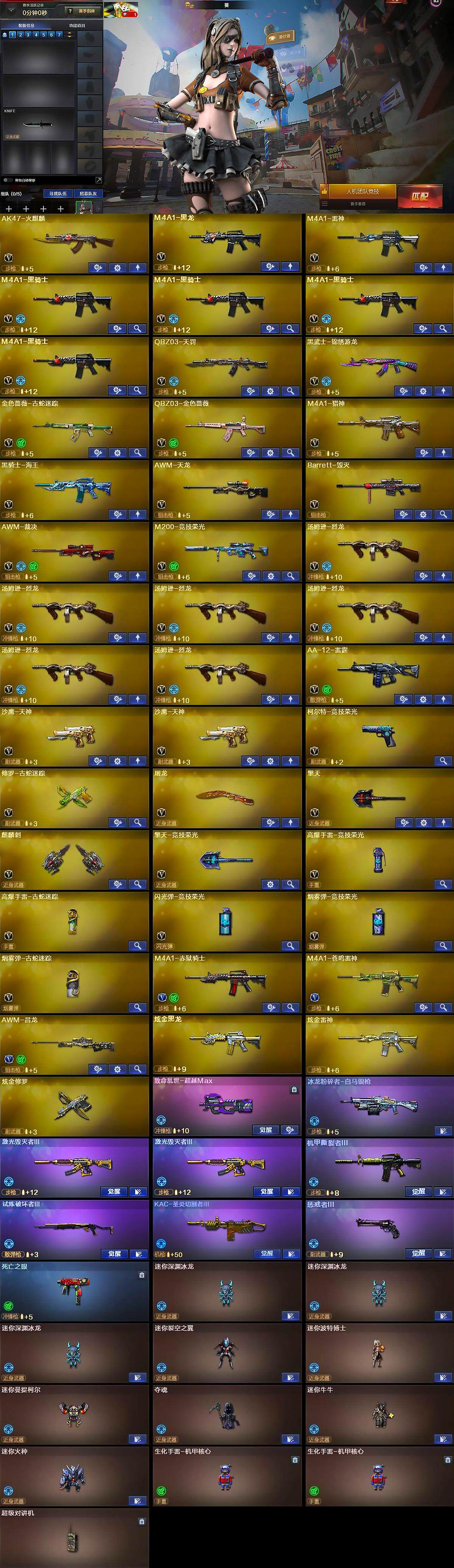 【英雄级武器】:AK47-火麒麟,M4A1-黑龙,M4A1-雷神,M4A1-黑骑士*4,QBZ03-天罚,黑武士-锦绣游龙,金色蔷薇-古蛇迷踪,QBZ03-金色蔷薇,M4A1-猎神,黑骑士-海王,AWM-天龙,Barrett-毁灭,AWM-裁决,M200-竞技荣光,汤姆逊-烈龙*6,AA-12-雷霆,沙鹰-天神*2,柯尔特-竞技荣光,修罗-古蛇迷踪,屠龙,擎天,麒麟刺,擎天-竞技荣光,高爆手雷-竞技荣光,高爆手雷-古蛇迷踪,闪光弹-竞技荣光,烟雾弹-竞技荣光,烟雾弹-古蛇迷踪,M4A1-赤狱骑士,M4A1-苍鸣雷神,AWM-昌龙