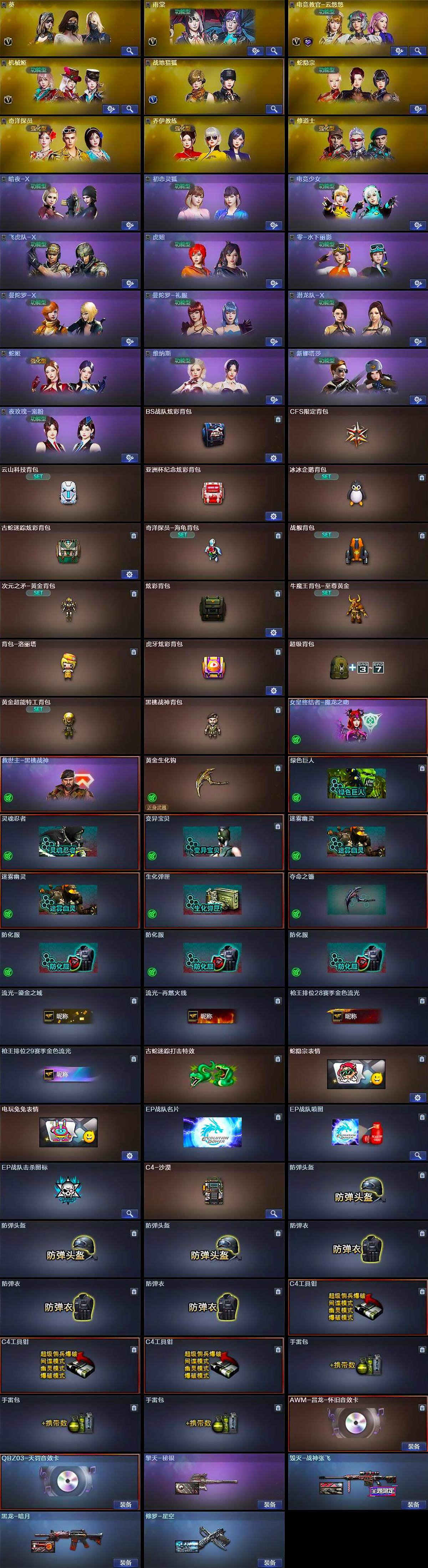 【道具】:BS战队炫彩背包,CFS限定背包,云山科技背包,亚洲杯纪念炫彩背包,冰冰企鹅背包,古蛇迷踪炫彩背包,奇洋探员-海龟背包,战舰背包,次元之矛-黄金背包,炫彩背包,牛魔王背包-至尊黄金,背包-洛丽塔,虎牙炫彩背包,超级背包,黄金超能特工背包,黑桃战神背包,女皇终结者-魔龙之吻,救世主-黑桃战神,黄金生化钩,绿色巨人,灵魂忍者,变异宝贝,迷雾幽灵*2,生化弹匣,夺命之镰,防化服*3,流光-鎏金之域,流光-再燃火线,枪王排位28赛季金色流光,枪王排位29赛季金色流光,古蛇迷踪打击特效,蛇隐宗表情,电玩兔兔