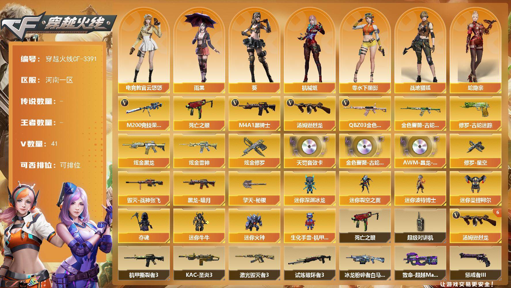 [13697652]河南一区-41V-0王者-3炫金 【热门武器】:QBZ03-金色蔷薇,金色蔷薇-古蛇迷踪,修罗-古蛇迷踪,M200-竞技荣光,死亡之眼,M4A1-黑骑士*4,汤姆逊-烈龙*6 【王者炫金武器】:炫金黑龙,炫金雷神,炫金修罗 【音效卡】:QBZ03-金色蔷薇-古蛇迷踪音效卡,QBZ03-天罚音效卡,AWM-昌龙-怀旧音效卡 【皮肤】:毁灭-战神张飞,黑龙-暗月,修罗-星空,擎天-秘银 【角色】:葵,雨棠,电竞教官-云悠悠,机械姬,战地猎狐,蛇隐宗,奇洋探员,乔伊教练,修道士,暗夜-X,初恋灵狐,电竞少女,飞虎队-X,虎妞,0号玩家,零-水下丽影,曼陀罗-X,曼陀罗-礼服,潜龙队-X,蛇姬,兔囡囡,维纳斯,新娜塔莎,夜玫瑰-宠粉 【人偶武器】:迷你深渊冰龙*3,迷你裂空之翼,迷你波特博士,迷你曼提柯尔,夺魂,迷你牛牛,迷你火种,生化手雷-机甲核心*2 【暴走生化】:死亡之眼,超级对讲机 【挑战大师】:致命乱世-超越Max,冰龙粉碎者-白马银枪,激光毁灭者III*2,机甲撕裂者III,试炼破坏者III,KAC-圣炎切割者III,惩戒者III 【英雄级武器】:AK47-火麒麟,M4A1-黑龙,M4A1-雷神,M4A1-黑骑士*4,QBZ03-天罚,黑武士-锦绣游龙,金色蔷薇-古蛇迷踪,QBZ03-金色蔷薇,M4A1-猎神,黑骑士-海王,AWM-天龙,Barrett-毁灭,AWM-裁决,M200-竞技荣光,汤姆逊-烈龙*6,AA-12-雷霆,沙鹰-天神*2,柯尔特-竞技荣光,修罗-古蛇迷踪,屠龙,擎天,麒麟刺,擎天-竞技荣光,高爆手雷-竞技荣光,高爆手雷-古蛇迷踪,闪光弹-竞技荣光,烟雾弹-竞技荣光,烟雾弹-古蛇迷踪,M4A1-赤狱骑士,M4A1-苍鸣雷神,AWM-昌龙 【道具】:BS战队炫彩背包,CFS限定背包,云山科技背包,亚洲杯纪念炫彩背包,冰冰企鹅背包,古蛇迷踪炫彩背包,奇洋探员-海龟背包,战舰背包,次元之矛-黄金背包,炫彩背包,牛魔王背包-至尊黄金,背包-洛丽塔,虎牙炫彩背包,超级背包,黄金超能特工背包,黑桃战神背包,女皇终结者-魔龙之吻,救世主-黑桃战神,黄金生化钩,绿色巨人,灵魂忍者,变异宝贝,迷雾幽灵*2,生化弹匣,夺命之镰,防化服*3,流光-鎏金之域,流光-再燃火线,枪王排位28赛季金色流光,枪王排位29赛季金色流光,古蛇迷踪打击特效,蛇隐宗表情,电玩兔兔