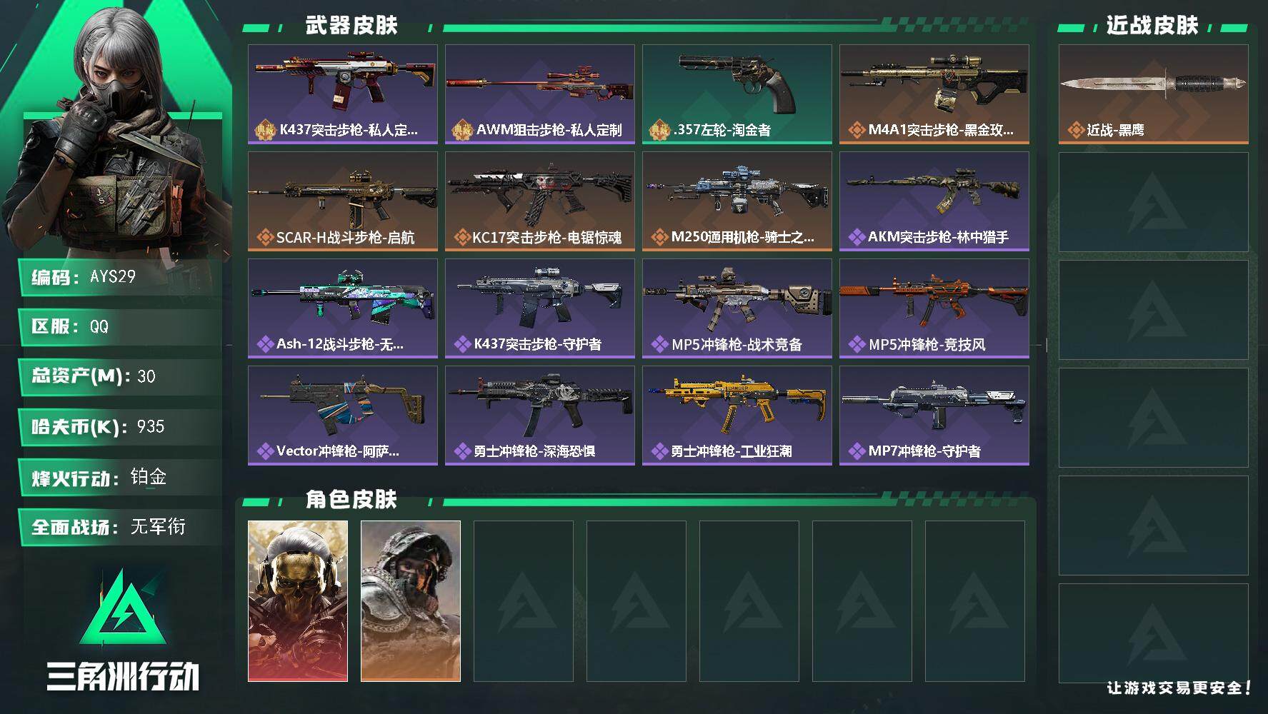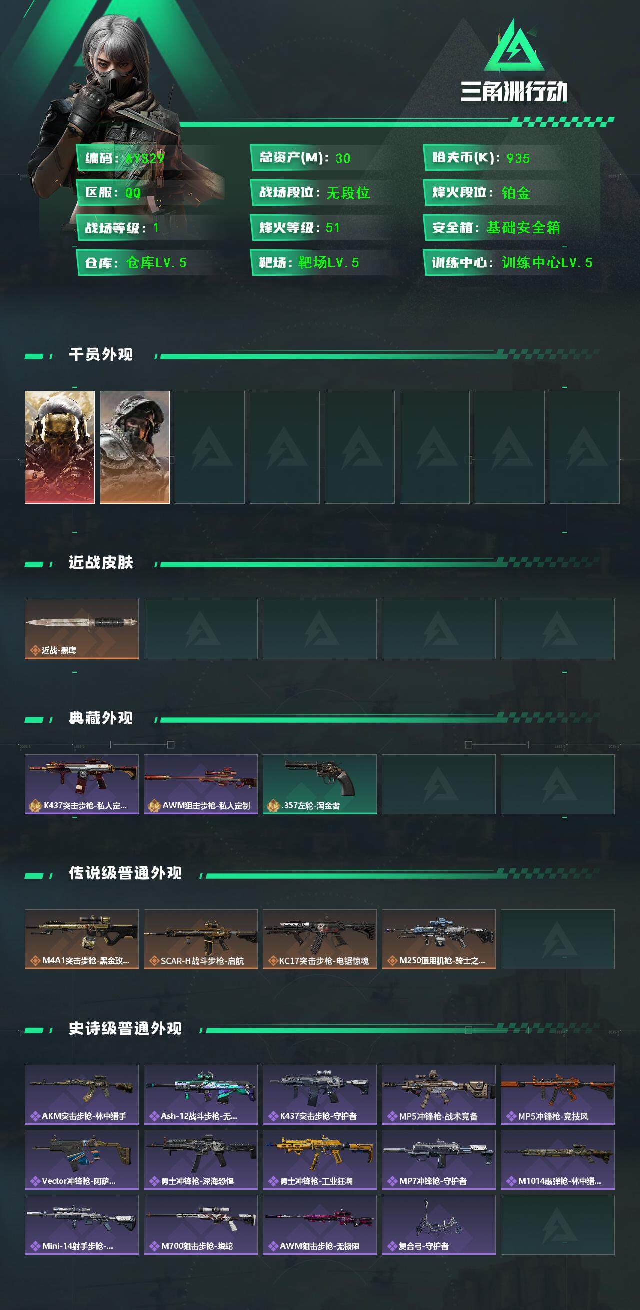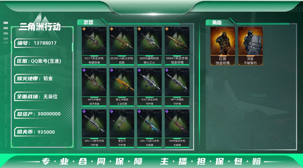 [13788017]【店主推荐捡漏号!可直接换绑】29.5m总资产 935k哈伏币-24m流动资产-51烽火等级-铂金-1战场等级-无军衔 【干员外观】:红狼-蚀金玫瑰,深蓝-不破誓约 【近战皮肤】:近战-黑鹰 【典藏外观】:K437突击步枪-私人定制,AWM狙击步枪-私人定制,.357左轮-淘金者 【传说级普通外观】:M4A1突击步枪-蚀金玫瑰,SCAR-H战斗步枪-启航,KC17突击步枪-电锯惊魂,M250通用机枪-骑士之心 【史诗级普通外观】:AKM突击步枪-林中猎手,ASh-12战斗步枪-无极限,K437突击步枪-守护者,MP5冲锋枪-战术竞备,MP5冲锋枪-竞技风,Vector冲锋枪-阿萨拉文明,勇士冲锋枪-深海恐惧,勇士冲锋枪-工业狂潮,MP7冲锋枪-守护者,M1014霰弹枪-林中猎手,Mini-14射手步枪-守护者,M700狙击步枪-蝮蛇,AWM狙击步枪-无极限,复合弓-守护者 【稀有级普通外观】:M4A1突击步枪-零点,K416突击步枪-碳纤维,AK-12突击步枪-零点,SCAR-H战斗步枪-荣耀列队,MP5冲锋枪-弄臣,P90冲锋枪-浅鲨小队,Vector冲锋枪-先锋,SMG-45-行动开启,SMG-45冲锋枪-幻影结构,MP7冲锋枪-幻影结构,M1014霰弹枪-碳纤维,M1014霰弹枪-幻影结构,SVD狙击步枪-战术行动,SR-25射手步枪-开拓,SV-98狙击步枪-星链科技,G18-星链科技 【普通级普通外观】:M4A1突击步枪-粉色涂装,M4A1突击步枪-高雅黑,QBZ95-1突击步枪-高雅黑,QBZ95-1突击步枪-海浪,QBZ95-1突击步枪-海色,AUG突击步枪-浅蓝涂装,SG552突击步枪-浅蓝涂装,SG552突击步枪-海浪,MP5冲锋枪-海色,Vector冲锋枪-几何迷彩,UZI冲锋枪-海色,M1014霰弹枪-高雅黑,SR-25射手步枪-黄蜂,SV-98狙击步枪-红色涂装,M1911-坚固材料 【军牌】:军牌-猫咪,军牌-展示,军牌-享受音乐,军牌-永恒,军牌-修整,军牌-神秘艺术,军牌-信誉优秀 【挂饰】:挂饰-统统拿走,挂饰-维什戴尔,挂饰-蚀金玫瑰,挂饰-重装记者,挂饰-演出导演,挂饰-诡影狙击兵,挂饰-诡影喷火兵,挂饰-启程,挂饰-乐队纪念