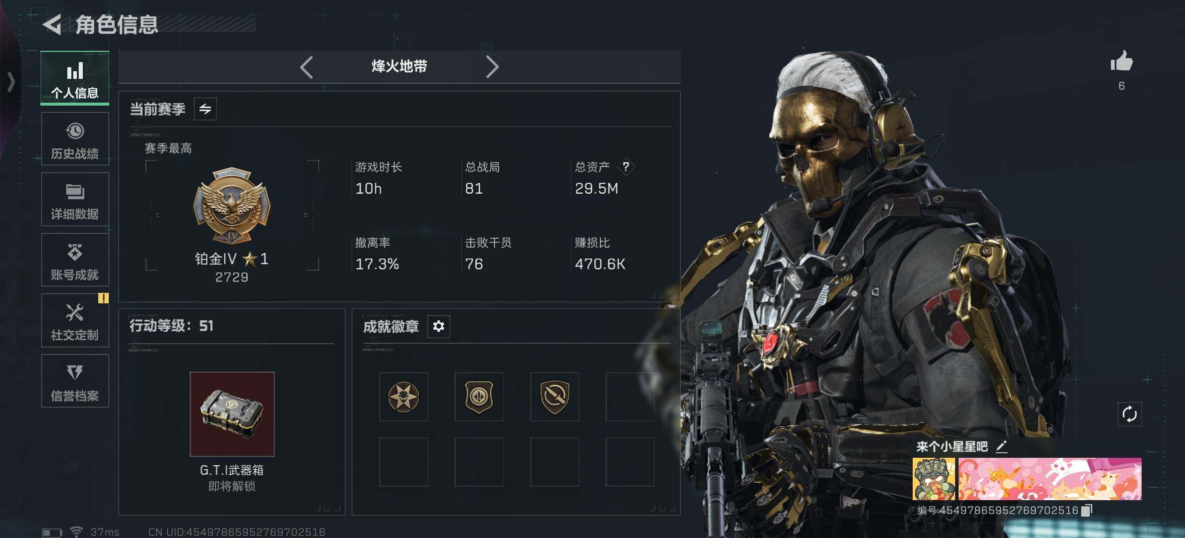 [13788017]【店主推荐捡漏号!可直接换绑】29.5m总资产 935k哈伏币-24m流动资产-51烽火等级-铂金-1战场等级-无军衔