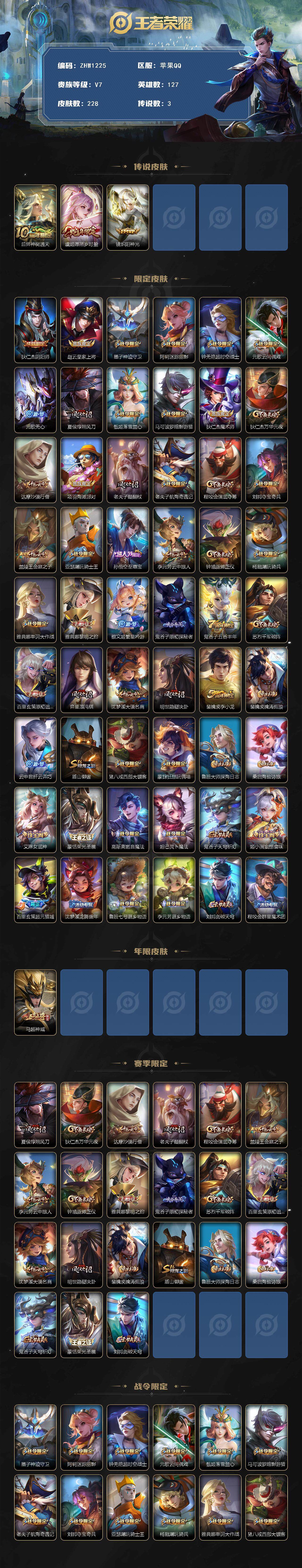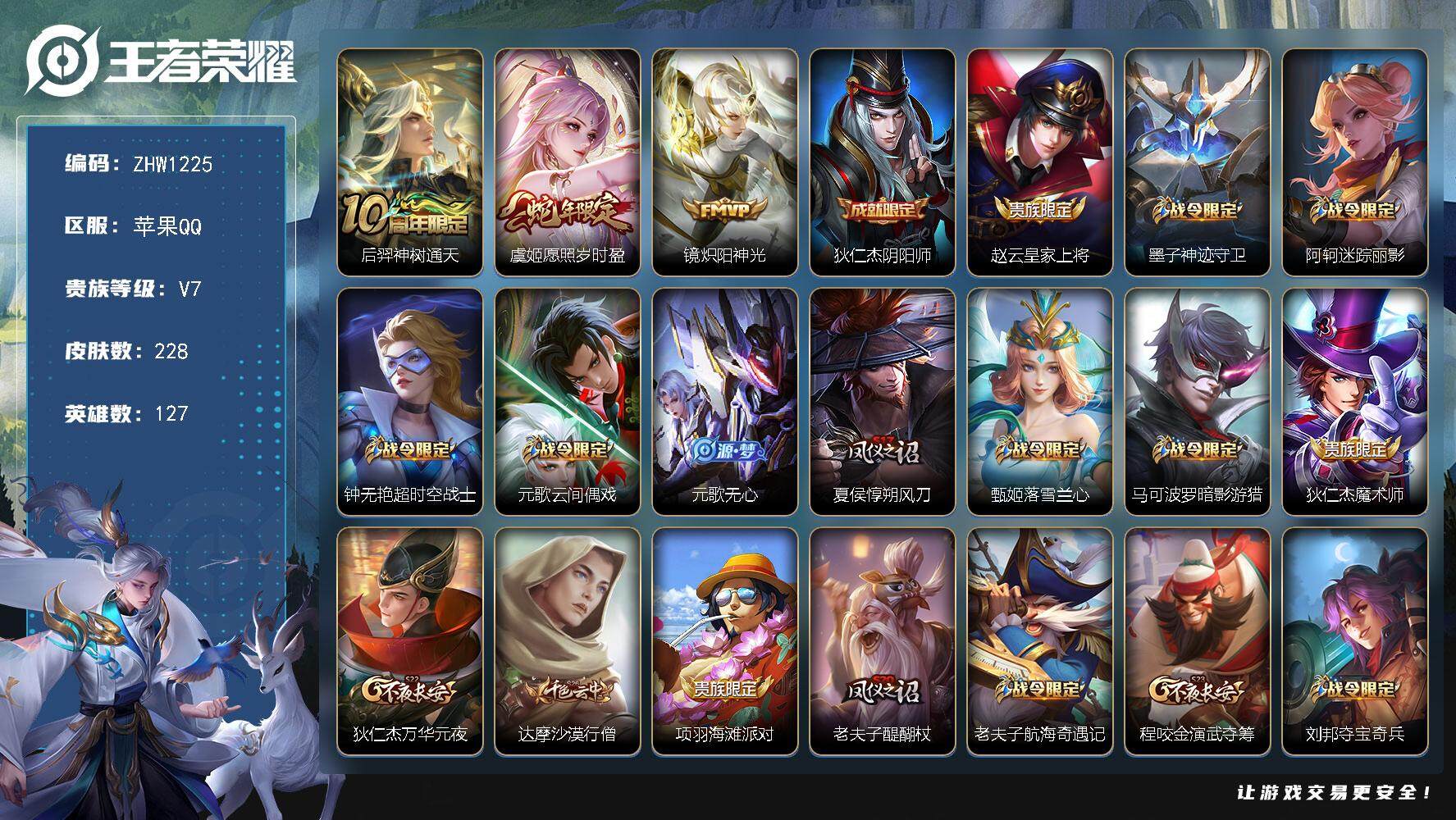 [13711992]【店主推荐捡漏号!可直接换绑】:苹果Q-V7-最强王者段位-127英雄-228皮肤-3传说-68史诗