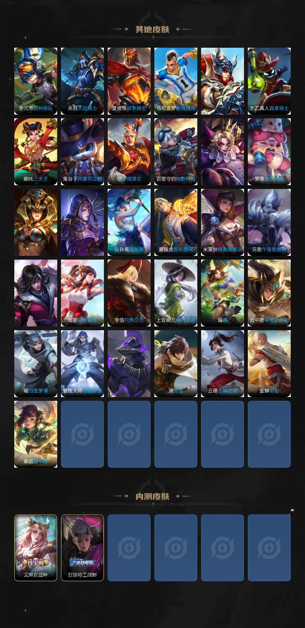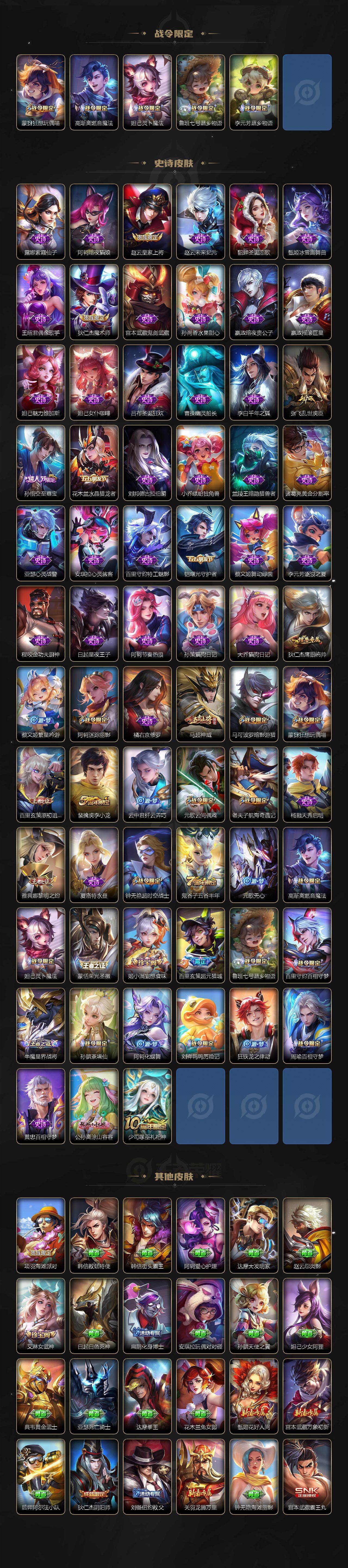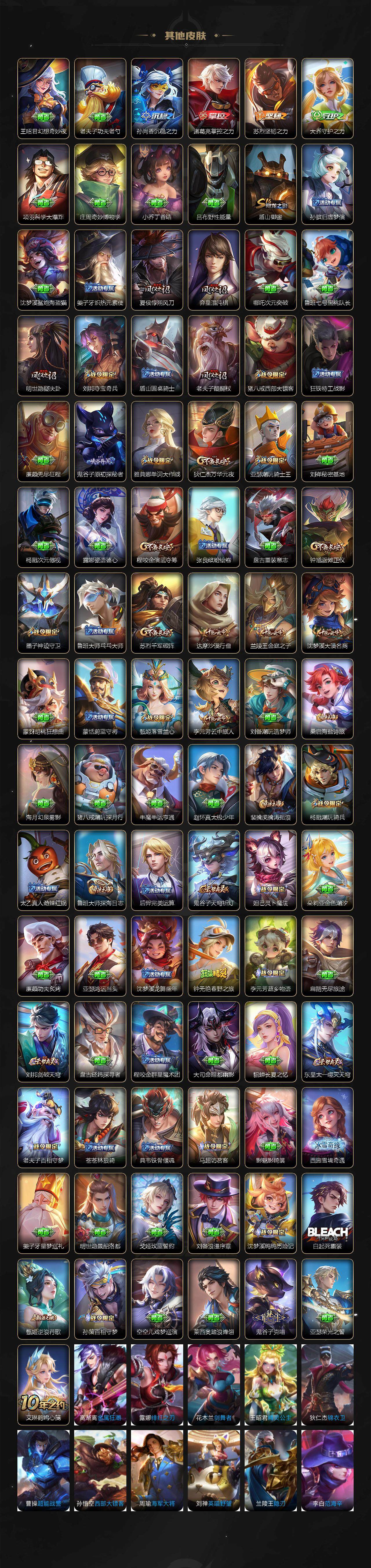 【限定皮肤】:狄仁杰阴阳师,赵云皇家上将,墨子神迹守卫,阿轲迷踪丽影,钟无艳超时空战士,元歌云间偶戏,元歌无心,夏侯惇朔风刀,甄姬落雪兰心,马可波罗暗影游猎,狄仁杰魔术师,狄仁杰万华元夜,达摩沙漠行僧,项羽海滩派对,老夫子醍醐杖,老夫子航海奇遇记,程咬金演武夺筹,刘邦夺宝奇兵,兰陵王金庭之子,亚瑟潮玩骑士王,孙悟空至尊宝,李元芳云中旅人,钟馗驱傩正仪,杨戬潮玩骑兵,雅典娜单词大作战,雅典娜黎明之约,蔡文姬繁星吟游,鬼谷子原初探秘者,鬼谷子五谷丰年,苏烈千军破阵,百里玄策原初追逐者,弈星混沌棋,沈梦溪大漠名商,明世隐疑决卦,裴擒虎李小龙,裴擒虎擒涛扼浪,云中君纤云弄巧,盾山御銮,猪八戒西部大镖客,蒙犽狂想玩偶喵,鲁班大师探海日志,桑启海盐诗旅,艾琳女武神,蒙恬荣光圣徽,高渐离燃音魔法,妲己灵卜魔法,鬼谷子天穹祈灯,姬小满妄想食味,百里玄策超元猎域,沈梦溪龙舞盛年,鲁班七号蔬乡物语,李元芳蔬乡物语,刘邦剑破天穹,程咬金群星魔术团
