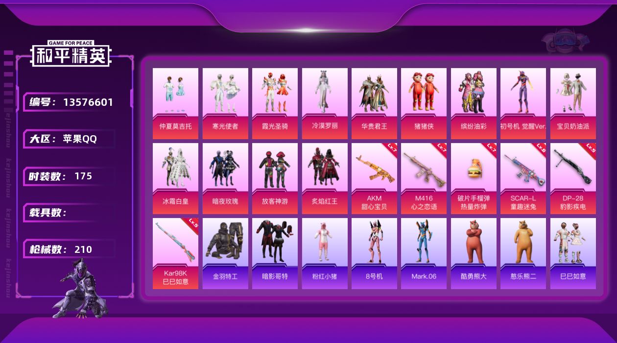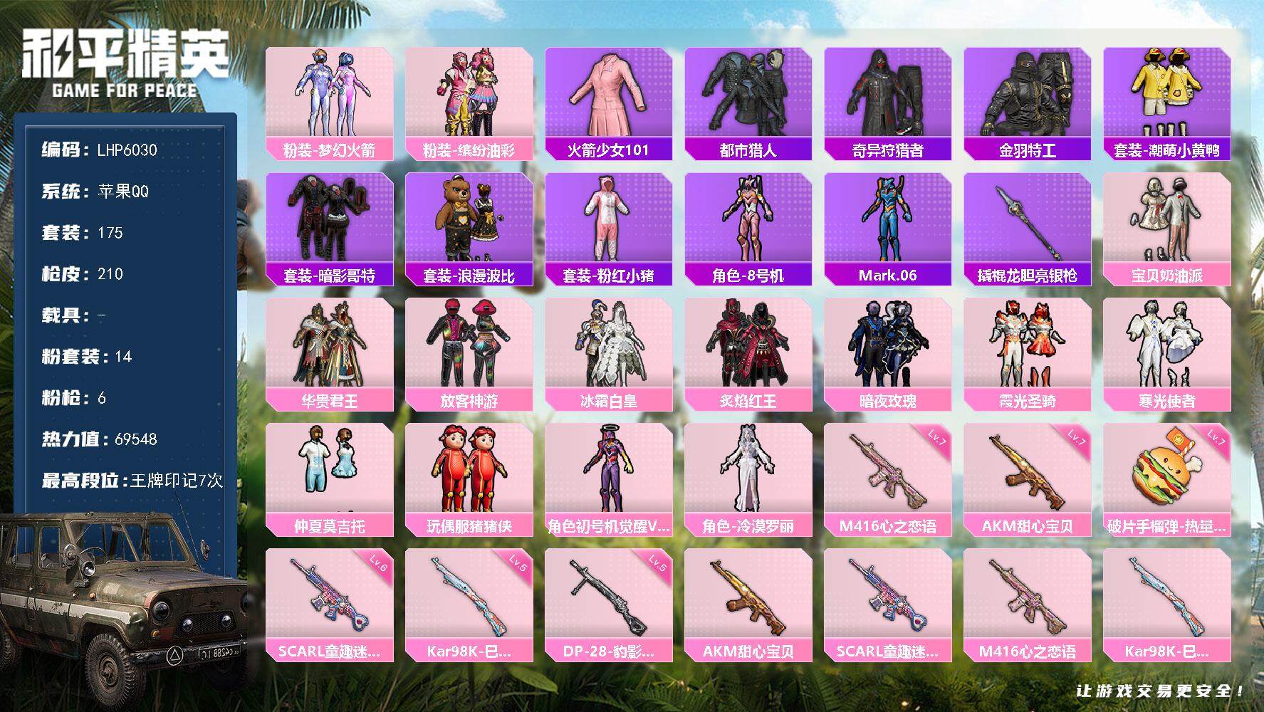 [13576601]【店主推荐捡漏号!可直接换绑】/素材身法号/老101 苹果 手Q-14粉装-6特效枪-6.9w热力值-7王牌印记-175套装-210枪皮【热门品类】:粉装-梦幻火箭,粉装-缤纷油彩,套装-火箭少女101,套装-都市猎人,套装-奇异狩猎者,套装-金羽特工,套装-潮萌小黄鸭,套装-暗影哥特,套装-浪漫波比,套装-粉红小猪,角色-8号机,角色-Mark.06,撬棍-龙胆亮银枪【粉色套装】:粉装-宝贝奶油派,粉装-梦幻火箭,粉装-华贵君王,粉装-缤纷油彩,粉装-放客神游,粉装-冰霜白皇,粉装-炙焰红王,粉装-暗夜玫瑰,粉装-霞光圣骑,粉装-寒光使者,粉装-仲夏莫吉托,玩偶服-猪猪侠,角色-初号机 觉醒Ver.,角色-冷漠罗丽【粉色枪皮等级】:AKM-甜心宝贝(七级),SCAR-L-童趣迷兔(六级),M416-心之恋语(七级),Kar98K-巳巳如意(五级),DP-28-豹影疾电(五级),破片手榴弹-热量炸弹(七级)