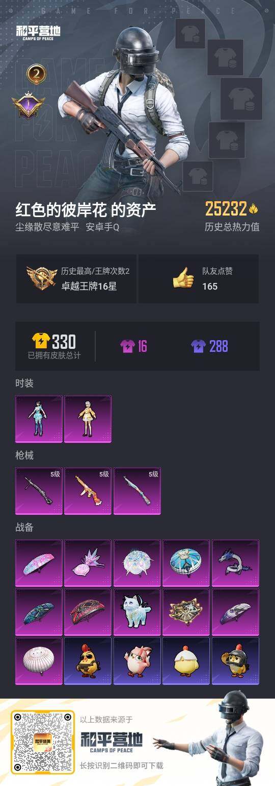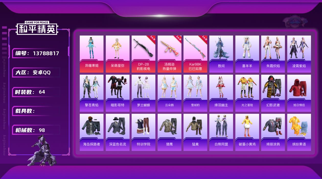 - PX_2070912- 安卓手Q-11王牌印记-2粉装-6特效枪-0载具-41652热力值-97套装-160枪皮-5卓越印记-1传奇印记 【2粉装】,樱桃泡泡,未来战士 【6特效枪】SCAR-L-锦绣绵绵-5级 M416-电玩时刻-5级 GROZA-镜光银凌-5级 AUG-暖羊咩咩-5级 Kar98K-巳巳如意-5级 Mk14-甜梦熊击-5级 【2稀有紫装】,龟仙人,许七安, 【97稀有时装】,