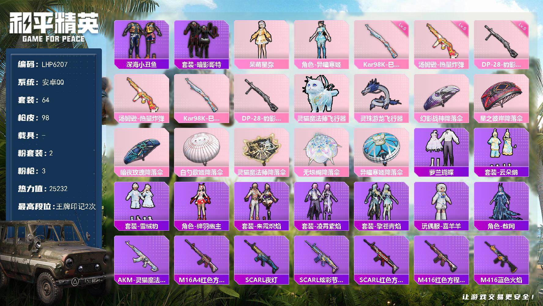 [13788817]【店主推荐捡漏号!可直接换绑】/地铁满天赋 安卓 手Q-2粉装-3特效枪-3粉色飞行器-2.5w热力值-2王牌印记-64套装-98枪皮【热门品类】:套装-深海小丑鱼,套装-暗影哥特【粉色套装】:角色-呆萌星弥,角色-异瞳寒姬【粉色枪皮等级】:汤姆逊-热量炸弹(五级),Kar98K-巳巳如意(五级),DP-28-豹影疾电(五级)【粉色飞行器】:灵猫魔法师飞行器,灵珠游龙飞行器