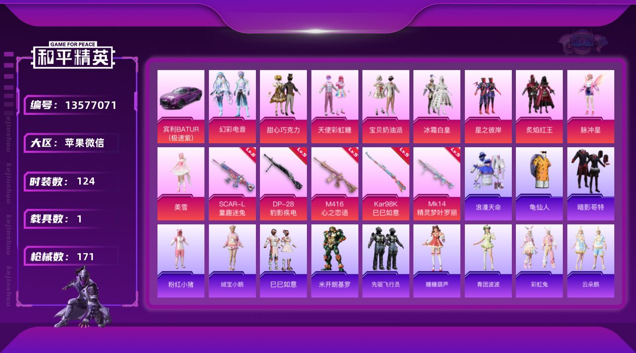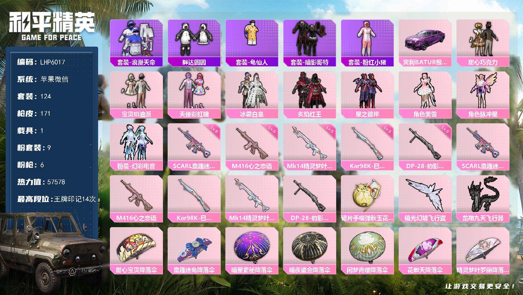 [13577071]【店主推荐捡漏号!可直接换绑】/素材身法号/地铁满天赋 苹果 微信-9粉装-6特效枪-1载具-4粉色飞行器-5.7w热力值-14王牌印记-124套装-171枪皮【热门品类】:套装-浪漫天命,套装-胖达圆圆,套装-龟仙人,套装-暗影哥特,套装-粉红小猪【粉色载具】:宾利BATUR(极速紫)【粉色套装】:粉装-甜心巧克力,粉装-宝贝奶油派,粉装-天使彩虹糖,粉装-冰霜白皇,粉装-炙焰红王,粉装-星之彼岸,角色-美雪,角色-脉冲星,粉装-幻彩电音【粉色枪皮等级】:SCAR-L-童趣迷兔(六级),M416-心之恋语(五级),Kar98K-巳巳如意(五级),Mk14-精灵梦叶罗丽(五级),DP-28-豹影疾电(五级)【粉色飞行器】:镜光幻境飞行翼,龙翔九天飞行器