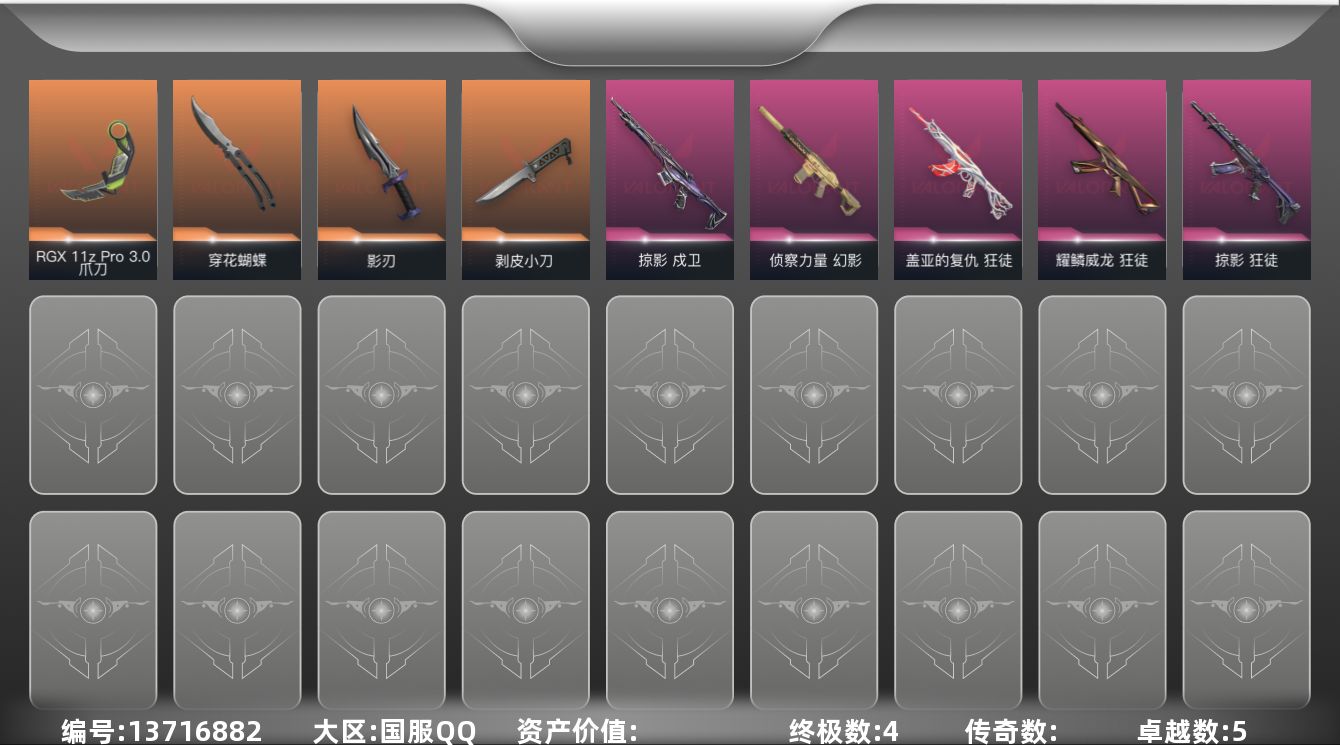 [13716882]【英雄】:幻棱,炼狱,维斯,暮蝶,钛狐,壹决,铁臂,捷风,幽影,不死鸟,贤者,猎枭,蝰蛇,零,芮娜,奇乐,尚勃勒,霓虹,斯凯,夜露,K/O,盖可,黑梦,钢锁 【近战 武器】:近战武器-穿花蝴蝶,近战武器-剥皮小刀,近战武器-RGX 11z Pro//3.0 爪刀,近战武器-影刃 【狂徒】:狂徒-掠影,狂徒-盖亚的复仇,狂徒-耀鳞威龙 【幻影】:幻影-侦察力量 【戍卫】:戍卫-掠影 【正义】:正义-超限闪存,正义-纳米打击 【鬼魅】:鬼魅-诡秘蛇影,鬼魅-星云暗涌 【卡面】:终章:激斗汉堡 卡面,进入射程 卡面,《双城之战》拥抱 卡面,精灵大战 卡面,欢迎来到底城 卡面,南瓜盛典 卡面,修车达人 卡面,浮光跃金 卡面,正义的化身 卡面,复活专家 卡面,零点嗅探设计图 卡面,源能者美容 卡面,无畏契约GO!第一卷:芮娜 卡面,无畏契约GO!第一卷:零 卡面,无垠星环 卡面,钢锁vs盖可 卡面,代号红色 卡面,新兵报到 卡面,V契约 卡面,无畏契约 卡面 【喷漆】:嗨宝南瓜灯 喷漆,嘭! 喷漆,都算到了 喷漆,控场勿近 喷漆,小丑猫 喷漆,熊抱 喷漆,买装还是存钱 喷漆,胜利属于无畏契约 喷漆,GLHF 喷漆,无畏契约 喷漆 【挂饰】:终章:猫猫木乃伊 挂饰,悠闲鸡块 挂饰,伞绳 挂饰,《双城之战》小蛋糕 挂饰,第九季//第三幕 纪念币 挂饰,工具腰带 挂饰,鱼骨头 挂饰,熔岩灯 挂饰,第九季//第二幕 纪念币 挂饰,Z世代特饮 挂饰,深海水母 挂饰,天外飞客 挂饰,无畏契约 纪念币 挂饰