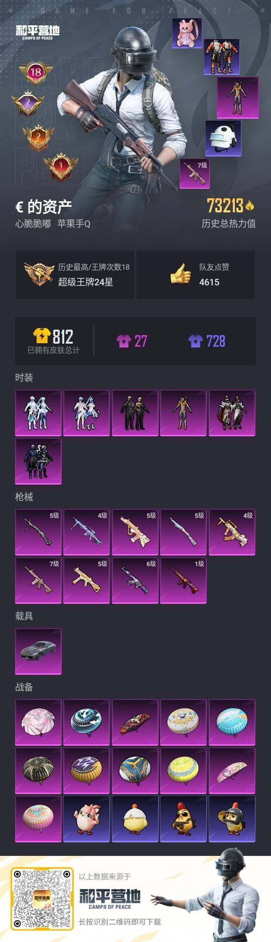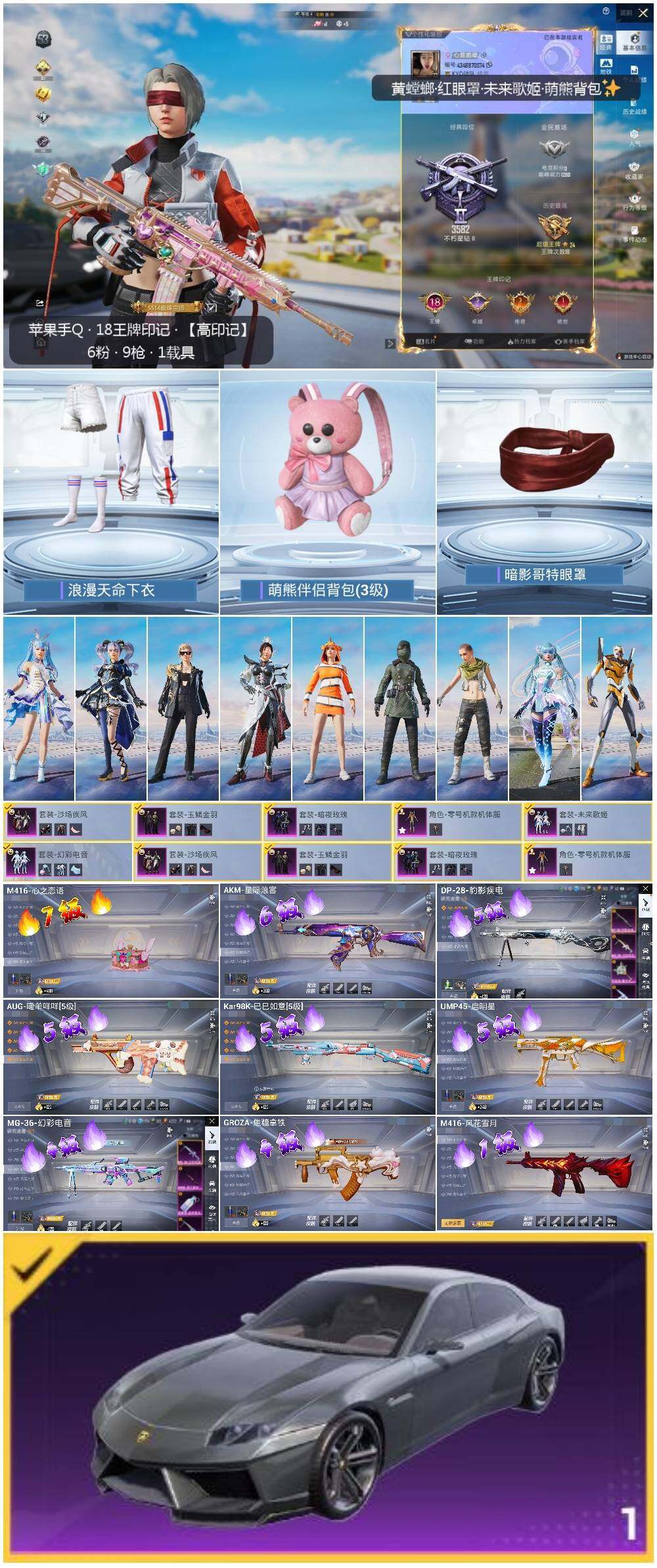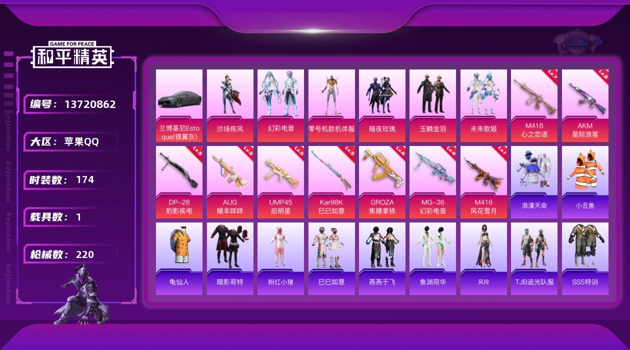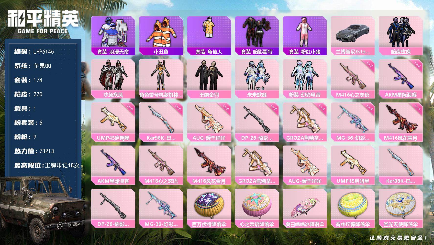 [13720862]【店主推荐捡漏号!可直接换绑】/素材身法号/绝世印记1 苹果 手Q-6粉装-9特效枪-1载具-7.3w热力值-18王牌印记-174套装-220枪皮【热门品类】:套装-浪漫天命,套装-小丑鱼,套装-龟仙人,套装-暗影哥特,套装-粉红小猪【粉色载具】:兰博基尼Estoque(银翼灰)【粉色套装】:粉装-暗夜玫瑰,粉装-沙场疾风,角色-零号机款机体服,粉装-玉鳞金羽,粉装-未来歌姬,粉装-幻彩电音【粉色枪皮等级】:AKM-星际浪客(六级),M416-心之恋语(七级),M416-风花雪月(一级),GROZA-焦糖拿铁(四级),AUG-暖羊咩咩(五级),UMP45-启明星(五级),Kar98K-巳巳如意(五级),DP-28-豹影疾电(五级),MG-36-幻彩电音(四级)