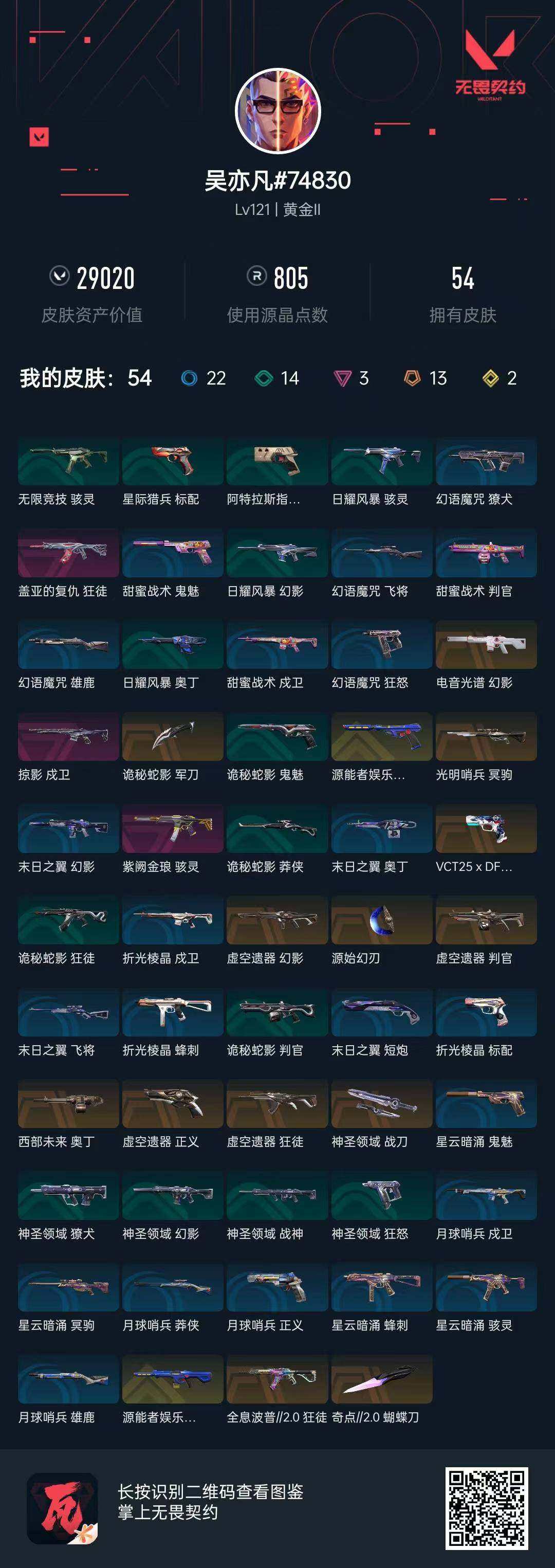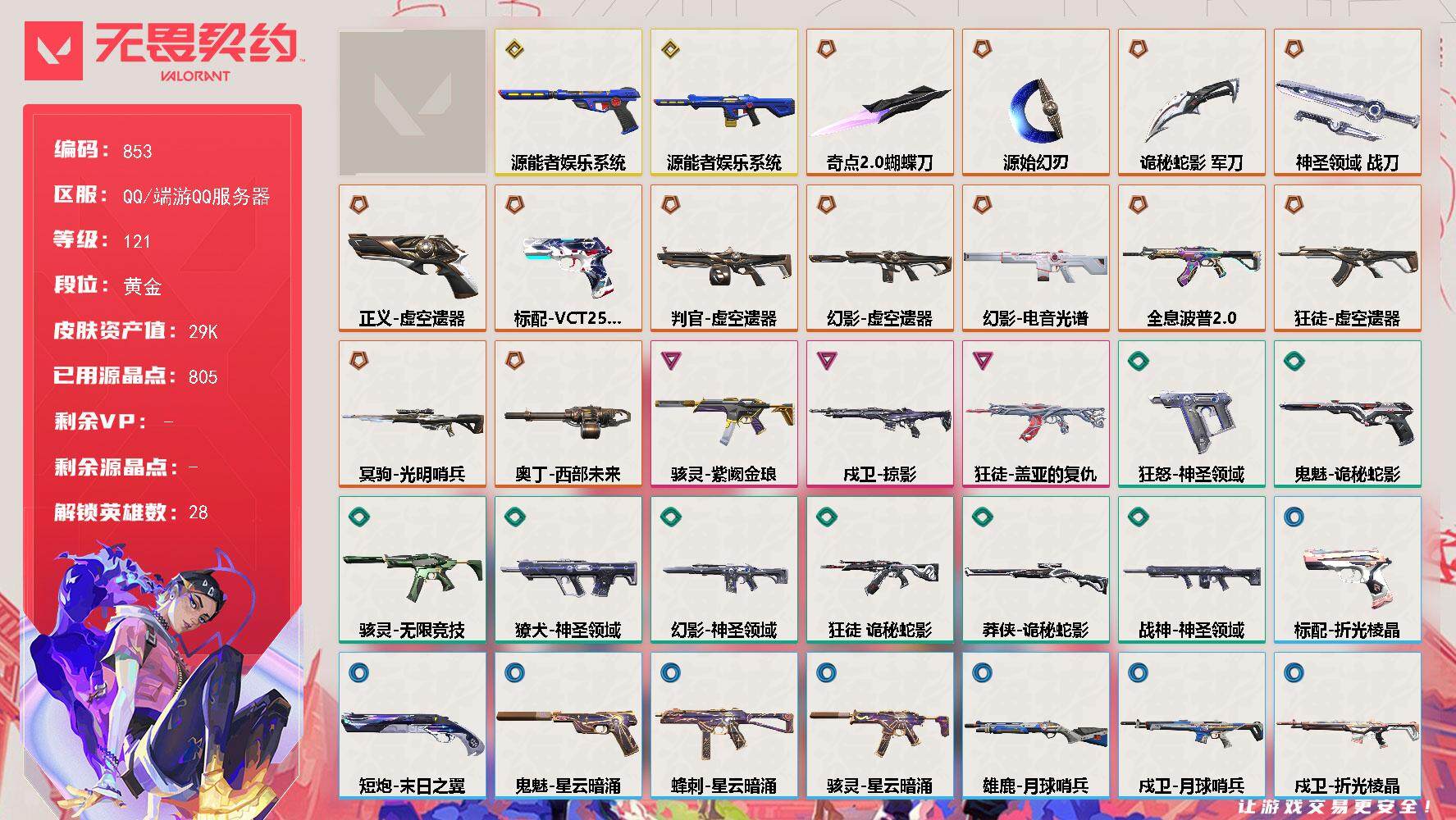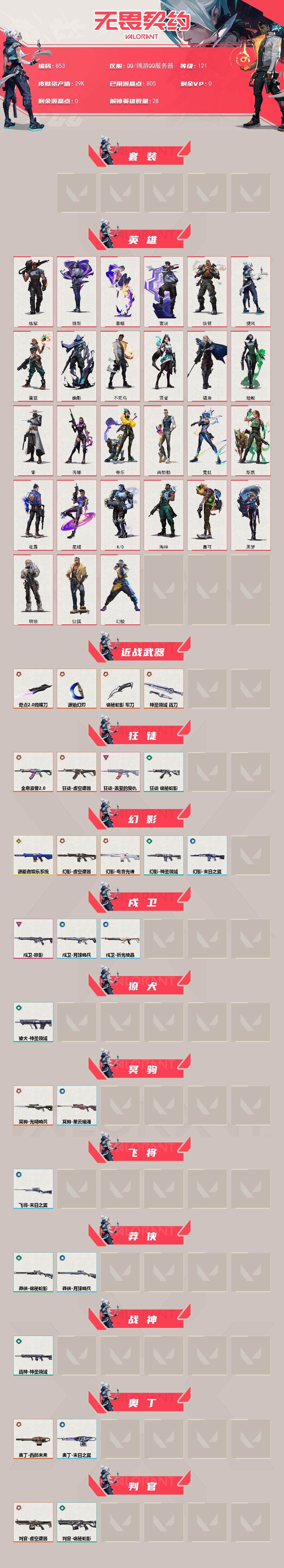 [13588171]【套装】:虚空遗器套装 【英雄】:幻棱,炼狱,维斯,暮蝶,钛狐,壹决,铁臂,捷风,雷兹,幽影,不死鸟,贤者,猎枭,蝰蛇,零,芮娜,奇乐,尚勃勒,霓虹,斯凯,夜露,星礈,K/O,海神,盖可,黑梦,钢锁 【近战 武器】:近战武器-奇点//2.0 蝴蝶刀,近战武器-源始幻刃,近战武器-诡秘蛇影 军刀,近战武器-神圣领域 战刀 【狂徒】:狂徒-全息波普//2.0,狂徒-虚空遗器,狂徒-盖亚的复仇,狂徒-诡秘蛇影 【幻影】:幻影-源能者娱乐系统,幻影-虚空遗器,幻影-电音光谱,幻影-神圣领域,幻影-末日之翼,幻影-电音光谱 【戍卫】:戍卫-掠影,戍卫-月球哨兵,戍卫-折光棱晶 【獠犬】:獠犬-神圣领域 【冥驹】:冥驹-光明哨兵,冥驹-星云暗涌 【飞将】:飞将-末日之翼 【莽侠】:莽侠-诡秘蛇影,莽侠-月球哨兵 【战神】:战神-神圣领域 【奥丁】:奥丁-西部未来,奥丁-末日之翼 【判官】:判官-虚空遗器,判官-诡秘蛇影 【雄鹿】:雄鹿-月球哨兵 【骇灵】:骇灵-紫阙金琅,骇灵-无限竞技,骇灵-星云暗涌 【蜂刺】:蜂刺-星云暗涌,蜂刺-折光棱晶 【标配】:标配-折光棱晶 【VCT手枪】:标配-VCT25 x DFM 【正义】:正义-虚空遗器,正义-月球哨兵 【鬼魅】:鬼魅-源能者娱乐系统,鬼魅-诡秘蛇影,鬼魅-星云暗涌 【狂怒】:狂怒-神圣领域 【短炮】:短炮-末日之翼 【卡面】:精灵大战 卡面,南瓜盛典 卡面,热舞环节 卡面,Clutch 卡面,无畏契约GO!第一卷:芮娜 卡面,无畏契约GO!第一卷:零 卡面,《双城之战》金克丝 卡面,无畏契约GO!第一卷:贤者 卡面,别冒尖 卡面,代号红色 卡面,新兵报到 卡面,V契约 卡面,无畏契约 卡面 【喷漆】:嗨宝南瓜灯 喷漆,控场勿近 喷漆,买装还是存钱 喷漆,无畏契约GO!第一卷:芮娜 喷漆,无畏契约GO!第一卷:贤者 喷漆,暴走萝莉 喷漆,胜利属于无畏契约 喷漆,GLHF 喷漆,无畏契约 喷漆 【挂饰】:伞绳 挂饰,第九季//第三幕 纪念币 挂饰,天外飞客 挂饰,《双城之战》魄罗 挂饰,无畏契约 纪念币 挂饰