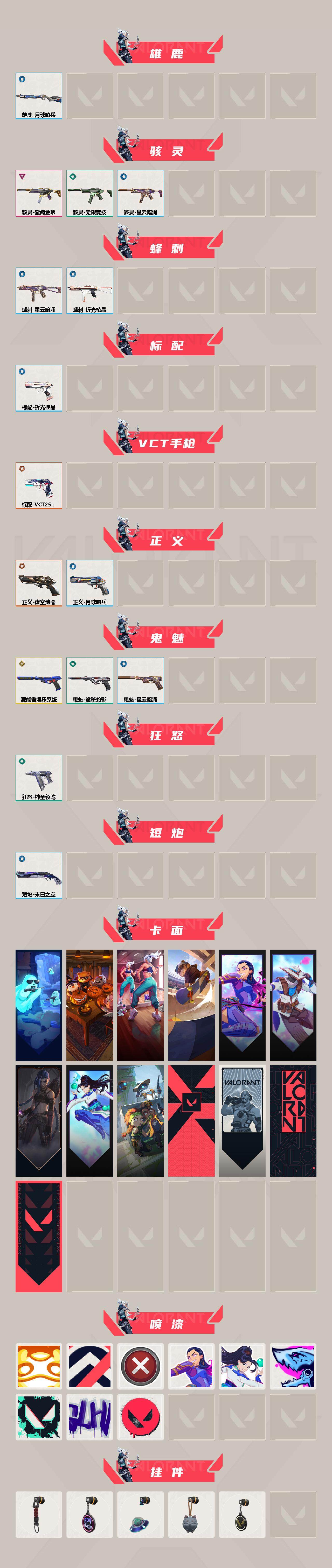 【卡面】:精灵大战 卡面,南瓜盛典 卡面,热舞环节 卡面,Clutch 卡面,无畏契约GO!第一卷:芮娜 卡面,无畏契约GO!第一卷:零 卡面,《双城之战》金克丝 卡面,无畏契约GO!第一卷:贤者 卡面,别冒尖 卡面,代号红色 卡面,新兵报到 卡面,V契约 卡面,无畏契约 卡面