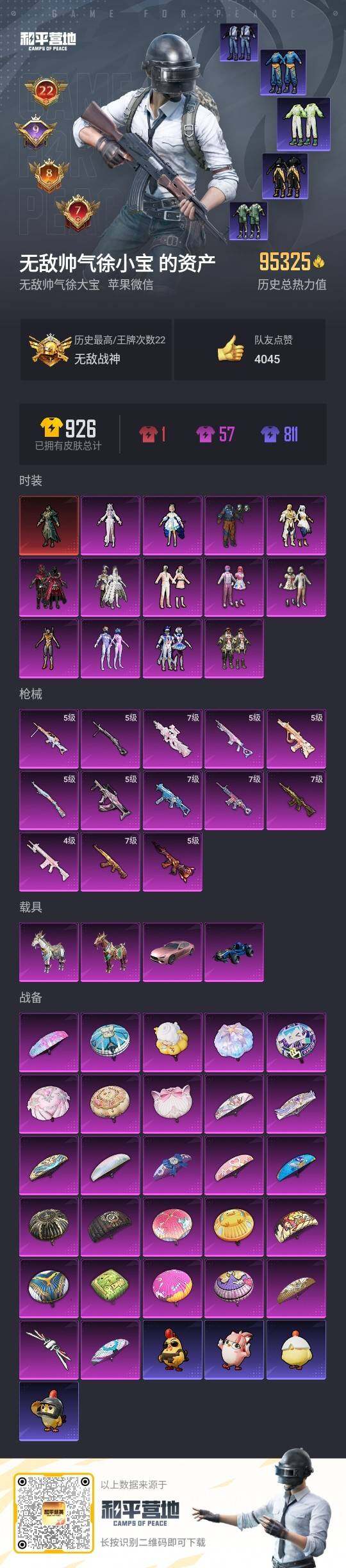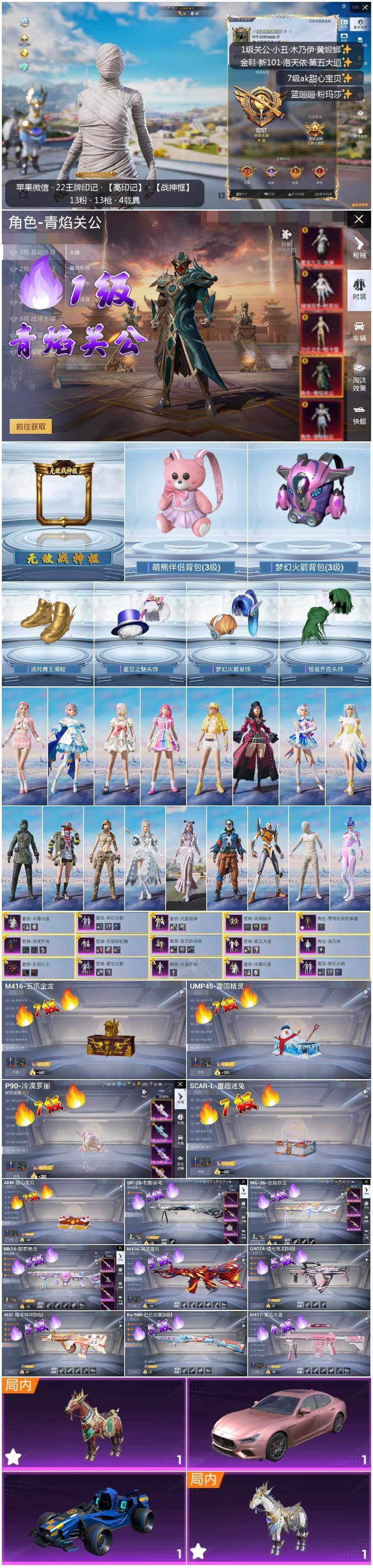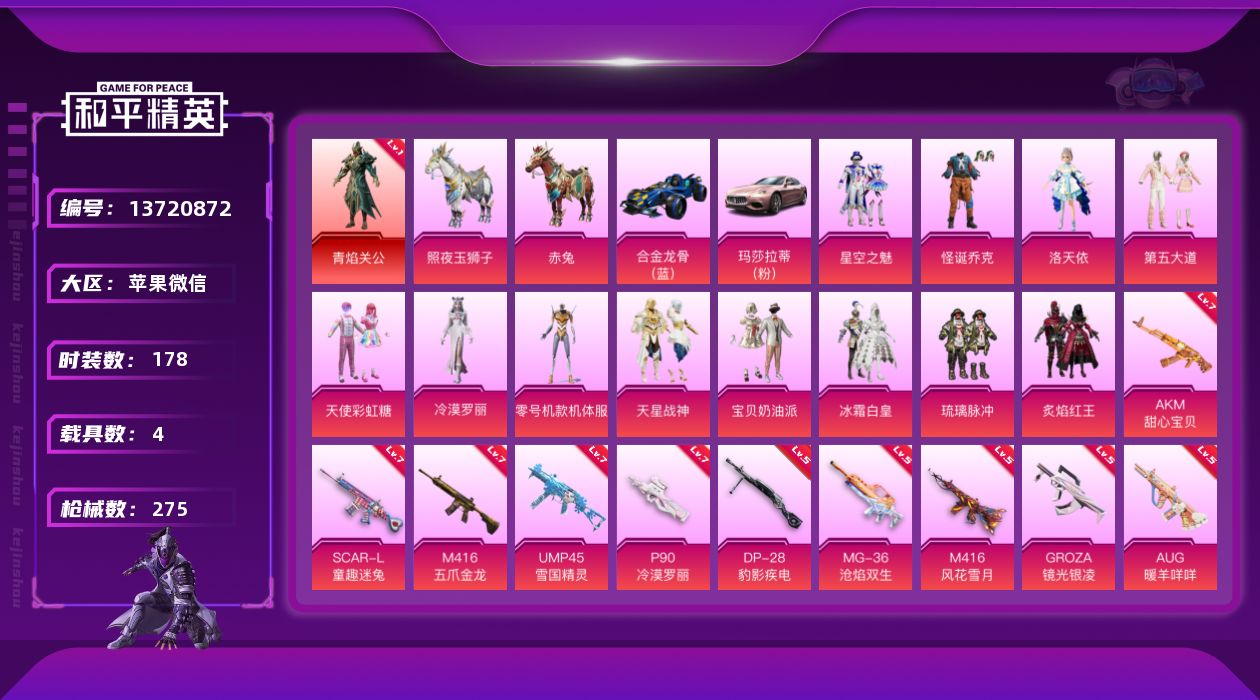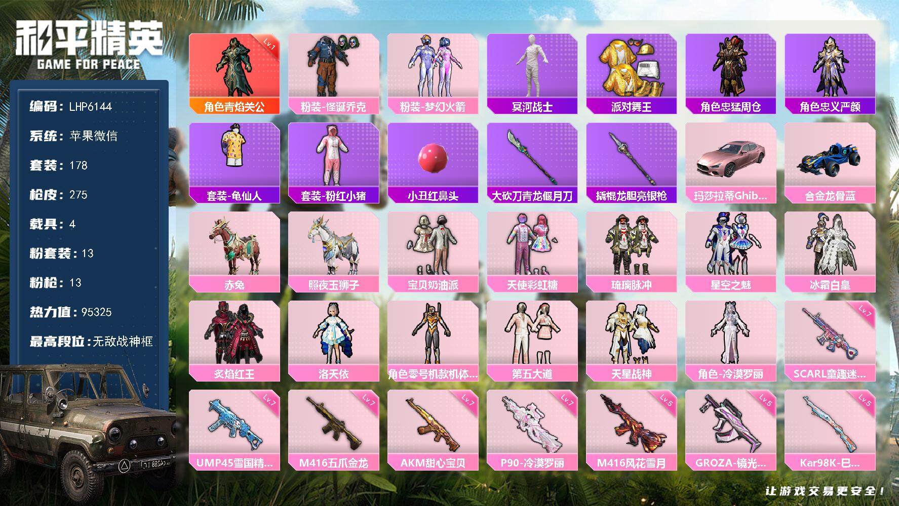 [13720872]素材身法号/无敌战神框7/绝世印记7 苹果 微信-无敌战神框-1神装-13粉装-13特效枪-4载具-1粉色飞行器-9.5w热力值-22王牌印记-178套装-275枪皮【红色神装等级】:角色-青焰关公(一级)【热门品类】:粉装-怪诞乔克,粉装-梦幻火箭,套装-冥河战士,套装-派对舞王,角色-忠猛周仓,角色-忠义严颜,套装-龟仙人,套装-粉红小猪,小丑红鼻头,大砍刀-青龙偃月刀,撬棍-龙胆亮银枪【粉色载具】:玛莎拉蒂Ghibli(粉),合金龙骨(蓝),赤兔,照夜玉狮子【粉色套装】:粉装-怪诞乔克,粉装-宝贝奶油派,粉装-天使彩虹糖,粉装-梦幻火箭,粉装-琉璃脉冲,粉装-星空之魅,粉装-冰霜白皇,粉装-炙焰红王,角色-洛天依,角色-零号机款机体服,粉装-第五大道,粉装-天星战神,角色-冷漠罗丽【粉色枪皮等级】:AKM-甜心宝贝(七级),SCAR-L-童趣迷兔(七级),M416-五爪金龙(七级),M416-风花雪月(五级),GROZA-镜光银凌(五级),AUG-暖羊咩咩(五级),UMP45-雪国精灵(七级),P90-冷漠罗丽(七级),Kar98K-巳巳如意(五级),Mk14-甜梦熊击(五级),M417-第五大道(四级),DP-28-豹影疾电(五级),MG-36-沧焰双生(五级)【粉色飞行器】:四圣焕新飞行器