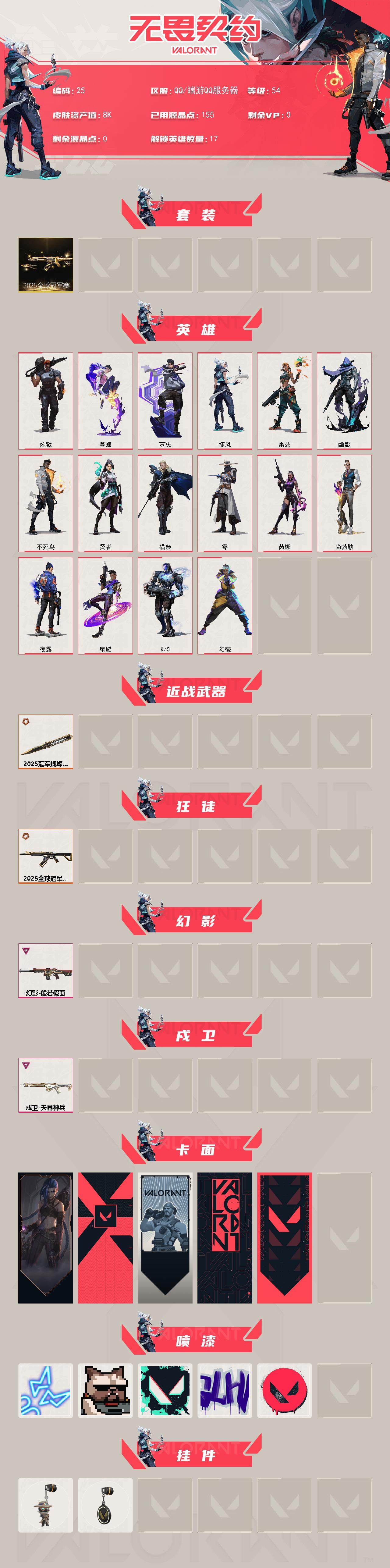 [13591051]【套装】:2025全球冠军赛套装 【英雄】:幻棱,炼狱,暮蝶,壹决,捷风,雷兹,幽影,不死鸟,贤者,猎枭,零,芮娜,尚勃勒,夜露,星礈,K/O 【近战 武器】:近战武器-2025全球冠军赛 蝴蝶刀 【狂徒】:狂徒-2025全球冠军赛 【幻影】:幻影-般若假面 【戍卫】:戍卫-天界神兵 【卡面】:《双城之战》金克丝 卡面,代号红色 卡面,新兵报到 卡面,V契约 卡面,无畏契约 卡面 【喷漆】:霓光四射 喷漆,关门放狗 喷漆,胜利属于无畏契约 喷漆,GLHF 喷漆,无畏契约 喷漆 【挂饰】:无畏契约GO!第一卷 零 挂饰,无畏契约 纪念币 挂饰