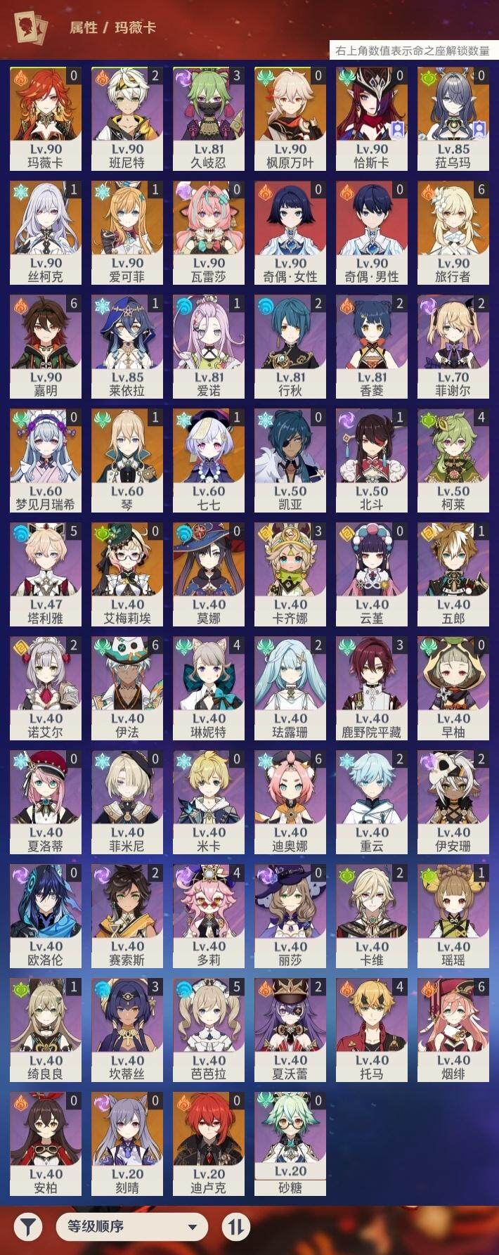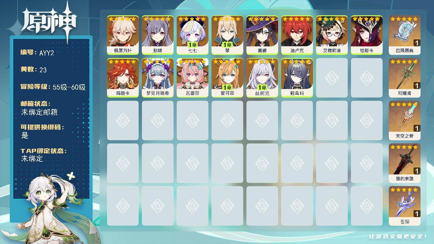 [13796117]57级/23黄/女主/14个五星角色/5个五星武器 0命枫原万叶,0命刻晴,1命七七,1命琴,0命莫娜,0命迪卢克,0命艾梅莉埃,0命恰斯卡,0命玛薇卡,0命梦见月瑞希,0命瓦雷莎,1命爱可菲,1命丝柯克,0命菈乌玛,精1四风原典,精1和璞鸢,精1天空之脊,精1狼的末路,精1苍耀