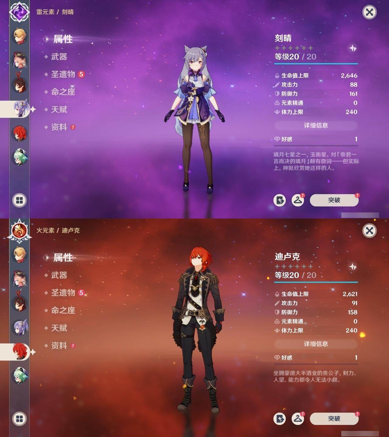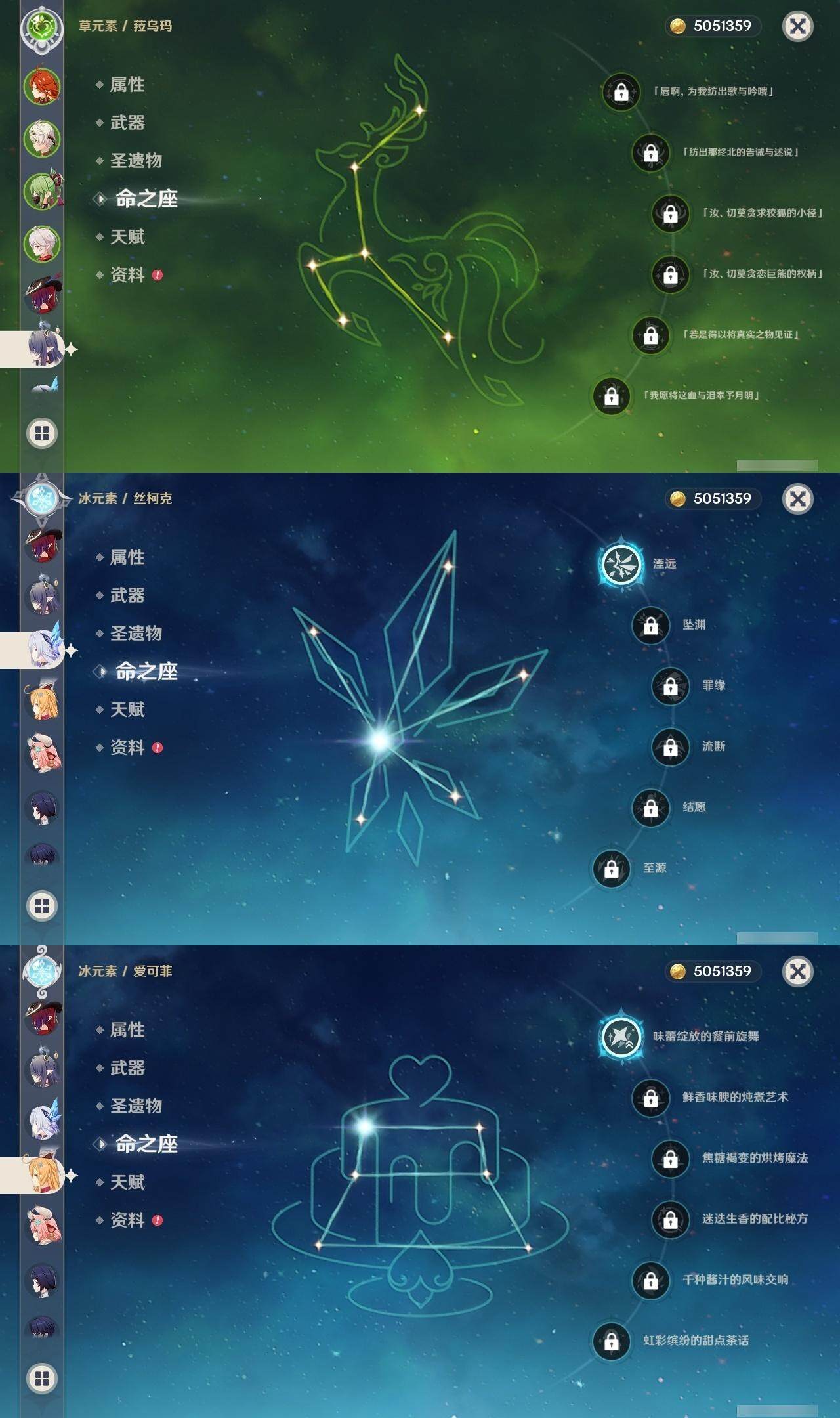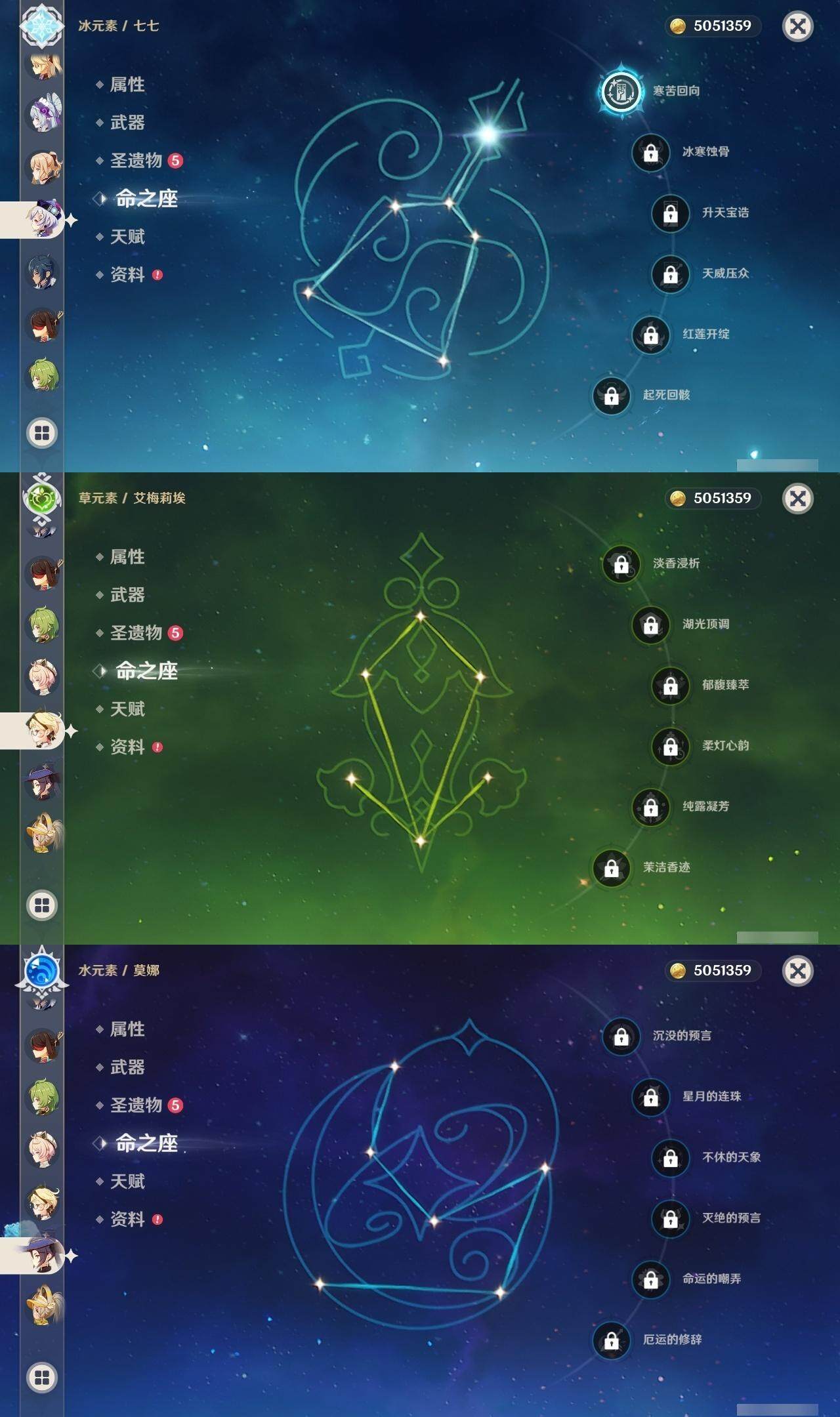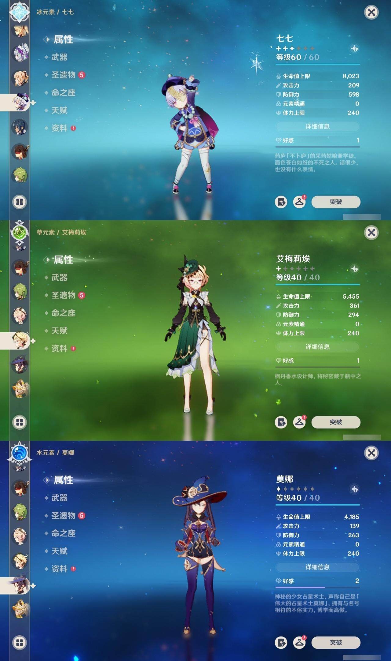 0命枫原万叶,0命刻晴,1命七七,1命琴,0命莫娜,0命迪卢克,0命艾梅莉埃,0命恰斯卡,0命玛薇卡,0命梦见月瑞希,0命瓦雷莎,1命爱可菲,1命丝柯克,0命菈乌玛,精1四风原典,精1和璞鸢,精1天空之脊,精1狼的末路,精1苍耀