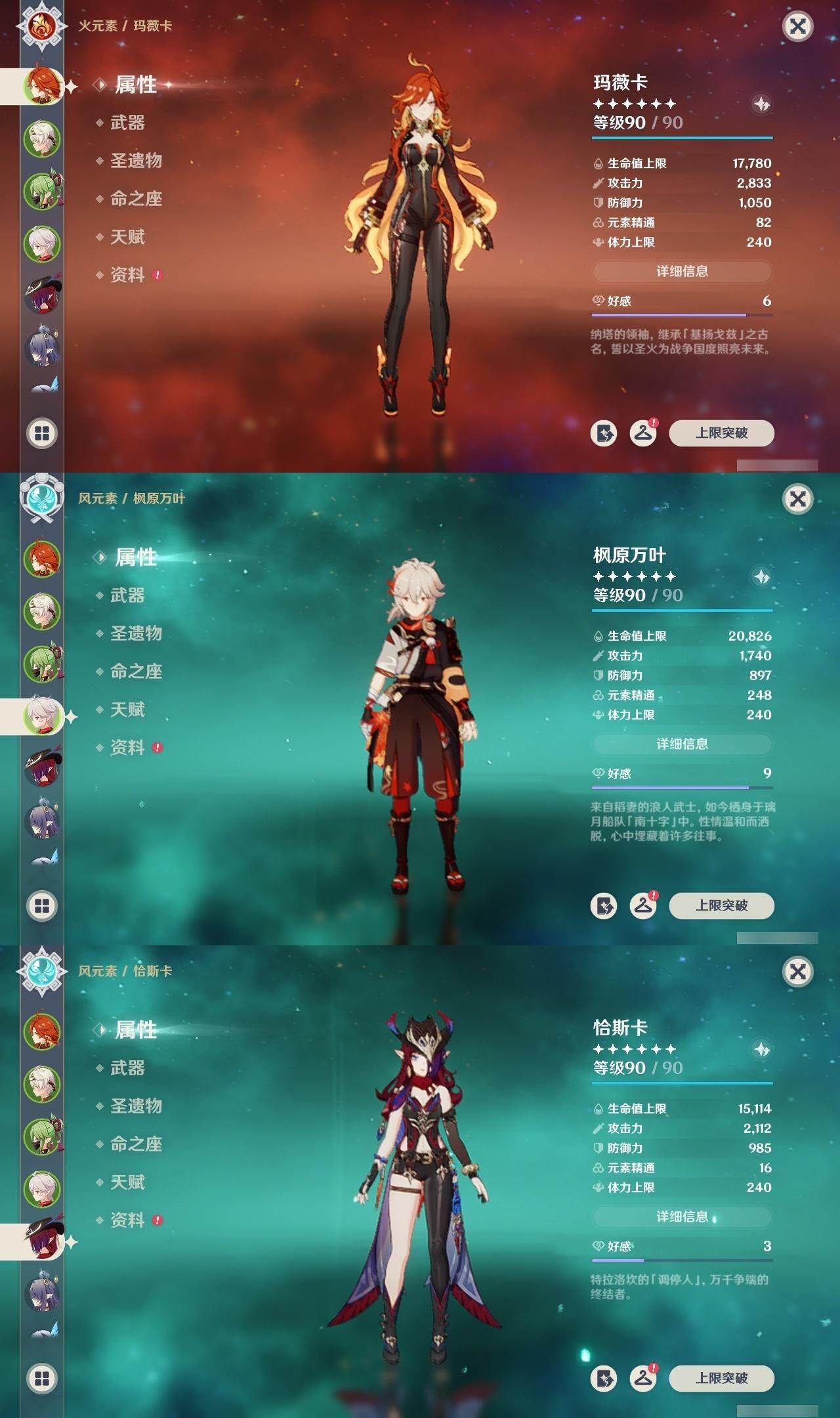 枫原万叶,琴,七七,莫娜,刻晴,迪卢克
