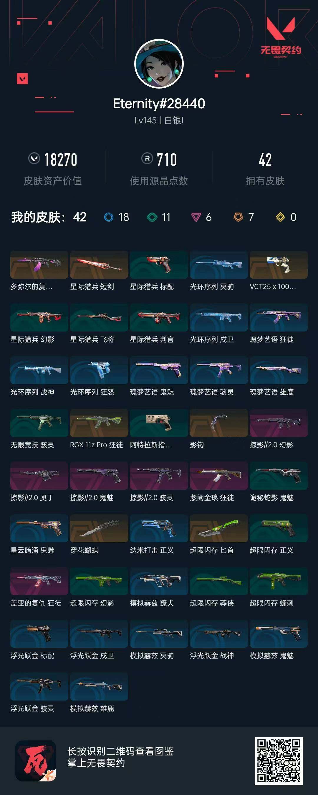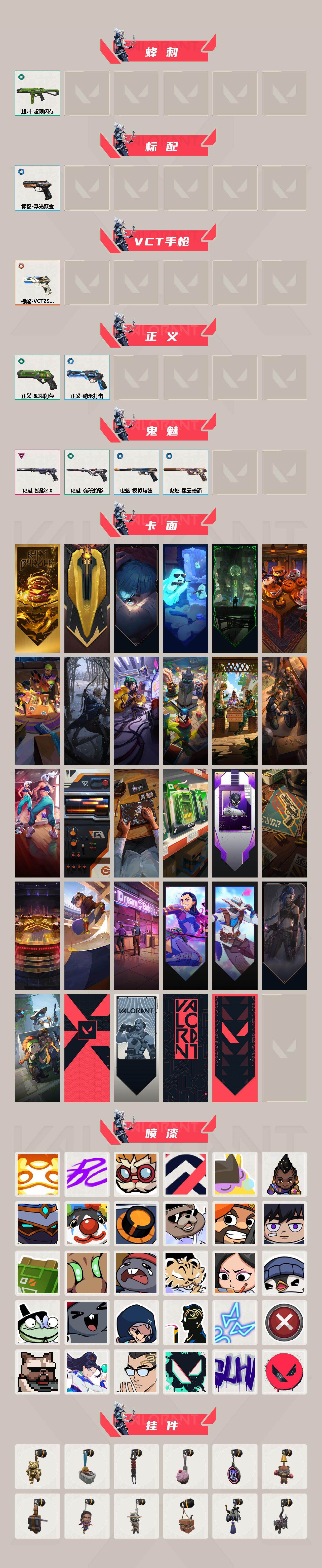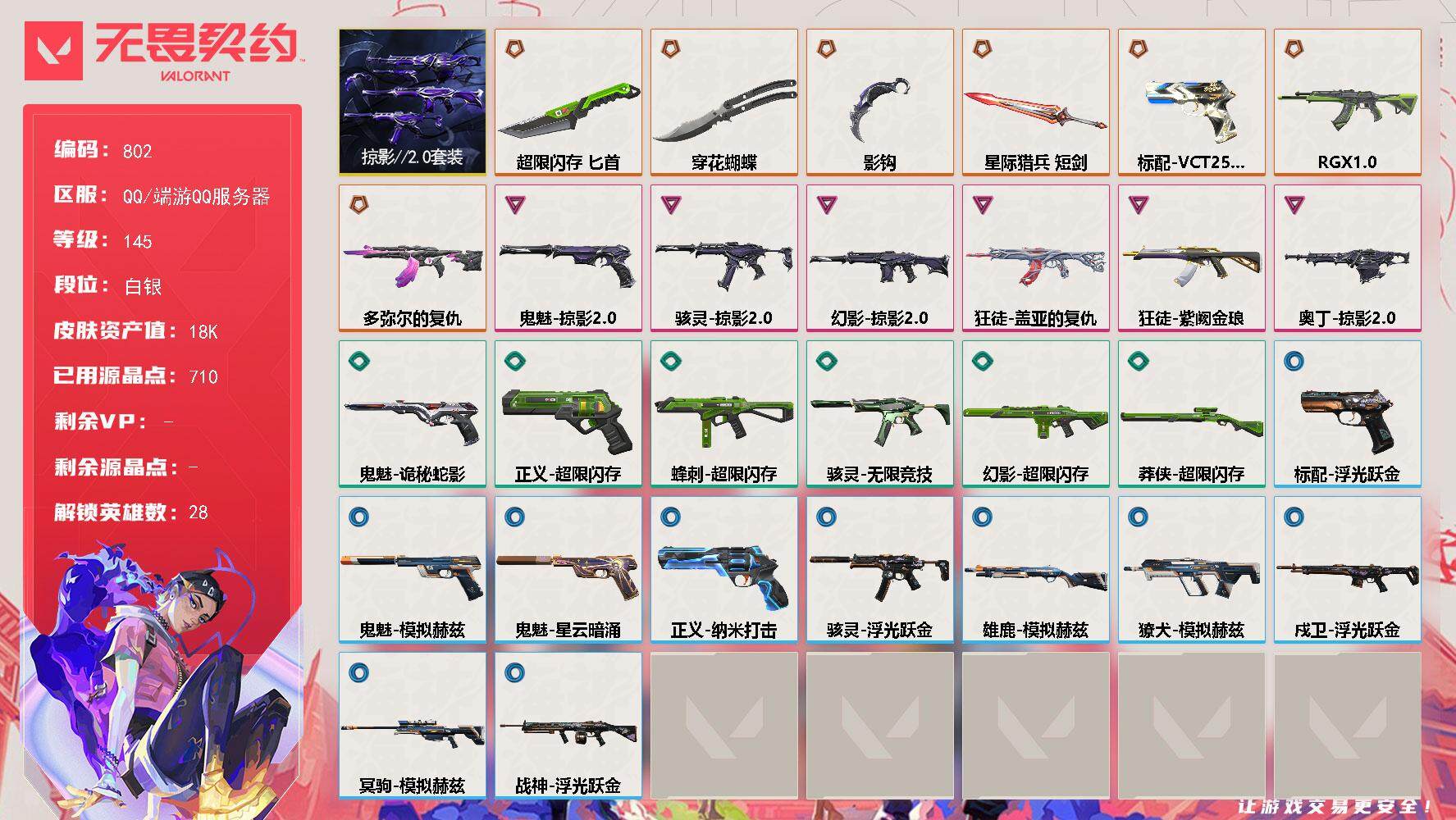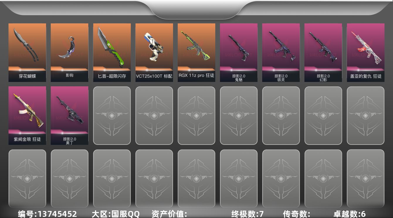 [13745452]【套装】:掠影//2.0套装 【英雄】:幻棱,炼狱,维斯,暮蝶,钛狐,壹决,铁臂,捷风,雷兹,幽影,不死鸟,贤者,猎枭,蝰蛇,零,芮娜,奇乐,尚勃勒,霓虹,斯凯,夜露,星礈,K/O,海神,盖可,黑梦,钢锁 【近战 武器】:近战武器-影钩,近战武器-穿花蝴蝶,近战武器-超限闪存 匕首,近战武器-星际猎兵 短剑 【狂徒】:狂徒-RGX 11z Pro,狂徒-多弥尔的复仇,狂徒-盖亚的复仇,狂徒-紫阙金琅 【幻影】:幻影-掠影//2.0,幻影-超限闪存 【戍卫】:戍卫-浮光跃金 【獠犬】:獠犬-模拟赫兹 【冥驹】:冥驹-模拟赫兹 【莽侠】:莽侠-超限闪存 【战神】:战神-浮光跃金 【奥丁】:奥丁-掠影//2.0 【雄鹿】:雄鹿-模拟赫兹 【骇灵】:骇灵-掠影//2.0,骇灵-无限竞技,骇灵-浮光跃金 【蜂刺】:蜂刺-超限闪存 【标配】:标配-浮光跃金 【VCT手枪】:标配-VCT25 x 100T 【正义】:正义-超限闪存,正义-纳米打击 【鬼魅】:鬼魅-掠影//2.0,鬼魅-诡秘蛇影,鬼魅-模拟赫兹,鬼魅-星云暗涌 【卡面】:终章:激斗汉堡 卡面,进入射程 卡面,《双城之战》拥抱 卡面,精灵大战 卡面,欢迎来到底城 卡面,南瓜盛典 卡面,唱片的故事 卡面,钢弓与箭弦 卡面,排除故障 卡面,战术桌游 卡面,悠享食光 卡面,修车达人 卡面,热舞环节 卡面,模拟赫兹 卡面,浮光跃金 卡面,超限闪存 卡面,维斯工牌 卡面,正义的化身 卡面,最高舞台 卡面,Clutch 卡面,梦幻奶茶 卡面,无畏契约GO!第一卷:芮娜 卡面,无畏契约GO!第一卷:零 卡面,《双城之战》金克丝 卡面,别冒尖 卡面,代号红色 卡面,新兵报到 卡面,V契约 卡面,无畏契约 卡面 【喷漆】:嗨宝南瓜灯 喷漆,嘭! 喷漆,都算到了 喷漆,控场勿近 喷漆,皮蛋呼呼 喷漆,像素星礈 喷漆,图谋不轨的零 喷漆,小丑猫 喷漆,模拟赫兹 喷漆,高丽风情小熊 喷漆,蹲到一个 喷漆,全力集中 喷漆,超限闪存 喷漆,RUA一下 喷漆,熊抱 喷漆,高丽风情小虎 喷漆,记在小本本 喷漆,防弹企鹅 喷漆,高丽风情小蛙 喷漆,超级粉丝 喷漆,捷风差距 喷漆,致命优雅 喷漆,霓光四射 喷漆,买装还是存钱 喷漆,关门放狗 喷漆,无畏契约GO!第一卷:贤者 喷漆,真相只有一个 喷漆,胜利属于无畏契约 喷漆,GLHF 喷漆,无畏契约