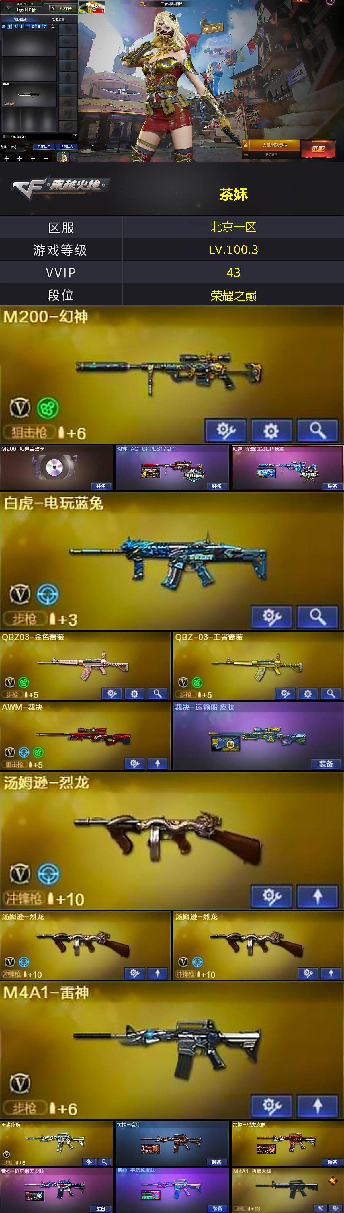 - [12957289]陕西一区-14V-0王者-0炫金 【传说武器】:传说幽瞳 【热门武器】:传说幽瞳,修罗-古蛇迷踪 【角色】:瞳 【英雄级武器】:M4A1-雷神,M4A1-赤狱骑士,修罗-古蛇迷踪,沙鹰-天神*5,麒麟刺*3,屠龙 【特殊枪械】: