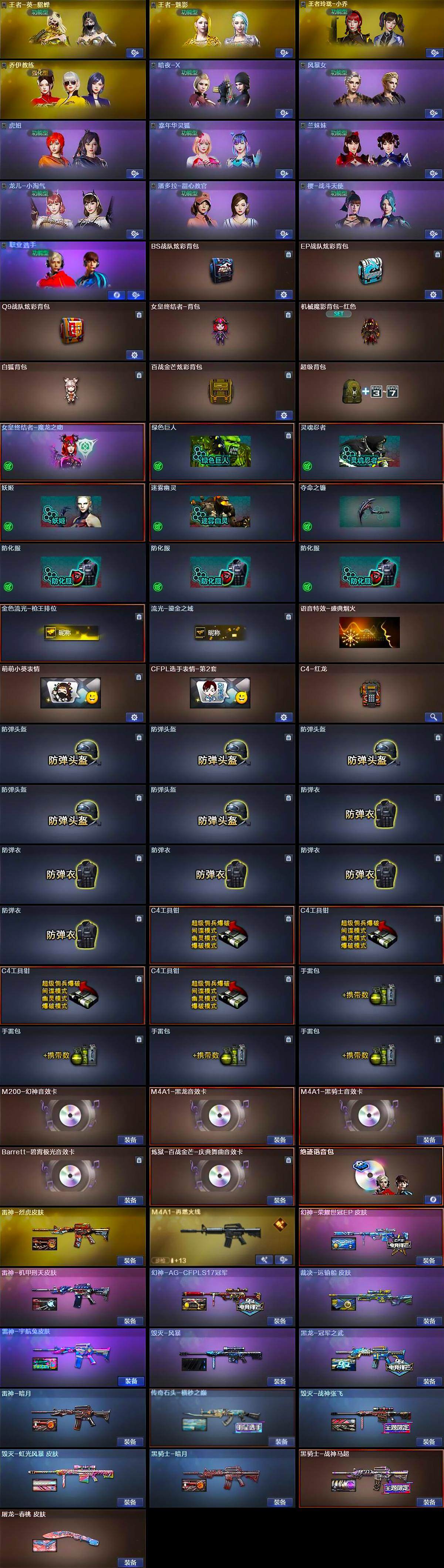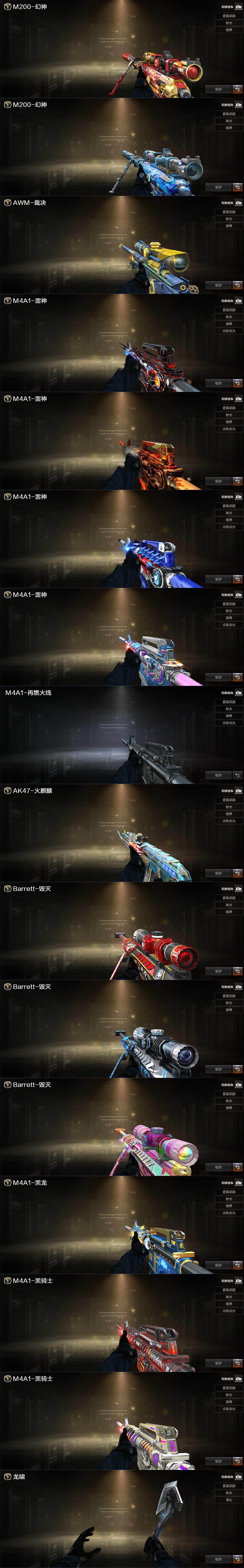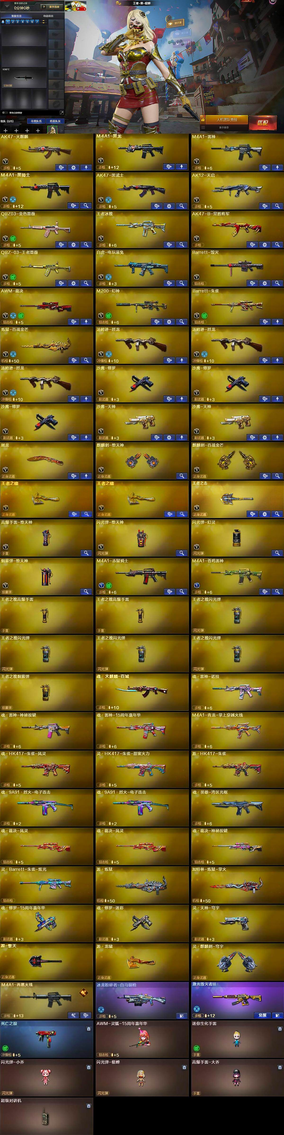 【英雄级武器】:AK47-火麒麟,M4A1-黑龙,M4A1-雷神,M4A1-黑骑士,AK47-黑武士,AK12-天启,QBZ03-金色蔷薇,王者冰魄-觉醒版,AK47-B-常胜将军,QBZ-03-王者蔷薇-觉醒版,白虎-电玩蓝兔,Barrett-毁灭,AWM-裁决,M200-幻神,Barrett-朱雀,炼狱-百战金芒,汤姆逊-烈龙*3,沙鹰-修罗*3,沙鹰-天神*2,屠龙,麒麟刺-堕天神,麒麟刺-百战金芒,王者之啸-觉醒版*2,王者之击-觉醒版,高爆手雷-堕天神,闪光弹-堕天神,闪光弹-幻灵,烟雾弹-堕天神,烟雾弹-荣耀世冠EP*2,M4A1-赤狱骑士,M4A1-苍鸣雷神