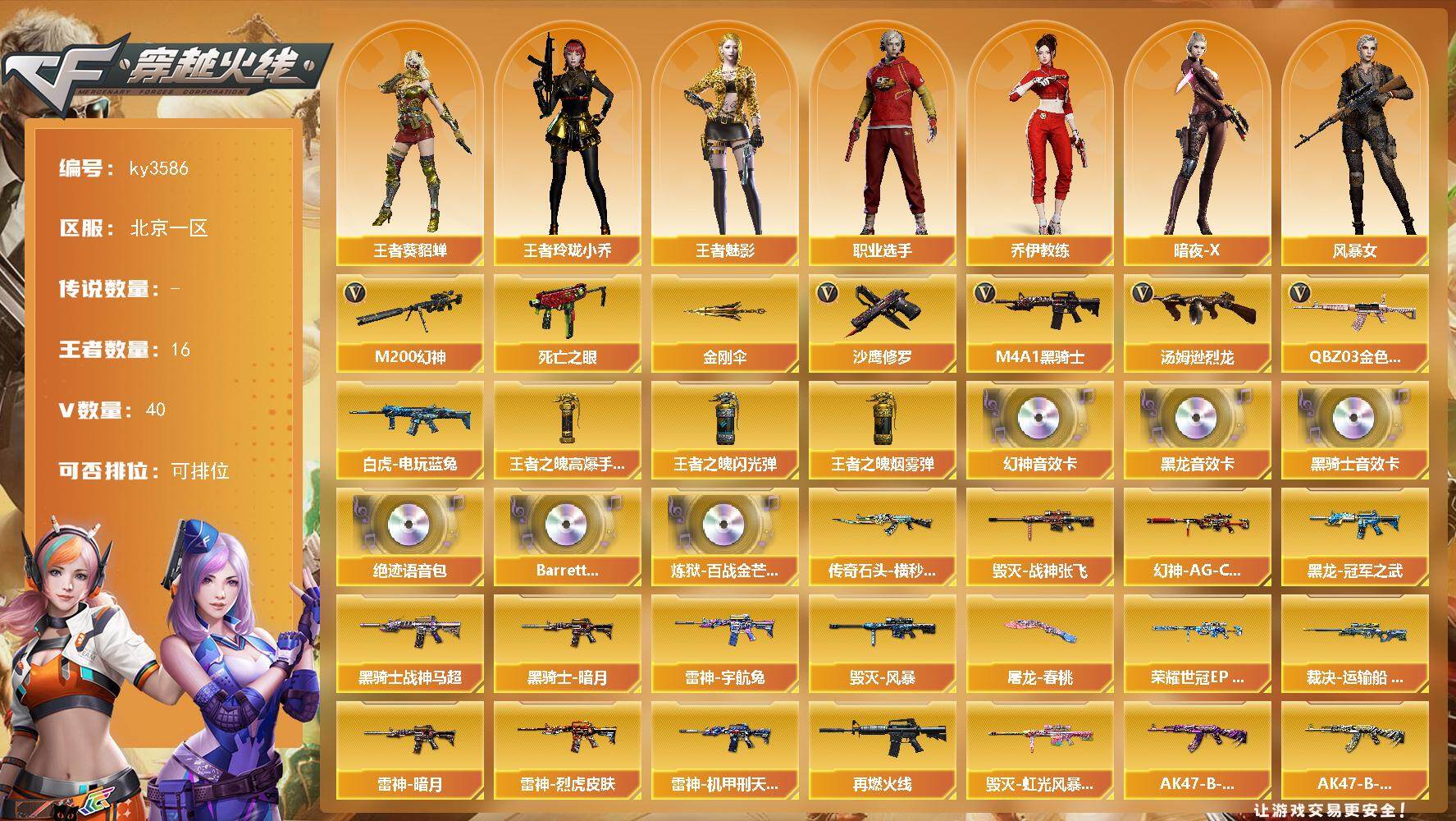 [13852027]北京一区-40V-16王者-0炫金 【热门武器】:QBZ03-金色蔷薇,M200-幻神,死亡之眼,白虎-电玩蓝兔,M4A1-黑骑士,汤姆逊-烈龙*3,沙鹰-修罗*3,金刚伞 【王者炫金武器】:王者之魄高爆手雷*2,王者之魄闪光弹*4,王者之魄烟雾弹 【音效卡】:M200-幻神音效卡,M4A1-黑龙音效卡,M4A1-黑骑士音效卡,绝迹语音包,Barrett-碧霄极光音效卡,炼狱-百战金芒-庆典舞曲音效卡 【皮肤】:幻神-AG-CFPLS17冠军,幻神-荣耀世冠EP 皮肤,裁决-运输船 皮肤,雷神-暗月,雷神-烈虎皮肤,雷神-机甲刑天皮肤,雷神-宇航兔皮肤,M4A1-再燃火线,传奇石头-横秒之巅,毁灭-战神张飞,毁灭-风暴,毁灭-虹光风暴 皮肤,黑龙-冠军之武,黑骑士-暗月,黑骑士-战神马超,AK47-B-常胜将军-曹操,AK47-B-常胜将军-刘备*3,AK47-B-常胜将军-孙权,屠龙-春桃 皮肤,轻型军用手斧-再燃火线 【角色】:王者-葵-貂蝉,王者-魅影,王者玲珑-小乔,乔伊教练,暗夜-X,风暴女,虎妞,嘉年华灵狐,兰妹妹,龙儿-小淘气,潘多拉-甜心教官,樱-战斗天使,职业选手 【人偶武器】:AWM-灵狐-15周年嘉年华,迷你生化手雷,闪光弹-小乔,闪光弹-貂蝉,高爆手雷-大乔 【暴走生化】:死亡之眼,超级对讲机 【挑战大师】:冰龙粉碎者-白马银枪,激光毁灭者III 【英雄级武器】:AK47-火麒麟,M4A1-黑龙,M4A1-雷神,M4A1-黑骑士,AK47-黑武士,AK12-天启,QBZ03-金色蔷薇,王者冰魄-觉醒版,AK47-B-常胜将军,QBZ-03-王者蔷薇-觉醒版,白虎-电玩蓝兔,Barrett-毁灭,AWM-裁决,M200-幻神,Barrett-朱雀,炼狱-百战金芒,汤姆逊-烈龙*3,沙鹰-修罗*3,沙鹰-天神*2,屠龙,麒麟刺-堕天神,麒麟刺-百战金芒,王者之啸-觉醒版*2,王者之击-觉醒版,高爆手雷-堕天神,闪光弹-堕天神,闪光弹-幻灵,烟雾弹-堕天神,烟雾弹-荣耀世冠EP*2,M4A1-赤狱骑士,M4A1-苍鸣雷神 【道具】:BS战队炫彩背包,EP战队炫彩背包,Q9战队炫彩背包,女皇终结者-背包,机械魔影背包-红色,白狐背包,百战金芒炫彩背包,超级背包,女皇终结者-魔龙之吻,绿色巨人,灵魂忍者,妖姬,迷雾幽灵,夺命之镰,防化服*3,金色流光