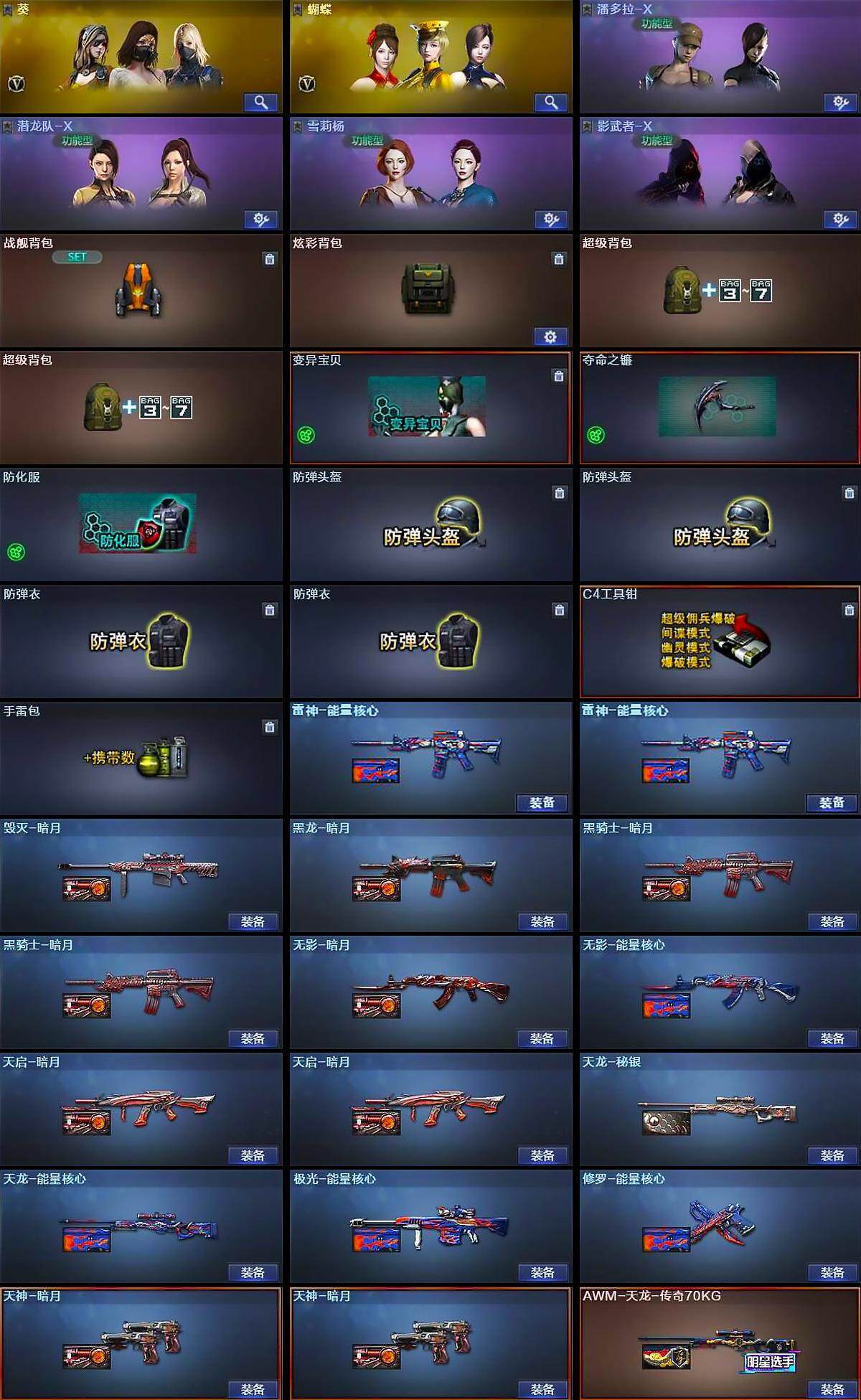 【皮肤】:雷神-能量核心*2,毁灭-暗月,黑龙-暗月,黑骑士-暗月*2,无影-暗月,无影-能量核心,天启-暗月*2,天龙-秘银,天龙-能量核心,AWM-天龙-传奇70KG,极光-能量核心,修罗-能量核心,天神-暗月*2