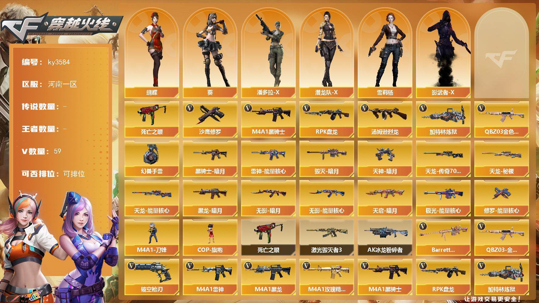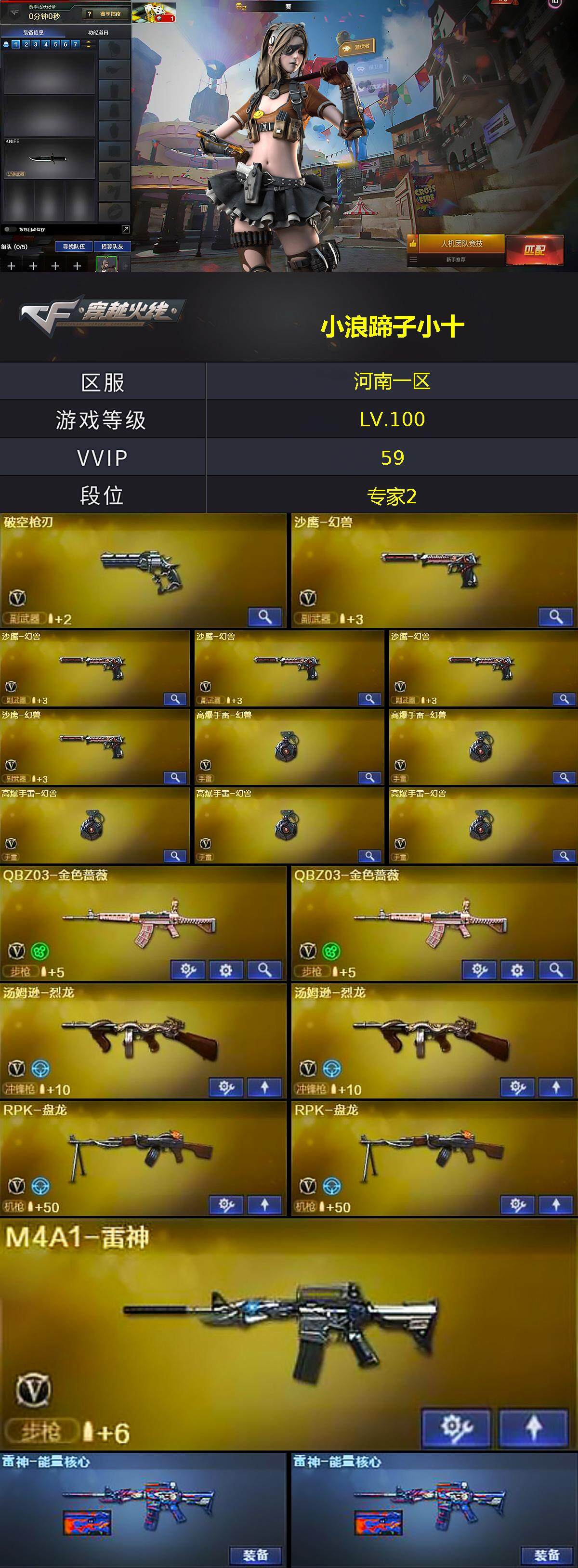 [13852327]河南一区-59V-0王者-0炫金 【热门武器】:QBZ03-金色蔷薇*2,死亡之眼*2,M4A1-黑骑士,汤姆逊-烈龙*2,RPK-盘龙*2,加特林-炼狱*2,沙鹰-修罗*2,高爆手雷-幻兽*5 【皮肤】:雷神-能量核心*2,毁灭-暗月,黑龙-暗月,黑骑士-暗月*2,无影-暗月,无影-能量核心,天启-暗月*2,天龙-秘银,天龙-能量核心,AWM-天龙-传奇70KG,极光-能量核心,修罗-能量核心,天神-暗月*2 【角色】:葵,蝴蝶,潘多拉-X,潜龙队-X,雪莉杨,影武者-X 【人偶武器】:COP-旗袍,M4A1-刀锋 【暴走生化】:死亡之眼*2 【挑战大师】:AK47-冰龙粉碎者*2,激光毁灭者III 【英雄级武器】:AK47-火麒麟*2,M4A1-黑龙,M4A1-雷神,M4A1-黑骑士,AK47-无影,AK12-天启,M4A1-玫瑰精灵,QBZ95-幻兽,QBZ03-金色蔷薇*2,AK-47-猩红传说*2,AWM-天龙,Barrett-毁灭,Barrett-极光*2,Barrett-金色蔷薇*2,RPK-盘龙*2,加特林-炼狱*2,汤姆逊-烈龙*2,沙鹰-修罗*2,沙鹰-天神,破空枪刃,沙鹰-幻兽*5,屠龙*3,龙啸,擎天*2,麒麟刺,女皇利刃-幻兽,高爆手雷-幻兽*5,闪光弹-幻兽*5,烟雾弹-幻兽*5 【道具】:战舰背包,炫彩背包,超级背包*2,变异宝贝,夺命之镰,防化服,防弹头盔*2,防弹衣*2,C4工具钳,手雷包 【特殊枪械】:1黑骑士,2烈龙,2盘龙,2炼狱