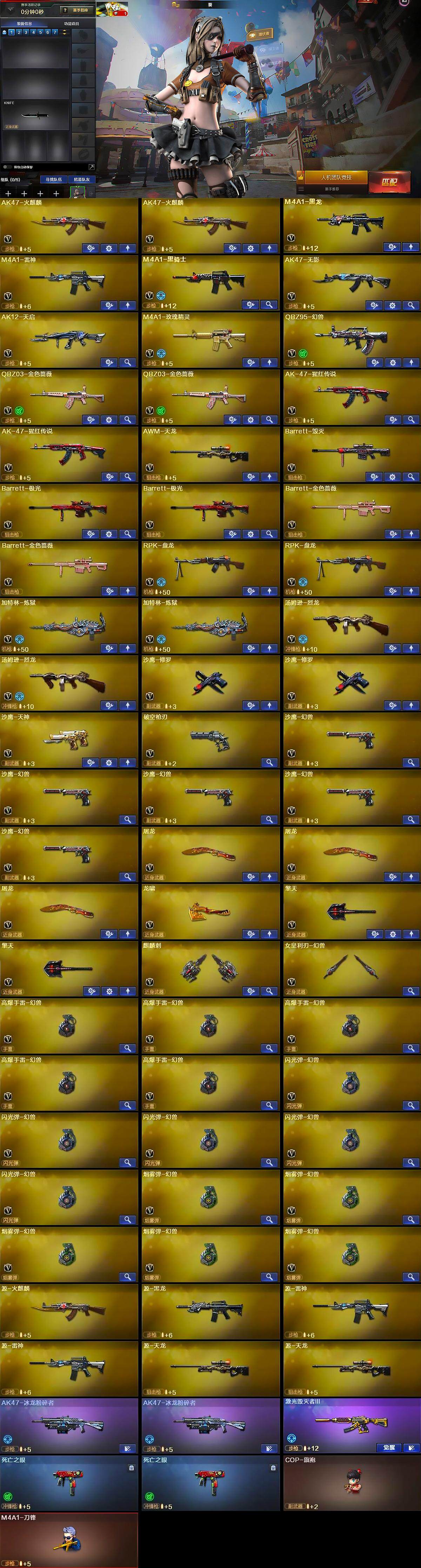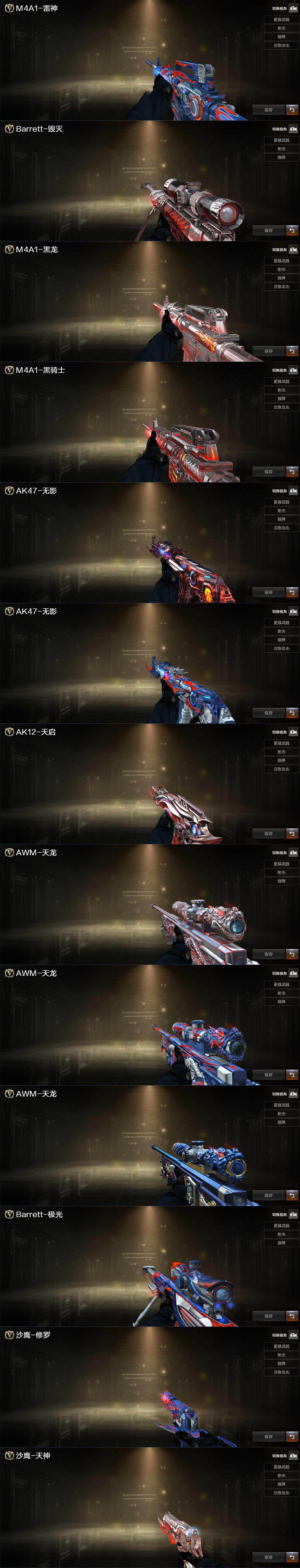 【英雄级武器】:AK47-火麒麟*2,M4A1-黑龙,M4A1-雷神,M4A1-黑骑士,AK47-无影,AK12-天启,M4A1-玫瑰精灵,QBZ95-幻兽,QBZ03-金色蔷薇*2,AK-47-猩红传说*2,AWM-天龙,Barrett-毁灭,Barrett-极光*2,Barrett-金色蔷薇*2,RPK-盘龙*2,加特林-炼狱*2,汤姆逊-烈龙*2,沙鹰-修罗*2,沙鹰-天神,破空枪刃,沙鹰-幻兽*5,屠龙*3,龙啸,擎天*2,麒麟刺,女皇利刃-幻兽,高爆手雷-幻兽*5,闪光弹-幻兽*5,烟雾弹-幻兽*5