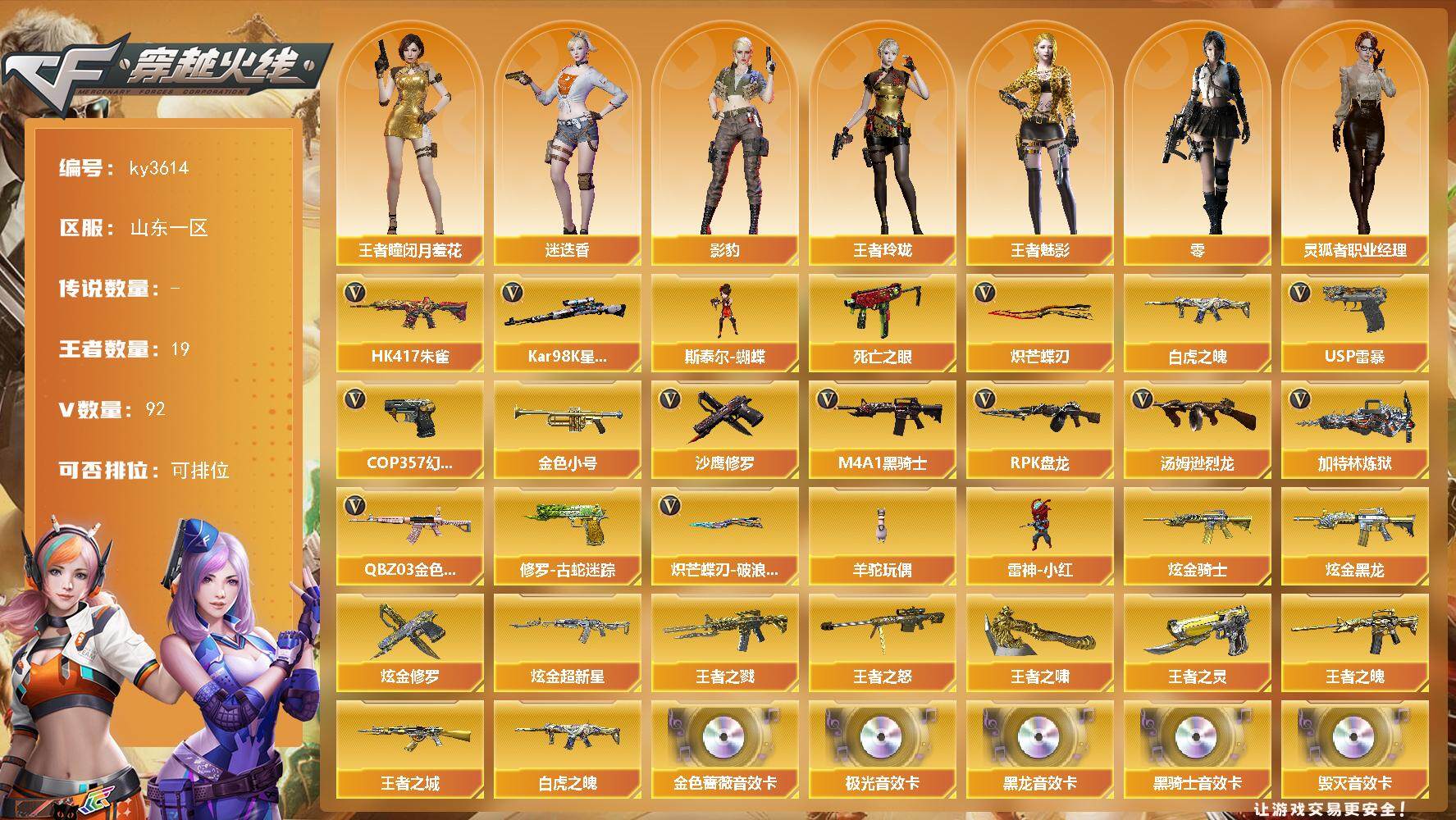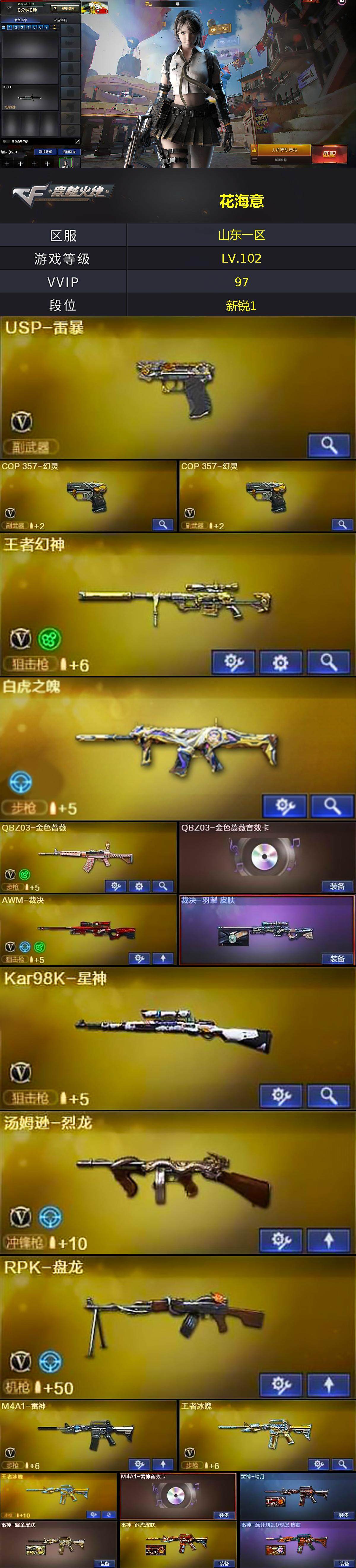 [13852637]山东一区-92V-19王者-6炫金 【热门武器】:QBZ03-金色蔷薇,HK417-朱雀,修罗-古蛇迷踪,死亡之眼,白虎之魄,Kar98K-星神,金色小号,M4A1-黑骑士,汤姆逊-烈龙,RPK-盘龙,加特林-炼狱*2,斯泰尔-蝴蝶,羊驼玩偶,雷神-小红,USP-雷暴,COP 357-幻灵*2,沙鹰-修罗*3,炽芒蝶刃,炽芒蝶刃-破浪逐光 皮肤 【王者炫金武器】:王者之城,王者之戮,王者之魄,白虎之魄,王者之怒,王者之灵,王者之啸,炫金骑士,炫金黑龙,炫金超新星,炫金修罗*3 【音效卡】:AK47-火麒麟音效卡,M4A1-雷神音效卡,M4A1-黑龙音效卡,M4A1-黑骑士音效卡,Barrett-毁灭音效卡,Barrett-极光音效卡,QBZ03-金色蔷薇音效卡 【皮肤】:裁决-羽掣 皮肤,雷神-暗月,雷神-耀金皮肤,雷神-烈虎皮肤,雷神-源计划2.0专属 皮肤,火麒麟-平天大圣,火麒麟-百城,毁灭耀金皮肤,毁灭-星空,毁灭-黑大圣皮肤*2,黑龙-墨子皮肤,黑骑士-破界 皮肤,无影耀金皮肤,天龙-能量核心,AWM-天龙-传奇70KG,AWM-天龙-传奇白鲨,极光-能量核心,屠龙-荣耀之锋,龙啸-冠军之啸,擎天-秘银,炽芒蝶刃-破浪逐光 皮肤 【角色】:零,迷迭香,影豹,王者-瞳-闭月羞花,王者玲珑,王者-魅影,蛇隐宗,奇洋探员,暗夜-X,北极狐-X,初恋灵狐,飞虎队-X,风暴女,虎妞,嘉年华灵狐,兰妹妹,0号玩家,灵狐-花神,灵狐者-X,灵狐者-黄金海岸,灵狐者-职业经理,龙儿,龙儿-小淘气,麻雀,曼陀罗-礼服,潘多拉-X,潘多拉-甜心教官,潜龙队-X,邱刚敖,青霞仙子,蛇姬,斯沃特-X,蜀雪,铁骑荣耀,兔囡囡,新娜塔莎,夜玫瑰-幻能朋克,夜玫瑰-宠粉,樱-战斗天使,影武者-X,游珑儿 【人偶武器】:雷神-小红,火麒麟-灵狐*2,斯泰尔-蝴蝶,AWM-灵狐-15周年嘉年华,M37-葵,迷你深渊冰龙,迷你波特博士,夺魂,迷你牛牛,迷你火种,生化手雷-机甲核心,深渊终结者手雷*3,迷你巨石泰坦-魔花研究所 【暴走生化】:死亡之眼,超级对讲机 【挑战大师】:神圣爆裂者III,AK47-冰龙粉碎者,机甲撕裂者III,神圣爆裂者-末日III,阐释者III 【英雄级武器】:AK47-火麒麟,M4A1-黑龙,M4A1-雷神,M4A1-黑骑士,AK47-无影,AK47-黑武士,AK
