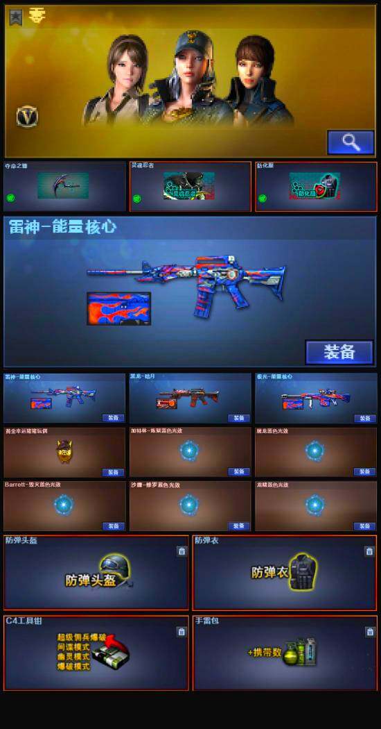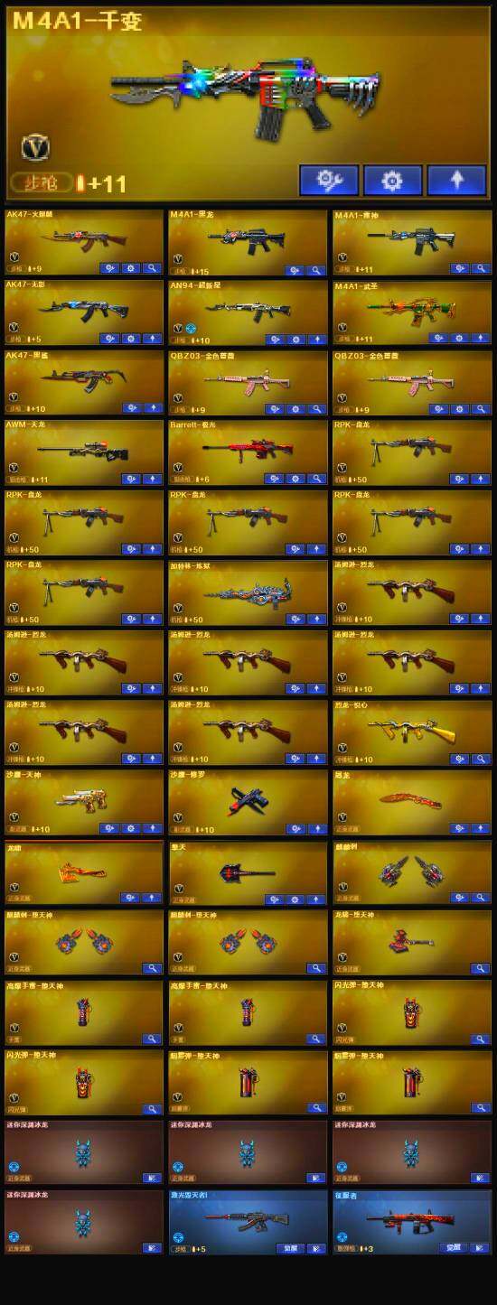 【英雄级武器】:M4A1-千变,AK47-火麒麟,M4A1-黑龙,M4A1-雷神,AK47-无影,AN94-超新星,M4A1-武圣,AK47-黑鲨,QBZ03-金色蔷薇*2,AWM-天龙,Barrett-极光,RPK-盘龙*5,加特林-炼狱,汤姆逊-烈龙*6,烈龙-悦心-觉醒版,沙鹰-修罗,沙鹰-天神,屠龙,龙啸,麒麟刺-堕天神*2,擎天,麒麟刺,龙啸-堕天神,高爆手雷-堕天神*2,闪光弹-堕天神*2,烟雾弹-堕天神*2