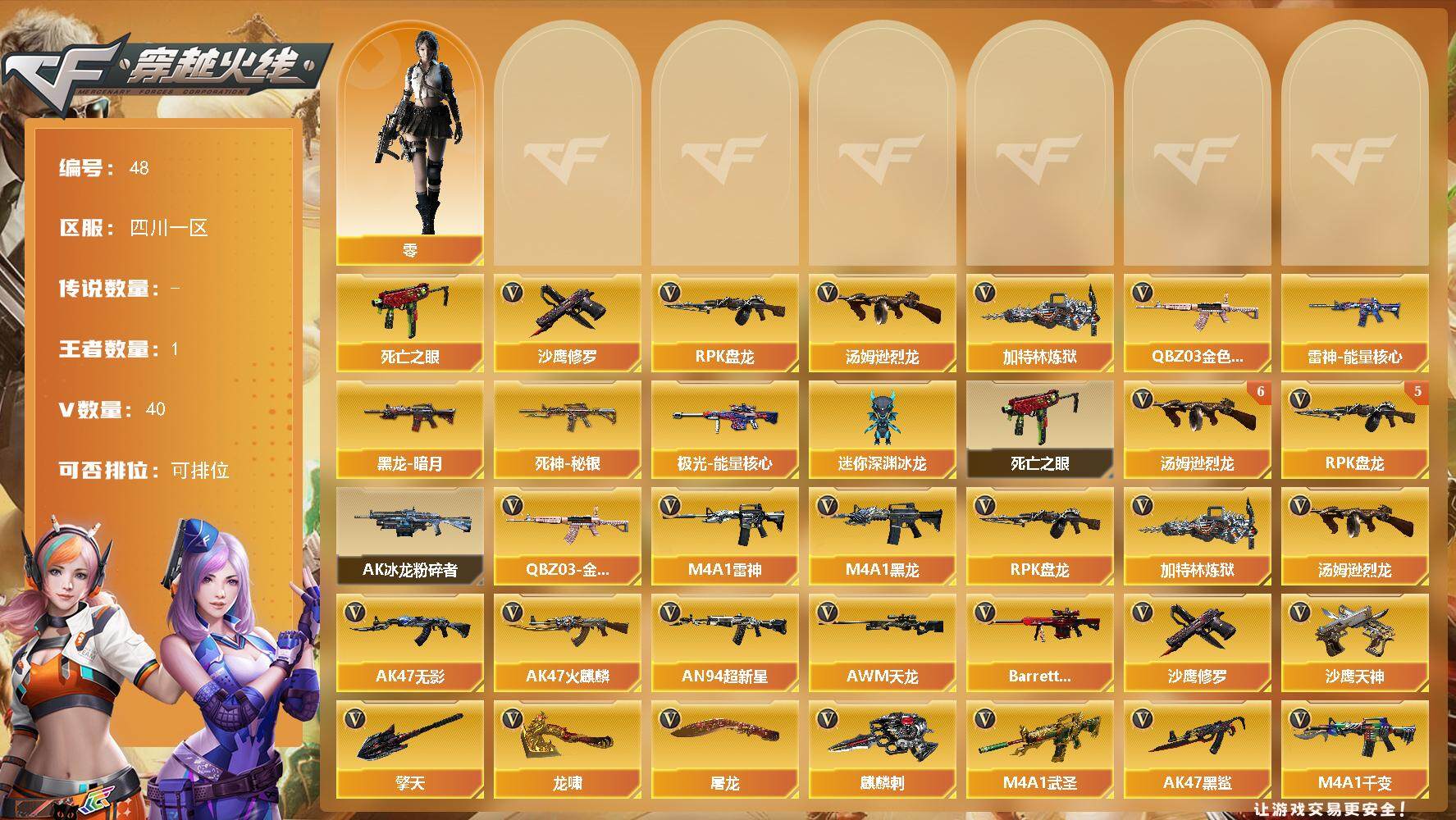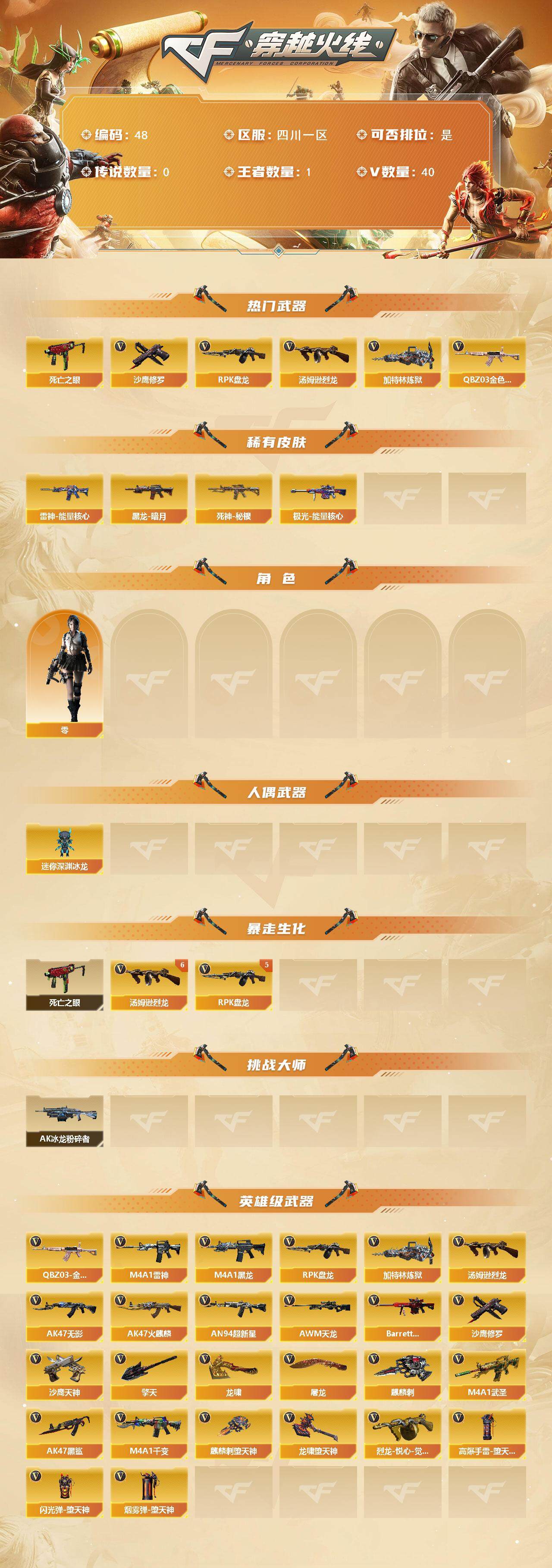 [13655061]四川一区-40V-1王者-0炫金 【热门武器】:QBZ03-金色蔷薇*2,死亡之眼,汤姆逊-烈龙*6,RPK-盘龙*5,加特林-炼狱,沙鹰-修罗 【皮肤】:雷神-能量核心*2,黑龙-暗月,死神-秘银,极光-能量核心 【角色】:零 【人偶武器】:迷你深渊冰龙*4 【暴走生化】:死亡之眼 【挑战大师】:AK47-冰龙粉碎者 【英雄级武器】:M4A1-千变,AK47-火麒麟,M4A1-黑龙,M4A1-雷神,AK47-无影,AN94-超新星,M4A1-武圣,AK47-黑鲨,QBZ03-金色蔷薇*2,AWM-天龙,Barrett-极光,RPK-盘龙*5,加特林-炼狱,汤姆逊-烈龙*6,烈龙-悦心-觉醒版,沙鹰-修罗,沙鹰-天神,屠龙,龙啸,麒麟刺-堕天神*2,擎天,麒麟刺,龙啸-堕天神,高爆手雷-堕天神*2,闪光弹-堕天神*2,烟雾弹-堕天神*2 【道具】:灵魂忍者,夺命之镰,防化服,防弹头盔,防弹衣,C4工具钳,手雷包 【特殊枪械】:6烈龙,5盘龙,1炼狱