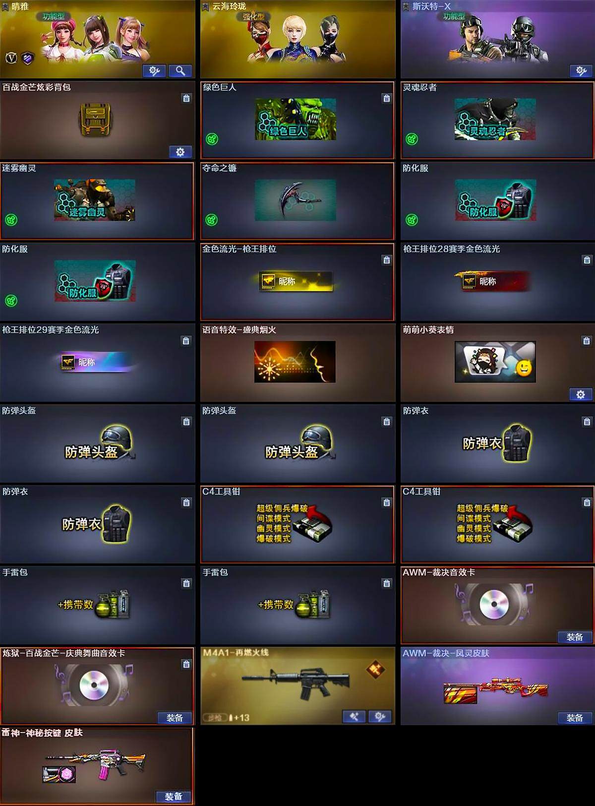 【道具】:百战金芒炫彩背包,绿色巨人,灵魂忍者,迷雾幽灵,夺命之镰,防化服*2,金色流光-枪王排位,枪王排位28赛季金色流光,枪王排位29赛季金色流光,语音特效-盛典烟火,萌萌小葵表情,防弹头盔*2,防弹衣*2,C4工具钳*2,手雷包*2