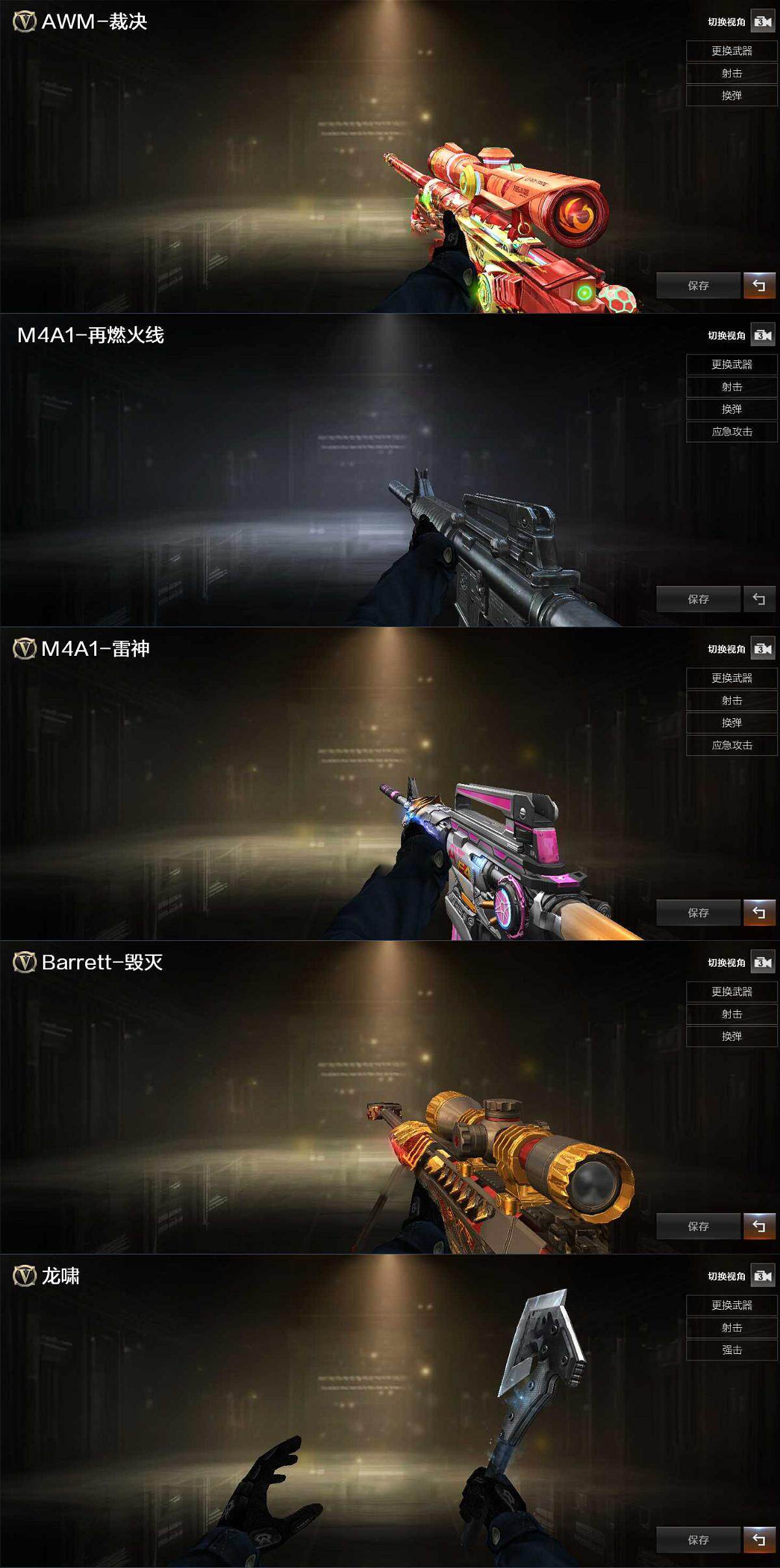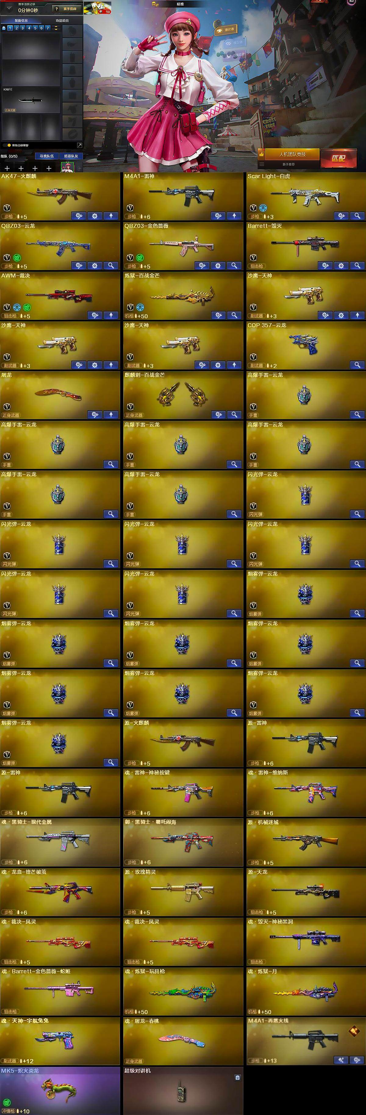 【英雄级武器】:AK47-火麒麟,M4A1-雷神,Scar Light-白虎,QBZ03-云龙,QBZ03-金色蔷薇,Barrett-毁灭,AWM-裁决,炼狱-百战金芒,沙鹰-天神*3,COP 357-云龙,屠龙,麒麟刺-百战金芒,高爆手雷-云龙*6,闪光弹-云龙*6,烟雾弹-云龙*8