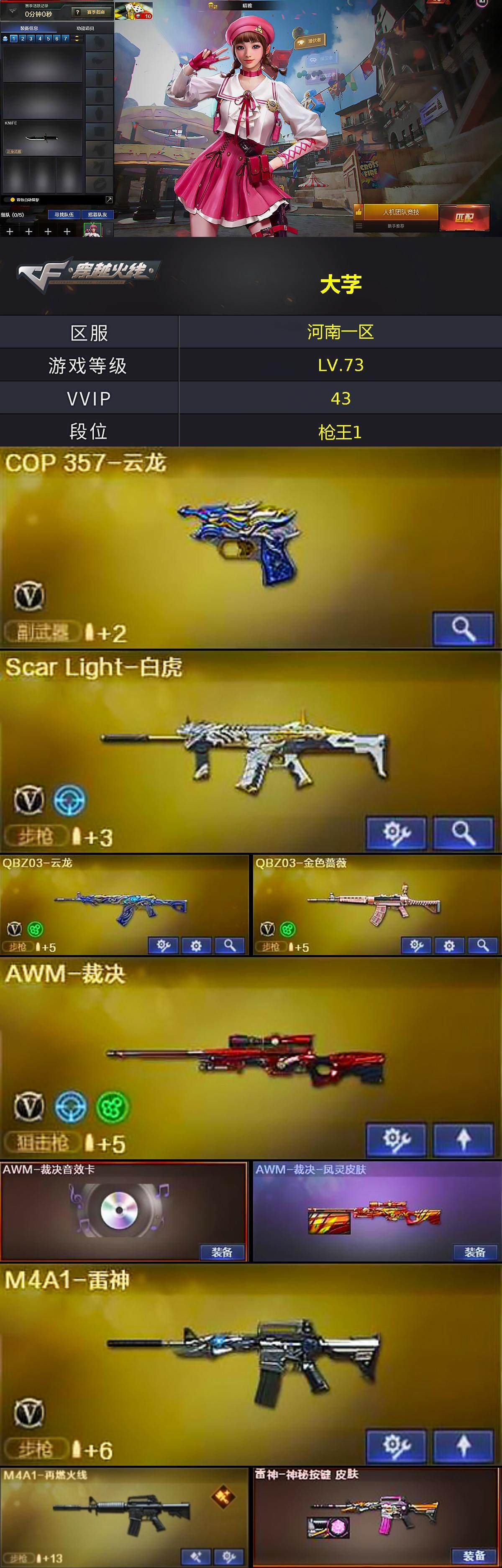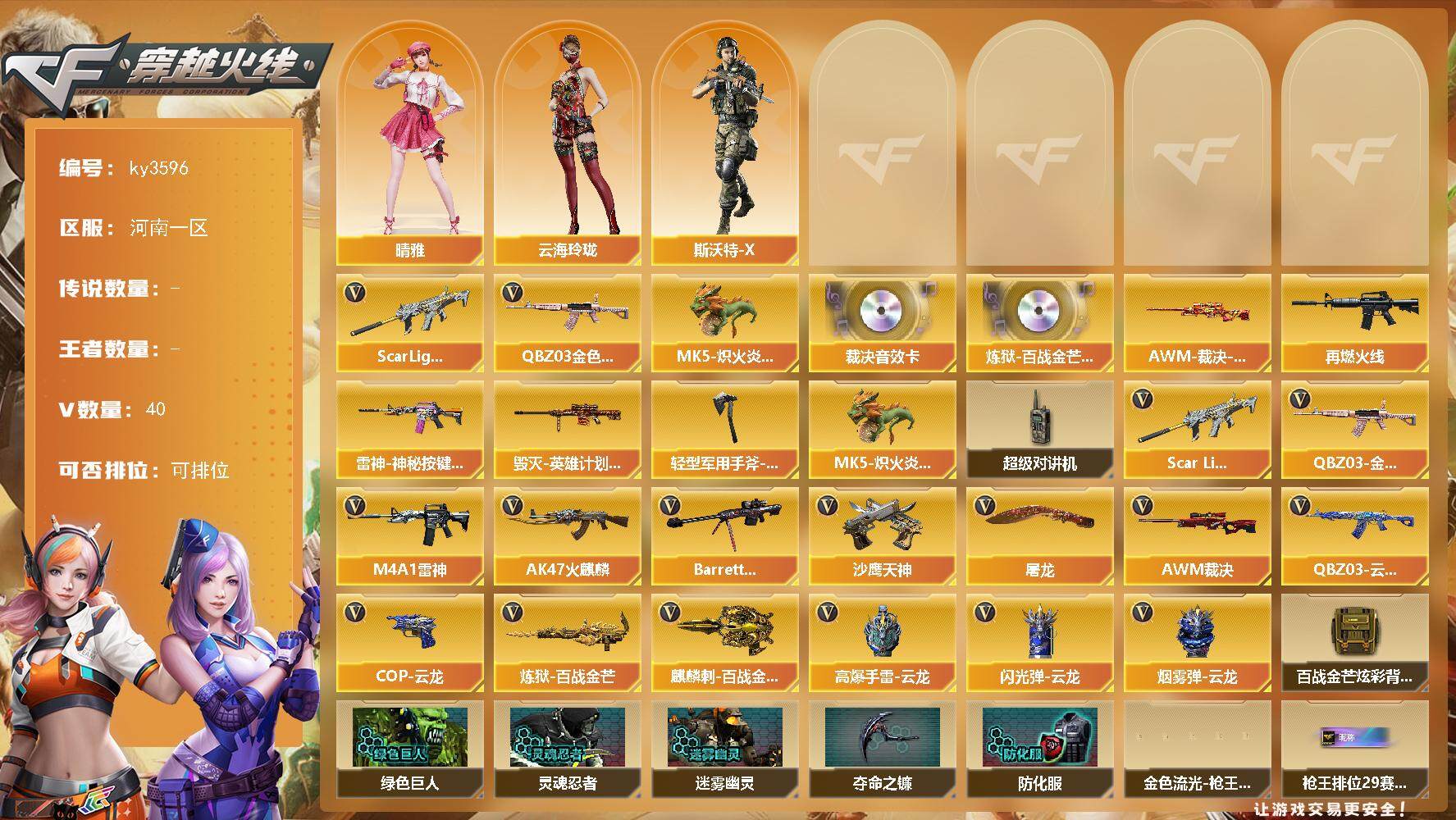 [13854777]河南一区-40V-0王者-0炫金 【热门武器】:QBZ03-金色蔷薇,Scar Light-白虎,MK5-炽火炎龙 【音效卡】:AWM-裁决音效卡,炼狱-百战金芒-庆典舞曲音效卡 【皮肤】:AWM-裁决-凤灵皮肤,M4A1-再燃火线,雷神-神秘按键 皮肤,毁灭-英雄计划 皮肤,轻型军用手斧-再燃火线 【角色】:晴雅,云海玲珑,斯沃特-X 【人偶武器】:MK5-炽火炎龙 【暴走生化】:超级对讲机 【英雄级武器】:AK47-火麒麟,M4A1-雷神,Scar Light-白虎,QBZ03-云龙,QBZ03-金色蔷薇,Barrett-毁灭,AWM-裁决,炼狱-百战金芒,沙鹰-天神*3,COP 357-云龙,屠龙,麒麟刺-百战金芒,高爆手雷-云龙*6,闪光弹-云龙*6,烟雾弹-云龙*8 【道具】:百战金芒炫彩背包,绿色巨人,灵魂忍者,迷雾幽灵,夺命之镰,防化服*2,金色流光-枪王排位,枪王排位28赛季金色流光,枪王排位29赛季金色流光,语音特效-盛典烟火,萌萌小葵表情,防弹头盔*2,防弹衣*2,C4工具钳*2,手雷包*2 【特殊枪械】:1白虎