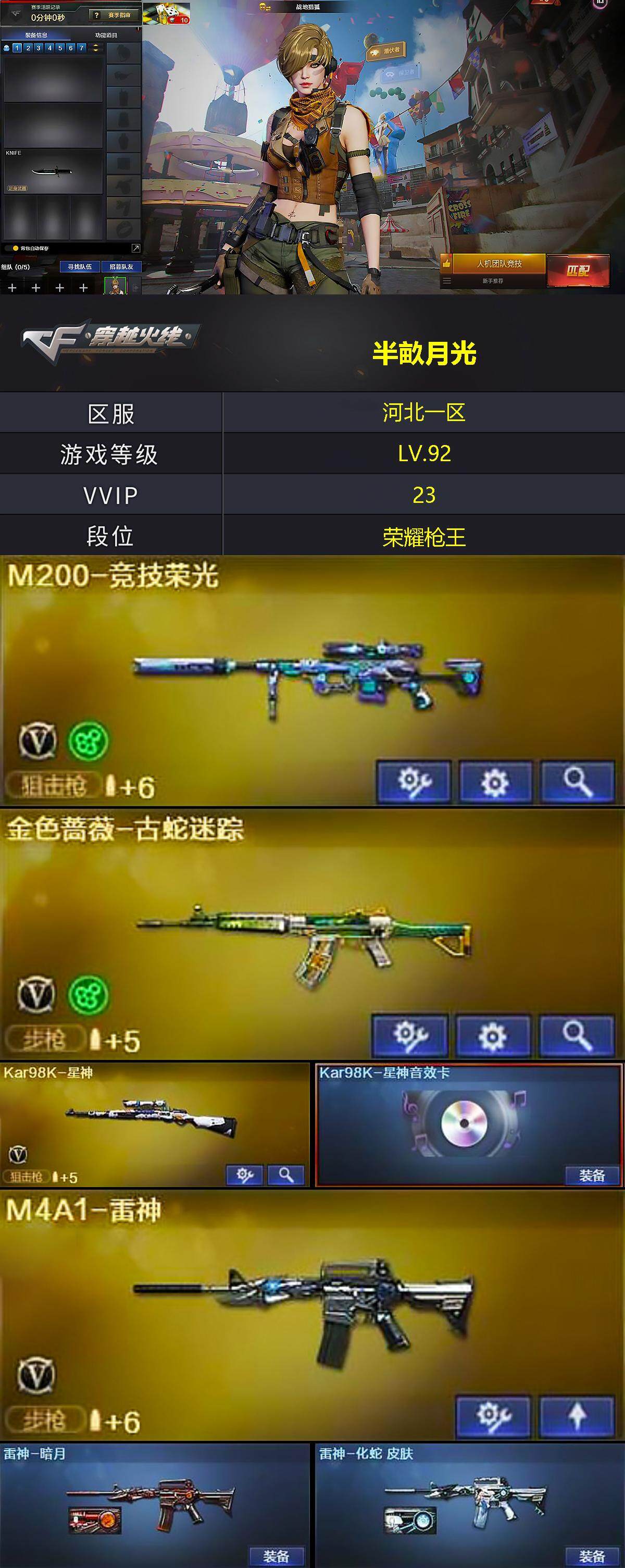 [13655111]河北一区-19V-0王者-0炫金 【热门武器】:金色蔷薇-古蛇迷踪,修罗-古蛇迷踪,M200-竞技荣光,Kar98K-星神,炽芒蝶刃 【音效卡】:Kar98K-星神音效卡,Barrett-碧霄极光音效卡 【皮肤】:雷神-暗月,雷神-化蛇 皮肤,Barrett-金色蔷薇-蛇姬 皮肤,龙啸-蛇姬 皮肤 【角色】:战地猎狐,蛇隐宗,奇洋探员,乔伊教练,修道士,云海玲珑,电竞少女,芳心审判者,猎狐者-追月,灵狐者-X,灵狐者-黄金海岸,龙儿,潘多拉-甜心教官,蛇姬,斯沃特-X,兔囡囡,维纳斯,新娜塔莎,雪莉杨-摸金校尉,夜玫瑰-宠粉,智影 【人偶武器】:星神-炽天使,AWM-灵狐-15周年嘉年华 【英雄级武器】:M4A1-雷神,金色蔷薇-古蛇迷踪,Kar98K-星神,M200-竞技荣光,AA-12-雷霆,修罗-古蛇迷踪,擎天-竞技荣光,炽芒蝶刃,高爆手雷-竞技荣光*3,高爆手雷-古蛇迷踪,闪光弹-竞技荣光*3,烟雾弹-竞技荣光*3,烟雾弹-古蛇迷踪,M4A1-赤狱骑士,AWM-昌龙,Barrett-碧霄极光 【道具】:云山科技背包,亚洲杯纪念炫彩背包,古蛇迷踪炫彩背包,奇洋探员-海龟背包,超级背包,女皇终结者-魔龙之吻,救世主-黑桃战神,绿色巨人,灵魂忍者,迷雾幽灵,夺命之镰,防化服*3,流光-鎏金之域,流光-再燃火线,枪王排位28赛季金色流光,枪王排位29赛季金色流光,古蛇迷踪打击特效,蛇隐宗表情,云海游龙表情*2,C4-再燃火线,防弹头盔*4,防弹衣*4,C4工具钳*4,手雷包*4 【特殊枪械】: