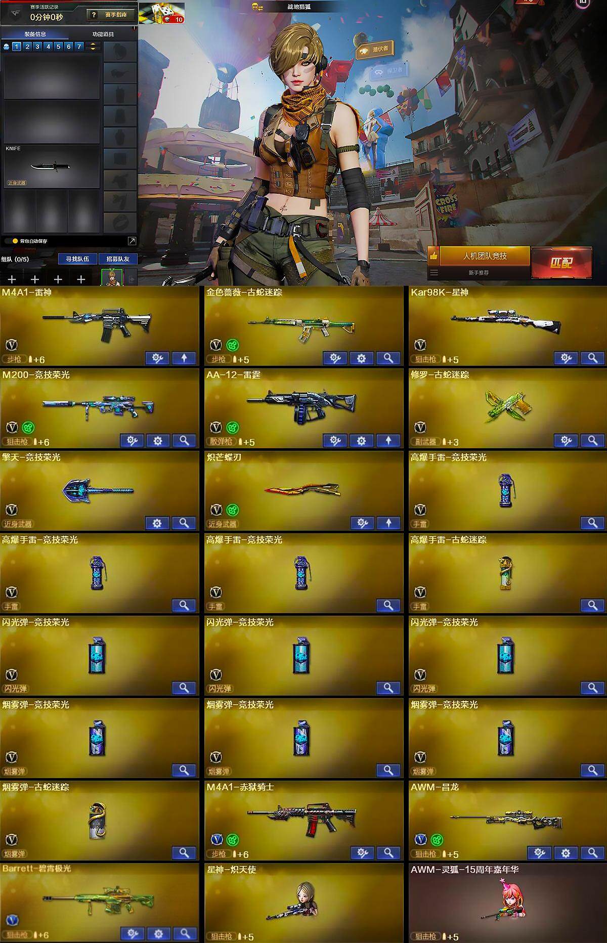 【英雄级武器】:M4A1-雷神,金色蔷薇-古蛇迷踪,Kar98K-星神,M200-竞技荣光,AA-12-雷霆,修罗-古蛇迷踪,擎天-竞技荣光,炽芒蝶刃,高爆手雷-竞技荣光*3,高爆手雷-古蛇迷踪,闪光弹-竞技荣光*3,烟雾弹-竞技荣光*3,烟雾弹-古蛇迷踪,M4A1-赤狱骑士,AWM-昌龙,Barrett-碧霄极光