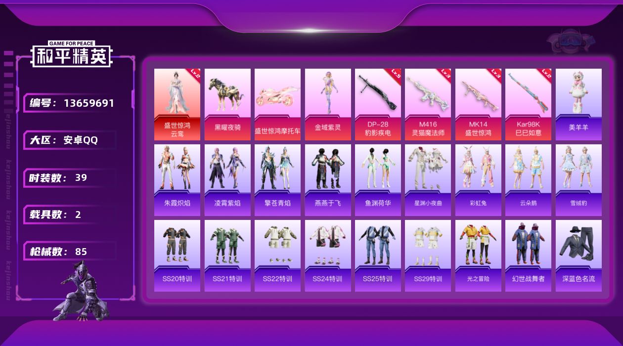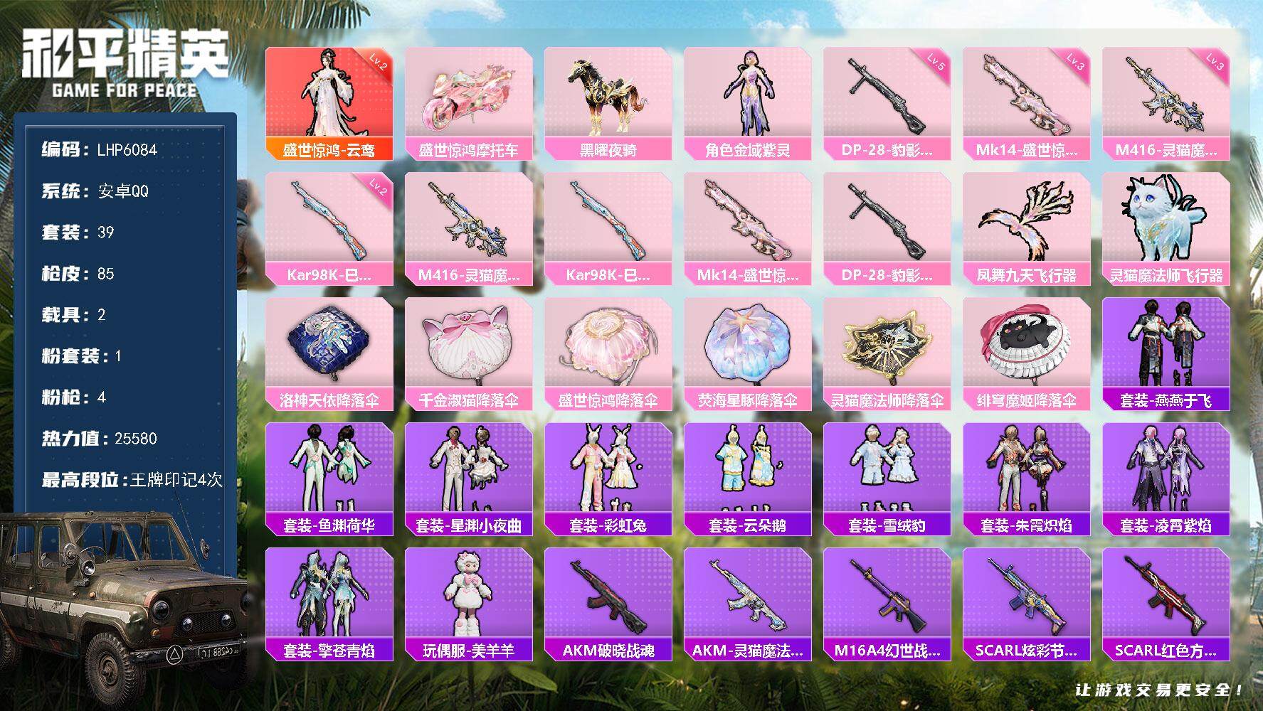 [13659691]【店主推荐捡漏号!可直接换绑】/素材身法号/扭蛋碎片680/地铁满天赋 安卓 手Q-1神装-1粉装-4特效枪-2载具-2粉色飞行器-2.5w热力值-4王牌印记-39套装-85枪皮【红色神装等级】:盛世惊鸿-云鸾(二级)【粉色载具】:盛世惊鸿摩托车,黑曜夜骑【粉色套装】:角色-金域紫灵【粉色枪皮等级】:M416-灵猫魔法师(三级),Kar98K-巳巳如意(二级),Mk14-盛世惊鸿(三级),DP-28-豹影疾电(五级)【粉色飞行器】:凤舞九天飞行器,灵猫魔法师飞行器