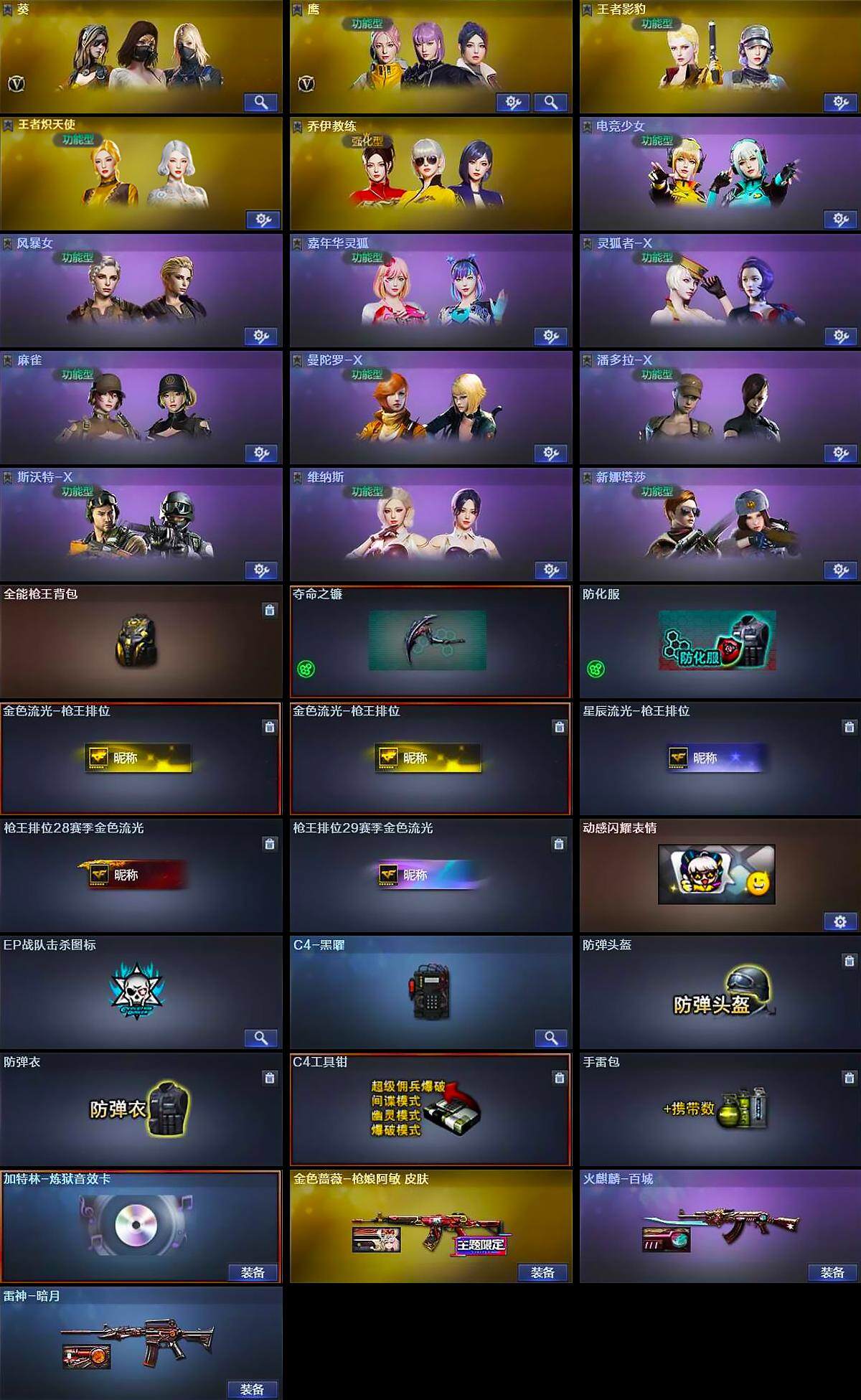 【道具】:全能枪王背包,夺命之镰,防化服,金色流光-枪王排位*2,星辰流光-枪王排位,枪王排位28赛季金色流光,枪王排位29赛季金色流光,动感闪耀表情,EP战队击杀图标,C4-黑曜,防弹头盔,防弹衣,C4工具钳,手雷包