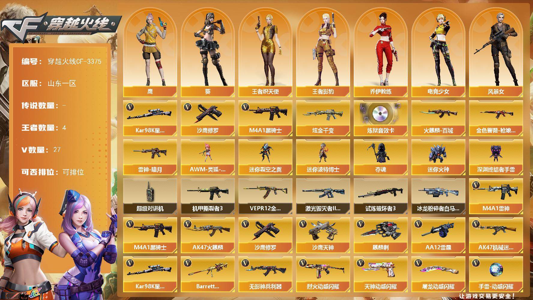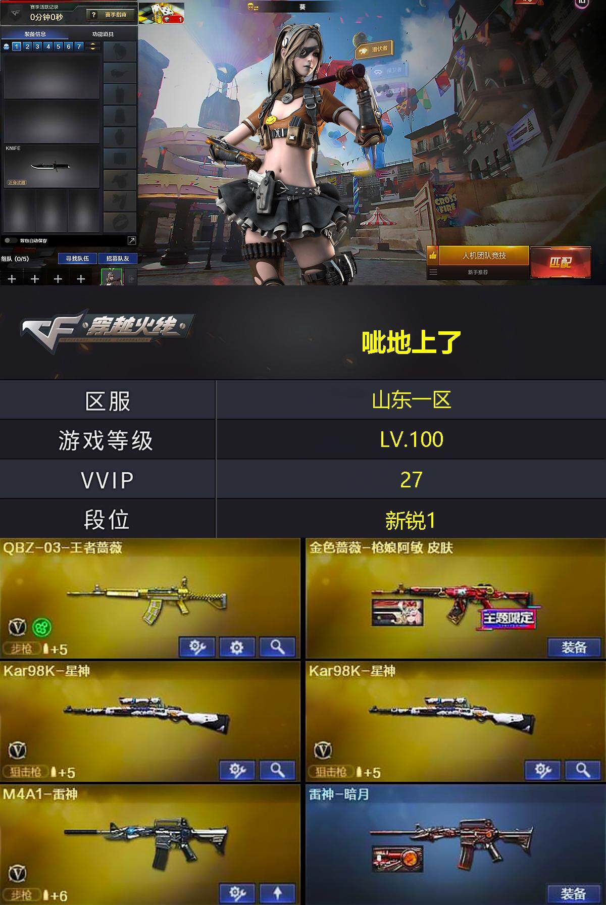 [13862517]山东一区-27V-4王者-1炫金 【热门武器】:Kar98K-星神*2,M4A1-黑骑士,沙鹰-修罗 【王者炫金武器】:炫金千变 【音效卡】:加特林-炼狱音效卡 【皮肤】:金色蔷薇-枪娘阿敏 皮肤,雷神-暗月,火麒麟-百城 【角色】:葵,鹰,王者影豹,王者炽天使,乔伊教练,电竞少女,风暴女,嘉年华灵狐,灵狐者-X,麻雀,曼陀罗-X,潘多拉-X,赛斯-X,斯沃特-X,维纳斯,新娜塔莎 【人偶武器】:AWM-灵狐-15周年嘉年华,迷你裂空之翼,迷你波特博士,夺魂,迷你火种,深渊终结者手雷*2 【暴走生化】:超级对讲机 【挑战大师】:冰龙粉碎者-白马银枪*2,激光毁灭者III-白马银枪,VEPR-12-金魔,机甲撕裂者III,试炼破坏者III 【英雄级武器】:AK47-火麒麟,M4A1-雷神,M4A1-黑骑士,AK47-机械迷城,无影-神兵利器,烈火-动感闪耀,QBZ-03-王者蔷薇-觉醒版,Barrett-朱雀,Kar98K-星神*2,王者之光-觉醒版,AA-12-雷霆,沙鹰-修罗,沙鹰-天神,天神-动感闪耀,麒麟刺*3,屠龙-动感闪耀,高爆手雷-幻灵*2,手雷-动感闪耀,闪光弹-幻灵*2,烟雾弹-幻灵*2 【道具】:全能枪王背包,夺命之镰,防化服,金色流光-枪王排位*2,星辰流光-枪王排位,枪王排位28赛季金色流光,枪王排位29赛季金色流光,动感闪耀表情,EP战队击杀图标,C4-黑曜,防弹头盔,防弹衣,C4工具钳,手雷包 【特殊枪械】:1黑骑士