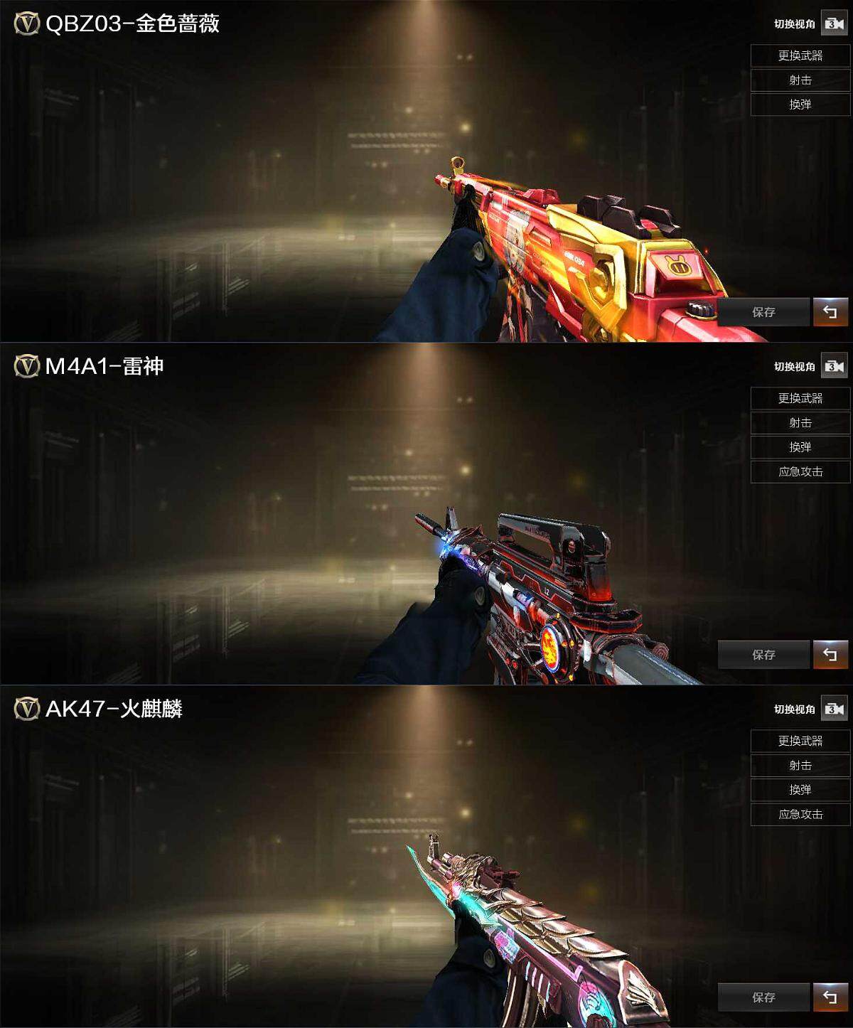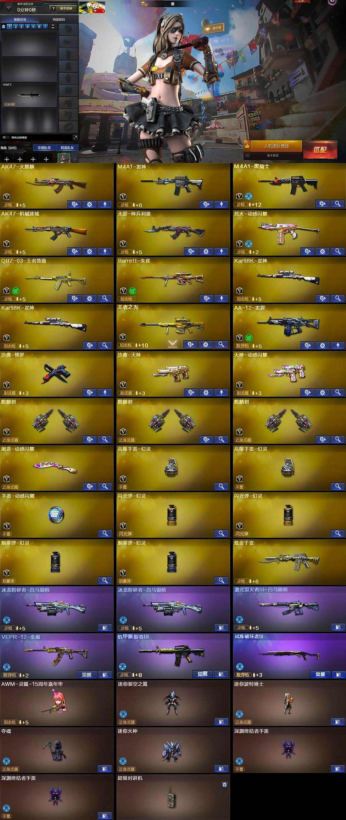 【英雄级武器】:AK47-火麒麟,M4A1-雷神,M4A1-黑骑士,AK47-机械迷城,无影-神兵利器,烈火-动感闪耀,QBZ-03-王者蔷薇-觉醒版,Barrett-朱雀,Kar98K-星神*2,王者之光-觉醒版,AA-12-雷霆,沙鹰-修罗,沙鹰-天神,天神-动感闪耀,麒麟刺*3,屠龙-动感闪耀,高爆手雷-幻灵*2,手雷-动感闪耀,闪光弹-幻灵*2,烟雾弹-幻灵*2