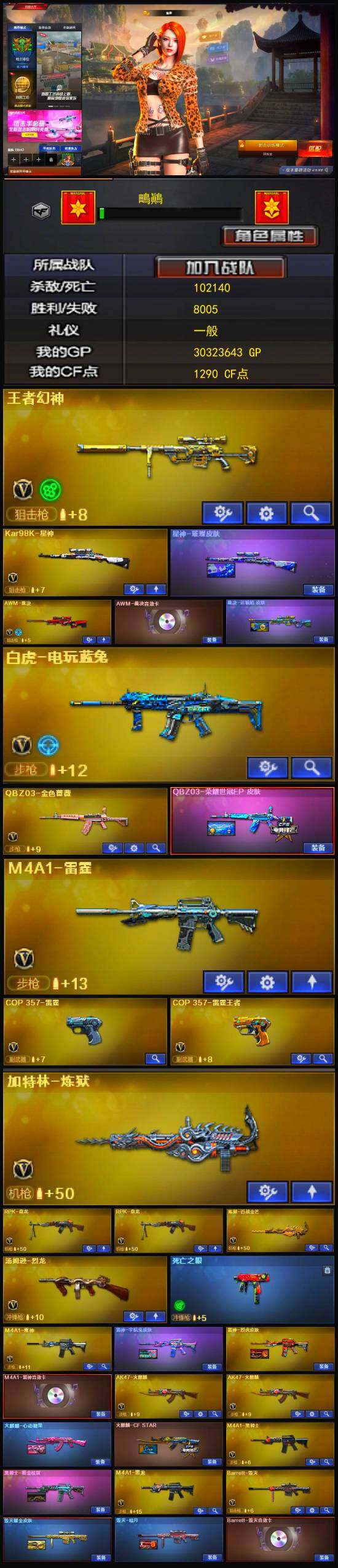 【热门武器】:QBZ03-金色蔷薇,死亡之眼,白虎-电玩蓝兔,Kar98K-星神,M4A1-黑骑士,汤姆逊-烈龙,RPK-盘龙*2,加特林-炼狱,沙鹰-修罗*2