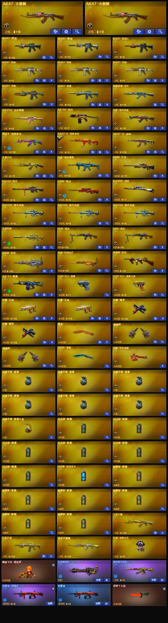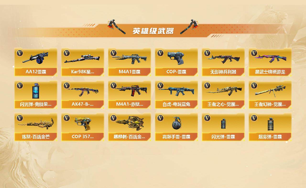 【英雄级武器】:AK47-火麒麟*2,M4A1-黑龙,M4A1-雷神,M4A1-黑骑士,M4A1-死神*3,M4A1-龙血,M4A1-雷霆,无影-神兵利器,黑武士-锦绣游龙,QBZ03-金色蔷薇,王者之心-觉醒版,AK47-B-战神,AK47-B-常胜将军,白虎-电玩蓝兔,AWM-天龙,Barrett-毁灭,AWM-裁决,Kar98K-星神,王者幻神-觉醒版,RPK-盘龙*2,加特林-炼狱,炼狱-百战金芒,汤姆逊-烈龙,AA-12-雷霆,沙鹰-修罗*2,沙鹰-天神*2,雷霆之契,COP 357-雷霆王者-觉醒版,屠龙,麒麟刺*2,麒麟刺-百战金芒,高爆手雷-雷霆*6,闪光弹-雷霆*6,闪光弹-竞技荣光,烟雾弹-雷霆*6,M4A1-赤狱骑士