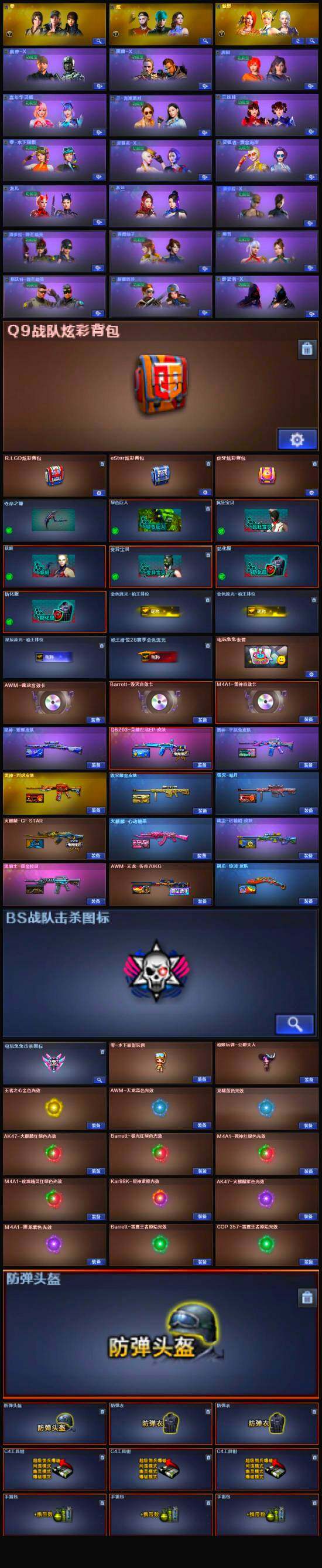 【道具】:Q9战队炫彩背包,R.LGD炫彩背包,云山科技背包,全能枪王背包,炫彩背包,百战金芒炫彩背包,虎牙炫彩背包,女皇终结者-魔龙之吻,救世主-黑桃战神,绿色巨人,变异宝贝,妖姬,夺命之镰,防化服*2,金色流光-枪王排位