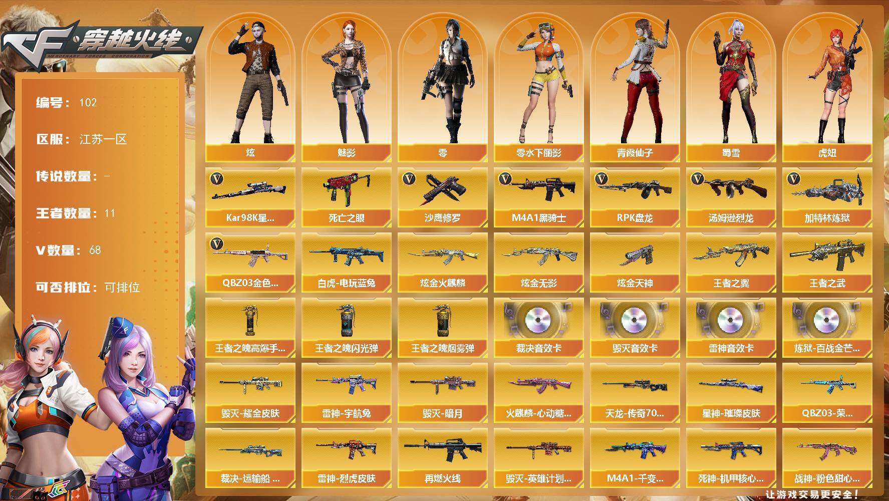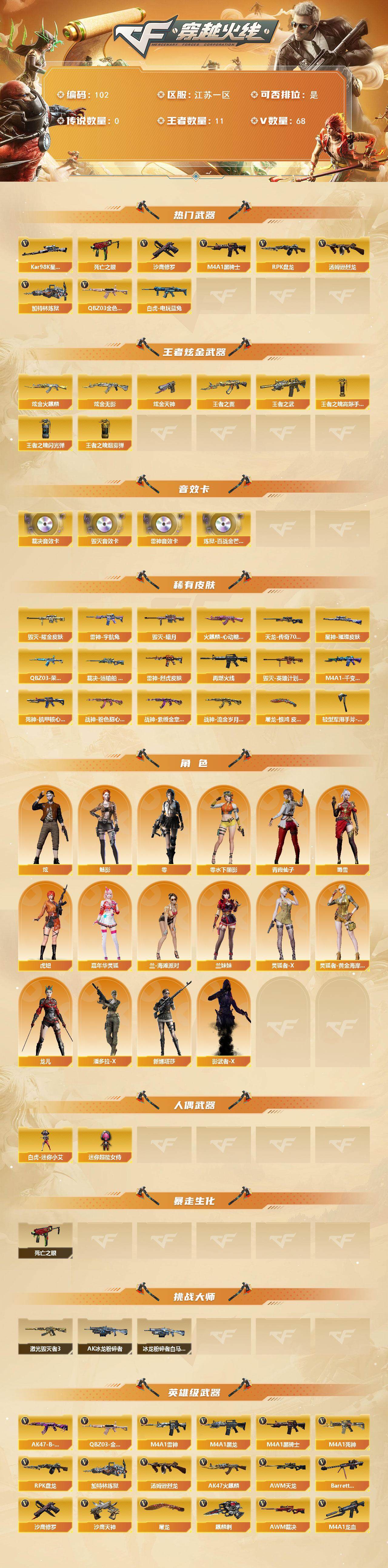 [13754272]江苏一区-68V-11王者-4炫金 【热门武器】:QBZ03-金色蔷薇,死亡之眼,白虎-电玩蓝兔,Kar98K-星神,M4A1-黑骑士,汤姆逊-烈龙,RPK-盘龙*2,加特林-炼狱,沙鹰-修罗*2 【王者炫金武器】:王者之翼,王者之武,炫金火麒麟,炫金无影,炫金天神*2,王者之魄高爆手雷,王者之魄闪光弹,王者之魄烟雾弹 【音效卡】:M4A1-雷神音效卡,Barrett-毁灭音效卡,AWM-裁决音效卡,炼狱-百战金芒-庆典舞曲音效卡 【皮肤】:QBZ03-荣耀世冠EP 皮肤,裁决-运输船 皮肤,星神-璀璨皮肤,雷神-烈虎皮肤,雷神-宇航兔皮肤,M4A1-再燃火线,火麒麟-心动糖果,毁灭-暗月,毁灭耀金皮肤,毁灭-英雄计划 皮肤,M4A1-千变-孔明皮肤,死神-机甲核心皮肤,战神-粉色甜心皮肤,战神-紫绶金章皮肤*2,战神-流金岁月皮肤*2,AWM-天龙-传奇70KG,屠龙-惊鸿 皮肤,轻型军用手斧-再燃火线 【角色】:零,魅影,炫,虎妞,嘉年华灵狐,兰-海滩派对,兰妹妹,零-水下丽影,灵狐者-X,灵狐者-黄金海岸,龙儿,潘多拉-X,青霞仙子,蜀雪,新娜塔莎,影武者-X 【人偶武器】:白虎-迷你小艾,迷你超能女侍 【暴走生化】:死亡之眼 【挑战大师】:AK47-冰龙粉碎者,冰龙粉碎者-白马银枪,激光毁灭者III 【英雄级武器】:AK47-火麒麟*2,M4A1-黑龙,M4A1-雷神,M4A1-黑骑士,M4A1-死神*3,M4A1-龙血,M4A1-雷霆,无影-神兵利器,黑武士-锦绣游龙,QBZ03-金色蔷薇,王者之心-觉醒版,AK47-B-战神,AK47-B-常胜将军,白虎-电玩蓝兔,AWM-天龙,Barrett-毁灭,AWM-裁决,Kar98K-星神,王者幻神-觉醒版,RPK-盘龙*2,加特林-炼狱,炼狱-百战金芒,汤姆逊-烈龙,AA-12-雷霆,沙鹰-修罗*2,沙鹰-天神*2,雷霆之契,COP 357-雷霆王者-觉醒版,屠龙,麒麟刺*2,麒麟刺-百战金芒,高爆手雷-雷霆*6,闪光弹-雷霆*6,闪光弹-竞技荣光,烟雾弹-雷霆*6,M4A1-赤狱骑士 【道具】:Q9战队炫彩背包,R.LGD炫彩背包,云山科技背包,全能枪王背包,炫彩背包,百战金芒炫彩背包,虎牙炫彩背包,女皇终结者-魔龙之吻,救世主-黑桃战神,绿色巨人,变异宝贝,妖姬,夺命之镰,防化服*2,金色流光-枪王排位