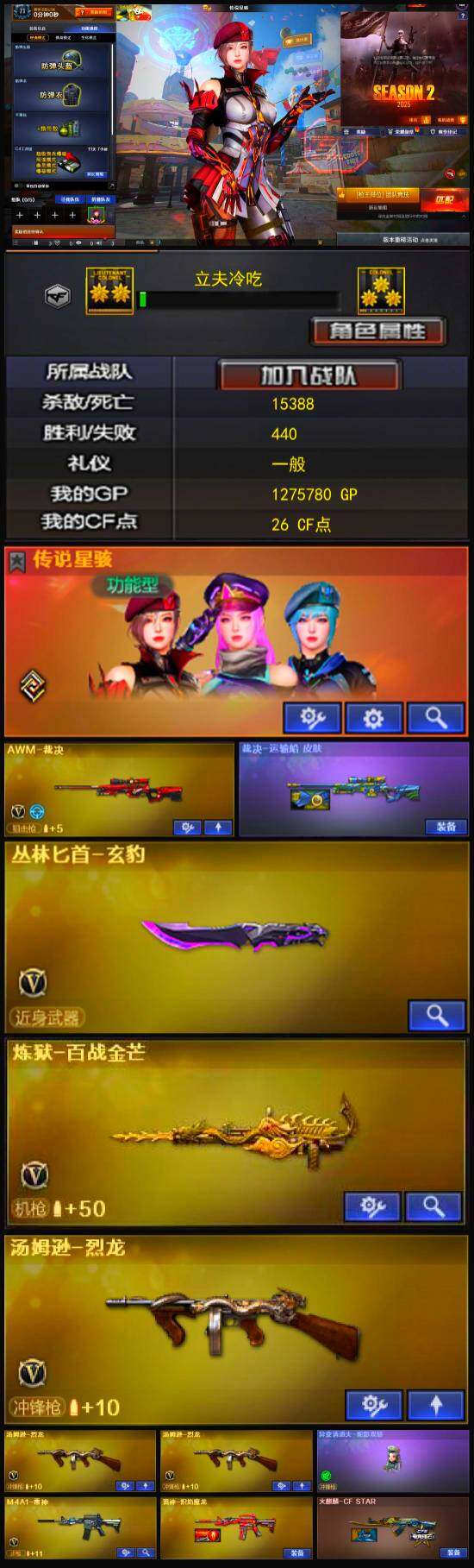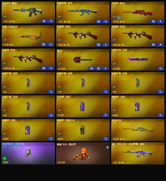 【英雄级武器】:M4A1-雷神,AWM-裁决,炼狱-百战金芒,汤姆逊-烈龙*3,擎天,麒麟刺-百战金芒,丛林匕首-玄豹,高爆手雷-玄豹*4,闪光弹-玄豹,烟雾弹-玄豹*2,M4A1-赤狱骑士,M4A1-苍鸣雷神