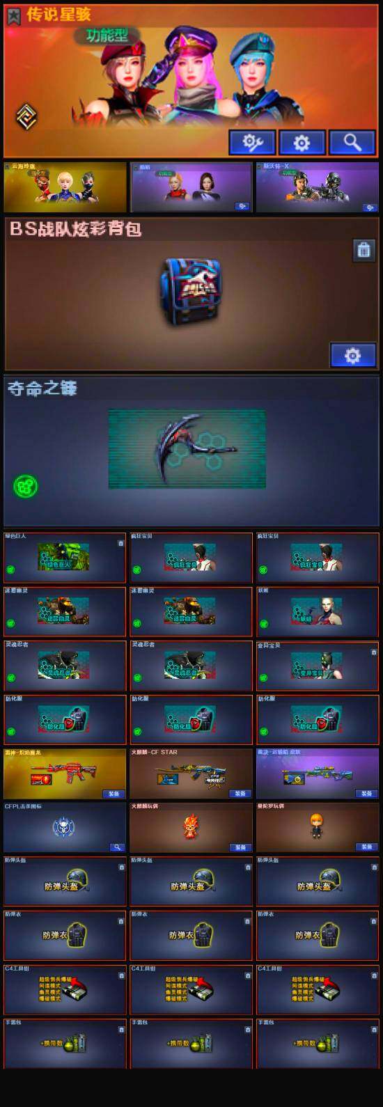 【道具】:BS战队炫彩背包,云山科技背包,亚洲杯纪念炫彩背包,女皇终结者-背包,百战金芒炫彩背包,女皇终结者-魔龙之吻,救世主-黑桃战神,黄金生化钩,绿色巨人,灵魂忍者*2,变异宝贝,妖姬,迷雾幽灵*2,夺命之镰,防化服*3,语音特效-盛典烟火,萌萌小葵表情,防弹头盔*3,防弹衣*3,C4工具钳*3,手雷包*3