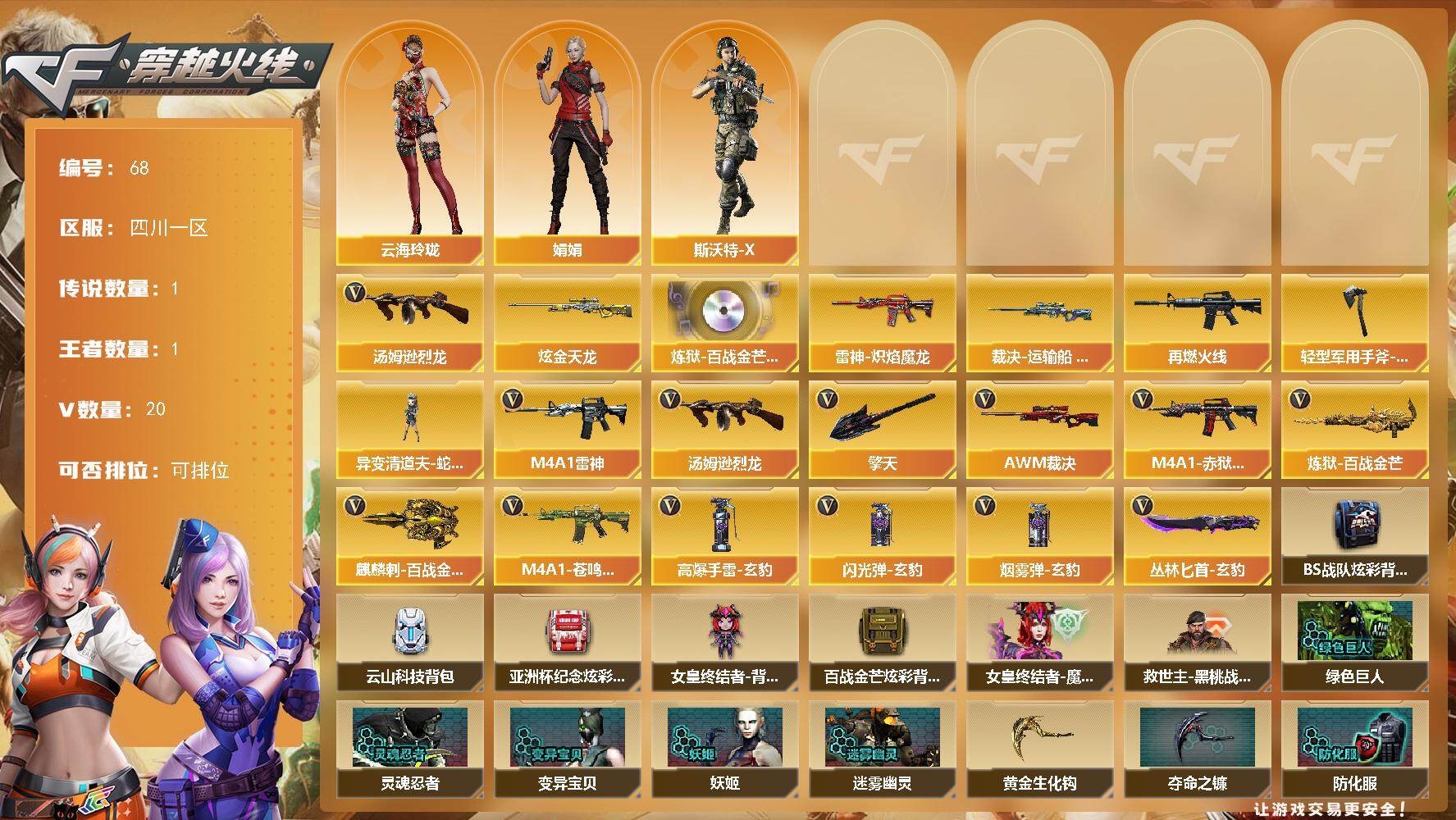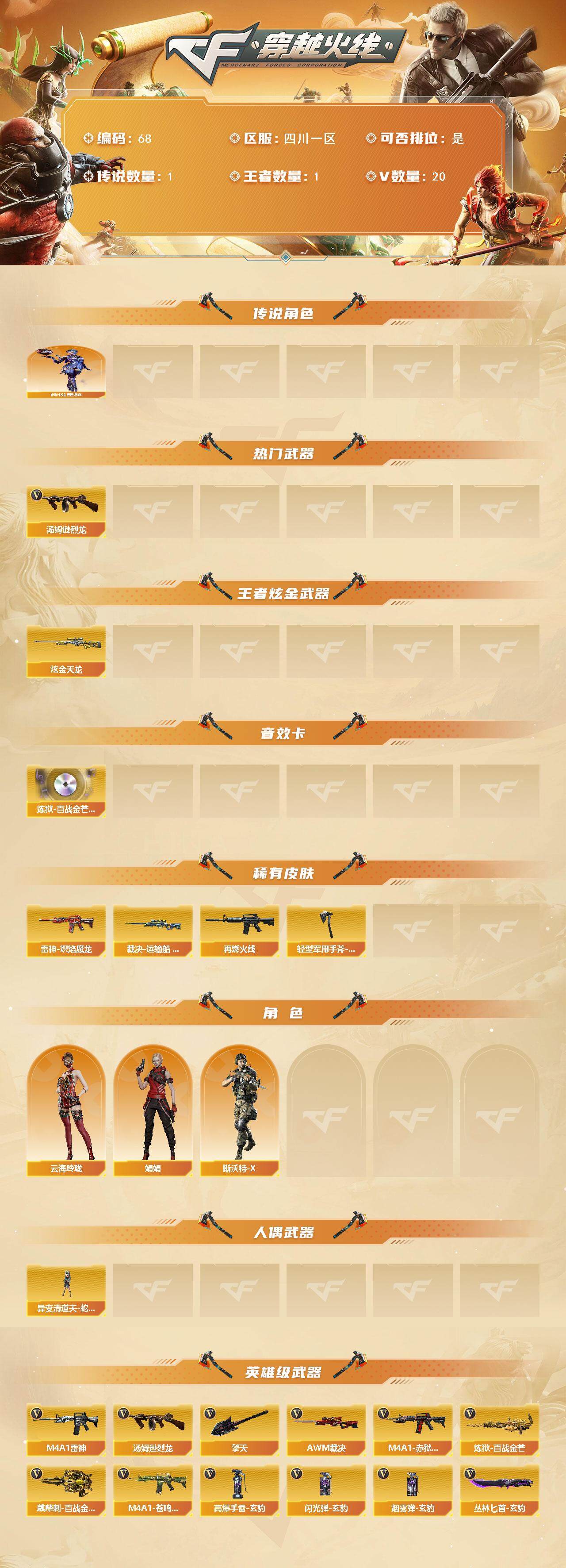 [13661251]四川一区-20V-1王者-1炫金 【传说角色】:传说星骇 【热门武器】:汤姆逊-烈龙*3 【王者炫金武器】:炫金天龙 【音效卡】:炼狱-百战金芒-庆典舞曲音效卡 【皮肤】:裁决-运输船 皮肤,雷神-炽焰魔龙,M4A1-再燃火线,轻型军用手斧-再燃火线 【角色】:云海玲珑,娟娟,斯沃特-X 【人偶武器】:异变清道夫-蛇影双骄 【英雄级武器】:M4A1-雷神,AWM-裁决,炼狱-百战金芒,汤姆逊-烈龙*3,擎天,麒麟刺-百战金芒,丛林匕首-玄豹,高爆手雷-玄豹*4,闪光弹-玄豹,烟雾弹-玄豹*2,M4A1-赤狱骑士,M4A1-苍鸣雷神 【道具】:BS战队炫彩背包,云山科技背包,亚洲杯纪念炫彩背包,女皇终结者-背包,百战金芒炫彩背包,女皇终结者-魔龙之吻,救世主-黑桃战神,黄金生化钩,绿色巨人,灵魂忍者*2,变异宝贝,妖姬,迷雾幽灵*2,夺命之镰,防化服*3,语音特效-盛典烟火,萌萌小葵表情,防弹头盔*3,防弹衣*3,C4工具钳*3,手雷包*3 【特殊枪械】:3烈龙
