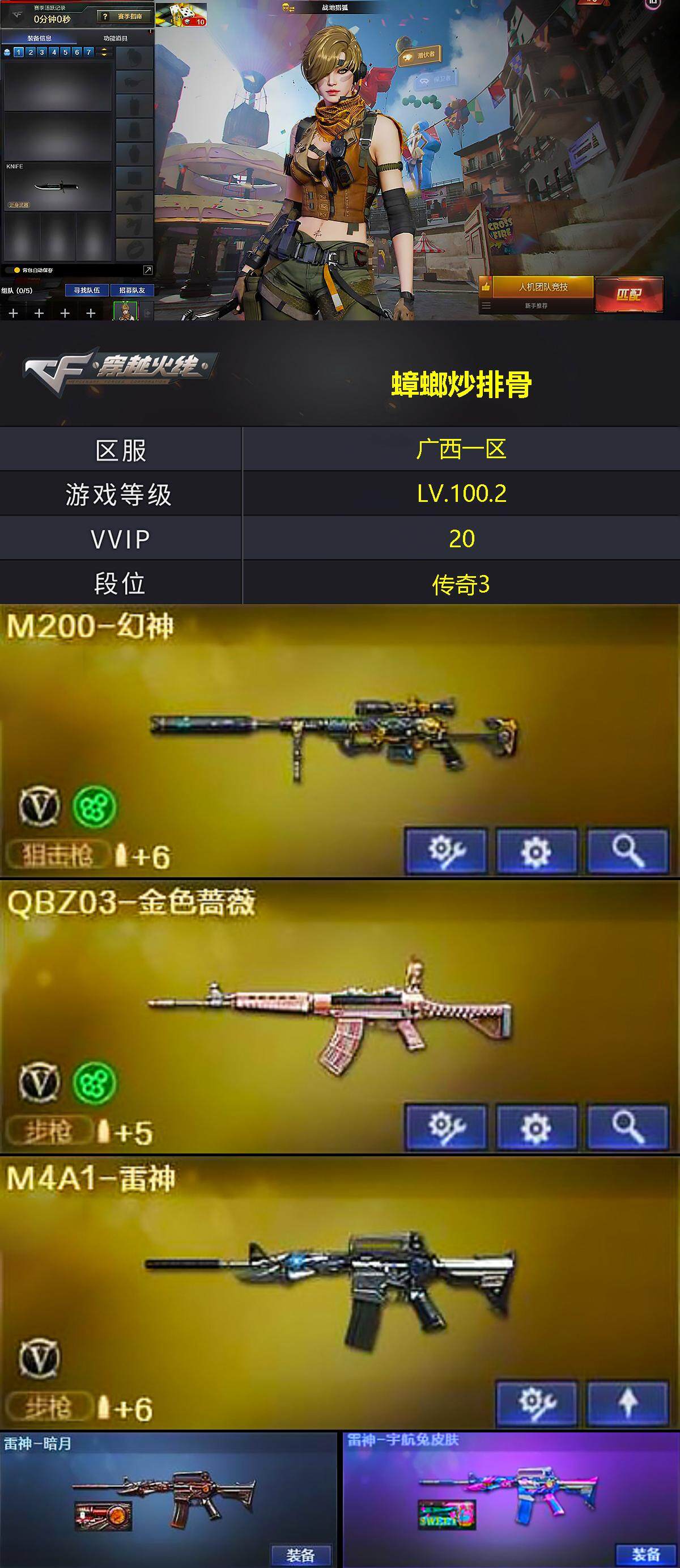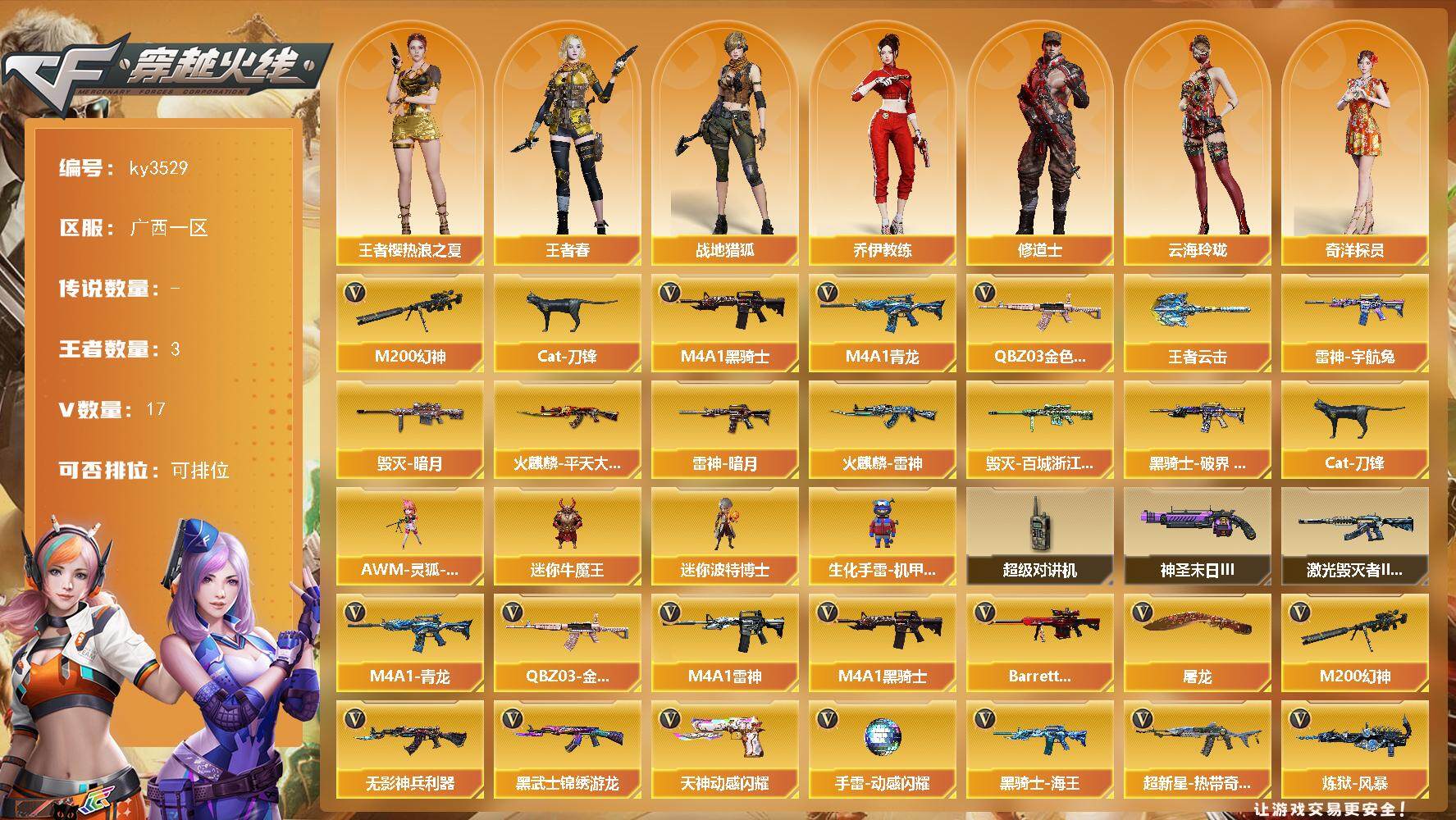 [13756092]广西一区-17V-3王者-0炫金 【热门武器】:QBZ03-金色蔷薇,M4A1-青龙,M200-幻神,Cat-刀锋,M4A1-黑骑士 【王者炫金武器】:王者云击 【皮肤】:雷神-暗月,雷神-宇航兔皮肤,火麒麟-雷神,火麒麟-平天大圣,毁灭-暗月,毁灭-百城浙江 皮肤,黑骑士-破界 皮肤 【角色】:战地猎狐,王者樱-热浪之夏,王者春,奇洋探员,乔伊教练,修道士,云海玲珑,北极狐-X,电竞少女,飞虎队-X,风暴女,嘉年华灵狐,娟娟,兰-新年限定,猎狐者-追月,0号玩家,灵狐者-X,灵狐者-七夕宝贝,龙儿,麻雀,潘多拉-X,潘多拉-甜心教官,赛斯-X,斯沃特-X,维纳斯,夜玫瑰-宠粉,影武者-X,游珑儿 【人偶武器】:AWM-灵狐-15周年嘉年华,Cat-刀锋,迷你牛魔王,迷你波特博士,生化手雷-机甲核心*2 【暴走生化】:超级对讲机 【挑战大师】:激光毁灭者III-白马银枪*2,神圣爆裂者-末日III 【英雄级武器】:M4A1-雷神,M4A1-黑骑士,M4A1-青龙,无影-神兵利器,黑武士-锦绣游龙,超新星-热带奇洋,QBZ03-金色蔷薇,黑骑士-海王,Barrett-极光,M200-幻神,炼狱-风暴,天神-动感闪耀,屠龙,龙啸-热带奇洋,手雷-动感闪耀,手雷-热带奇洋,闪光弹-云龙,M4A1-赤狱骑士,AWM-昌龙 【道具】:CFS限定背包,云海游龙炫彩背包,奇洋探员-海龟背包,热带奇洋炫彩背包,超级背包,救世主-黑桃战神,绿色巨人,灵魂忍者,变异宝贝,妖姬,迷雾幽灵,生化弹匣,夺命之镰,防化服,金色流光-枪王排位*2,星辰流光-枪王排位,流光-再燃火线,枪王排位28赛季金色流光,枪王排位29赛季金色流光,热带奇洋表情*2,动感闪耀表情,云海游龙表情,EP战队名片,EP战队喷图,EP战队击杀图标,C4-黑曜,防弹头盔*2,防弹衣*2,C4工具钳*2,手雷包*2 【特殊枪械】:1黑骑士