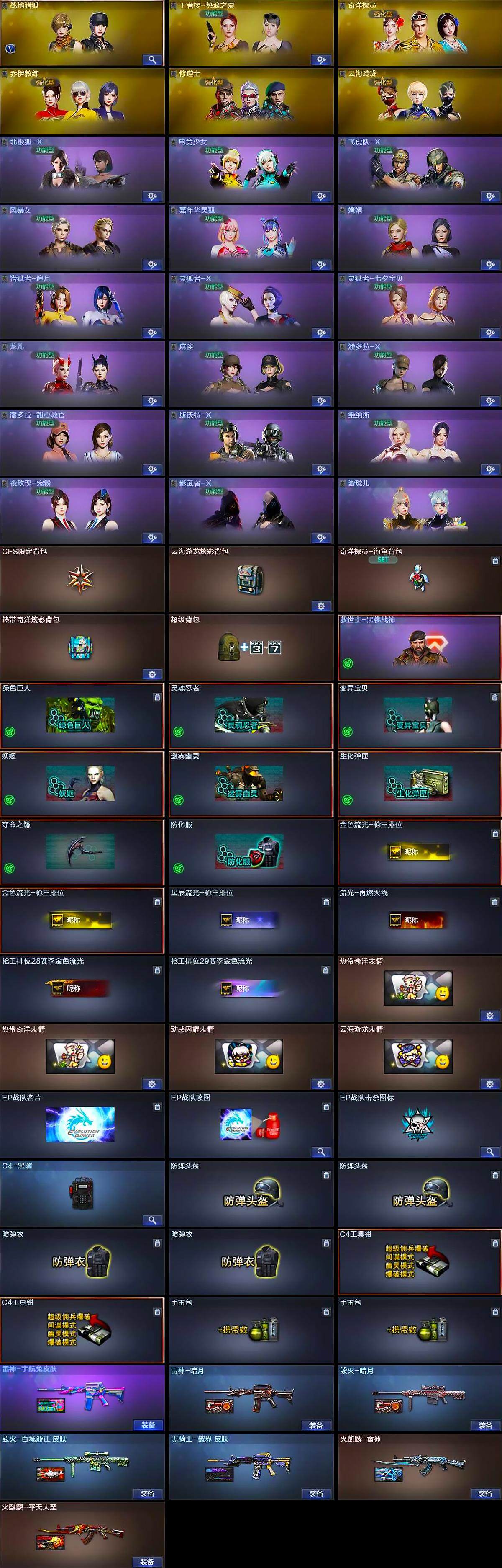【道具】:CFS限定背包,云海游龙炫彩背包,奇洋探员-海龟背包,热带奇洋炫彩背包,超级背包,救世主-黑桃战神,绿色巨人,灵魂忍者,变异宝贝,妖姬,迷雾幽灵,生化弹匣,夺命之镰,防化服,金色流光-枪王排位*2,星辰流光-枪王排位,流光-再燃火线,枪王排位28赛季金色流光,枪王排位29赛季金色流光,热带奇洋表情*2,动感闪耀表情,云海游龙表情,EP战队名片,EP战队喷图,EP战队击杀图标,C4-黑曜,防弹头盔*2,防弹衣*2,C4工具钳*2,手雷包*2